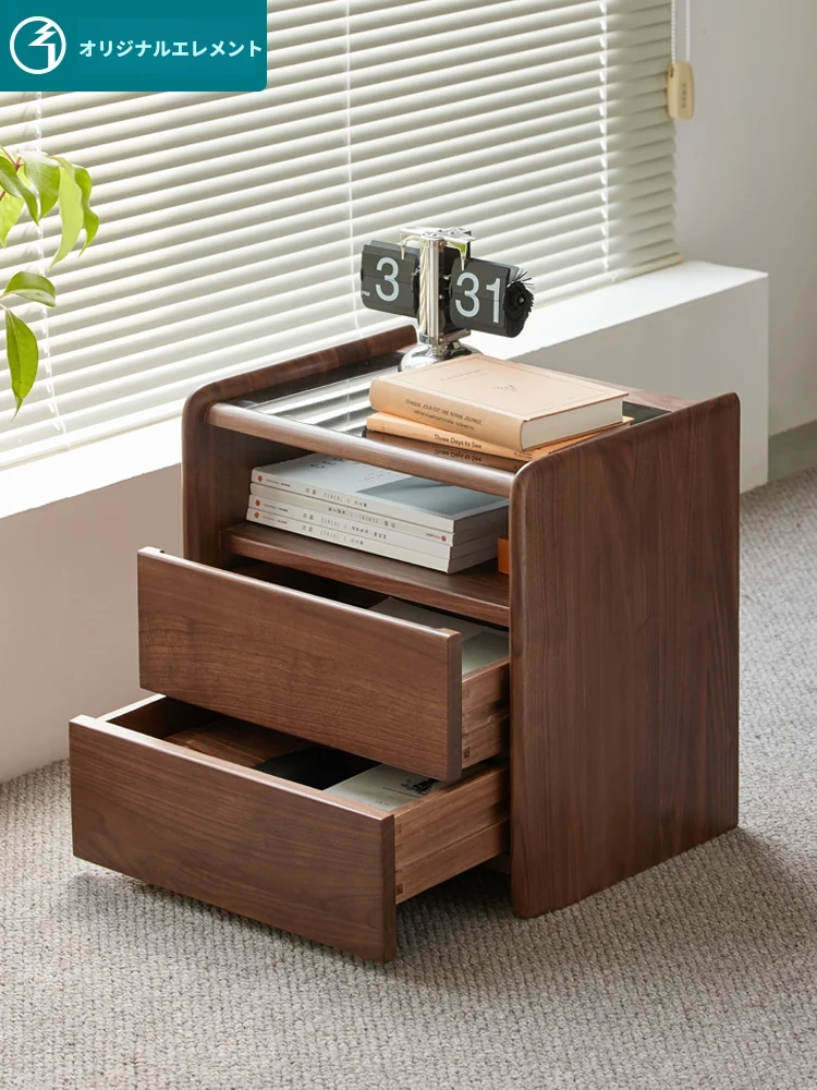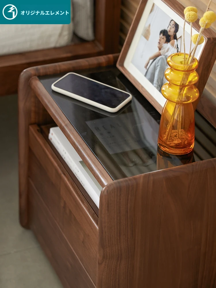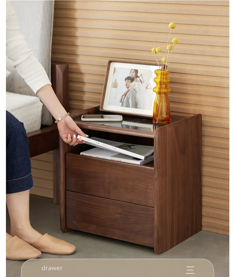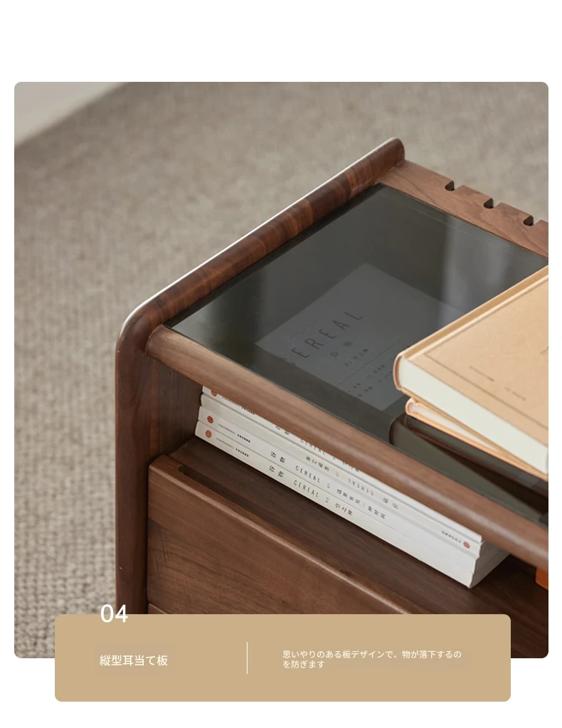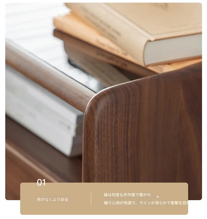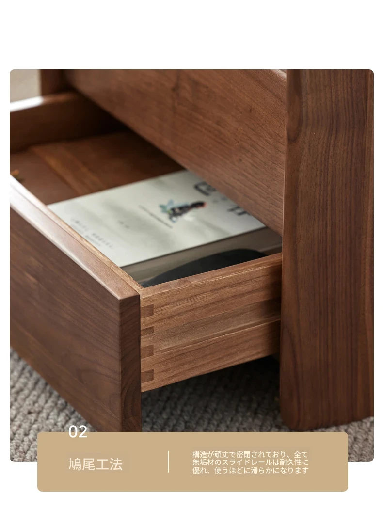 原材料へのこだわり! 北欧スタイルの本無垢材ナイトテーブル - 高級ブラックウォールナット製、収納力抜群のフロアタイプ・寝室用キャビネット!