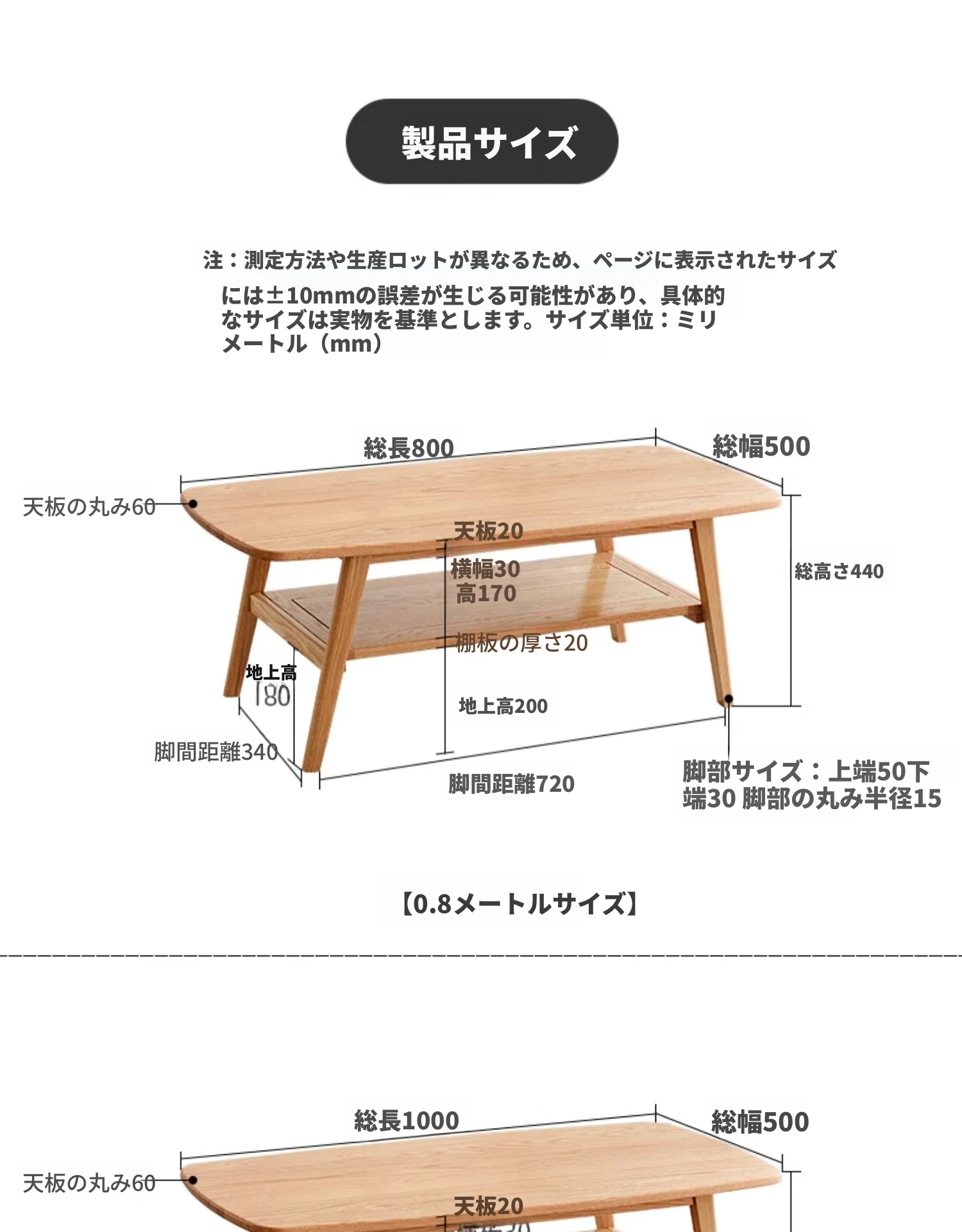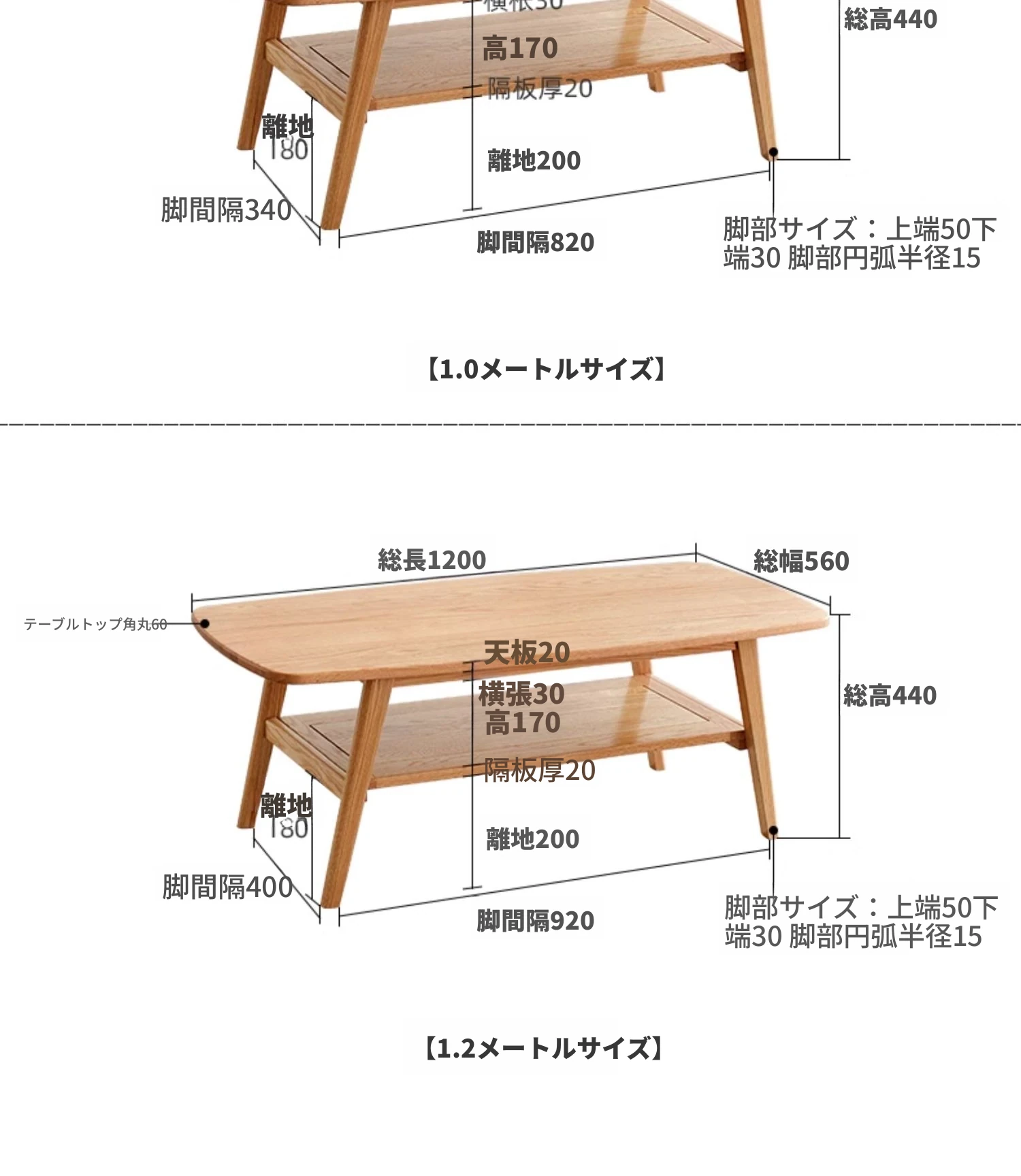 原木色 1メートル二層ティーテーブル 1000*500*440mm