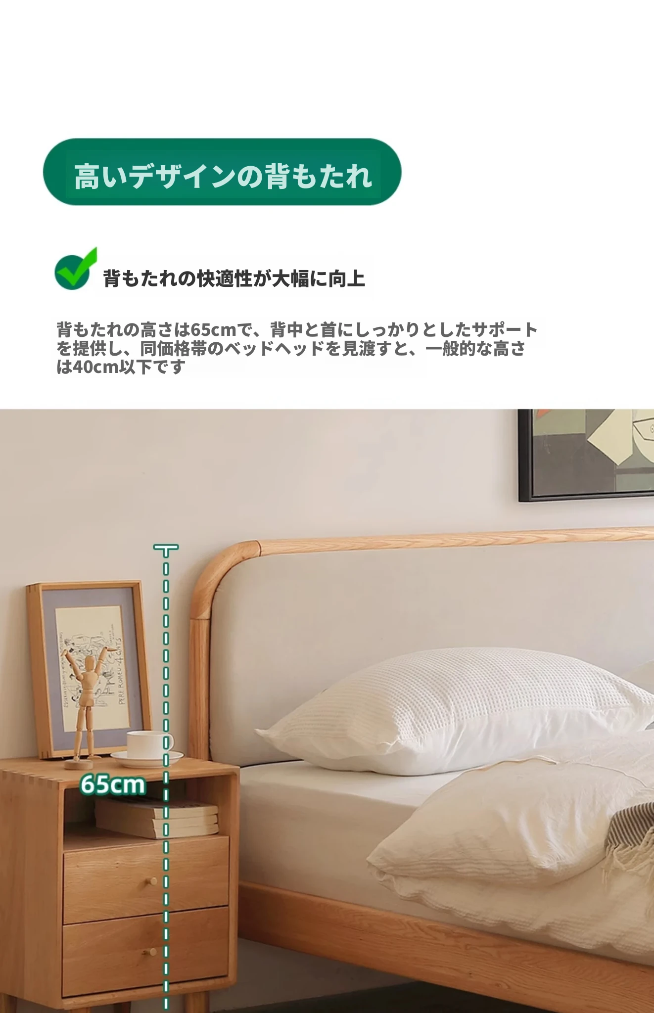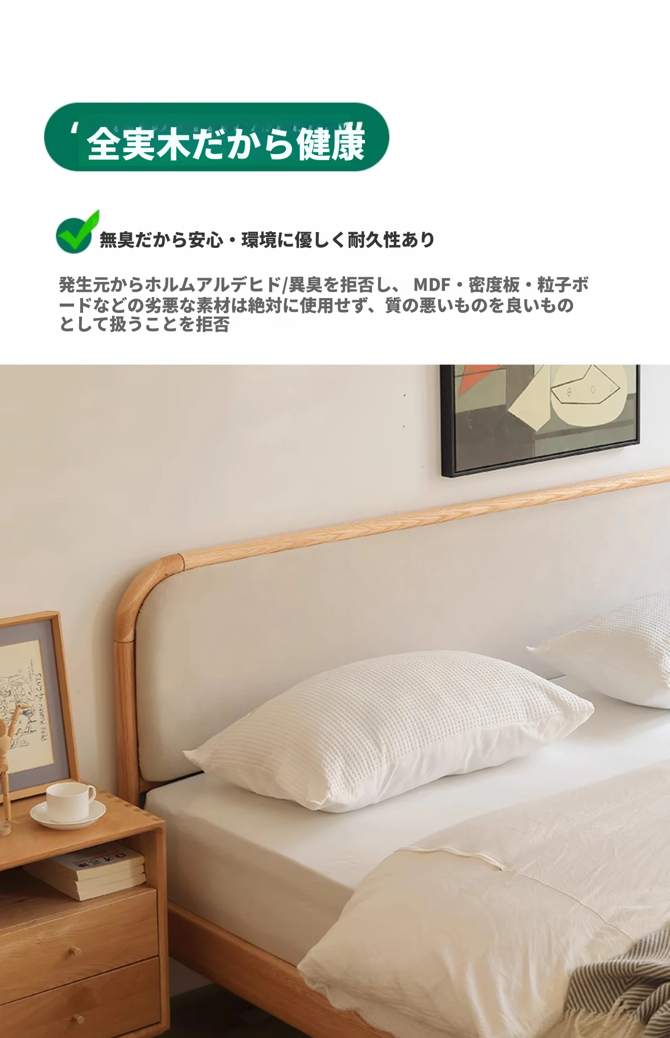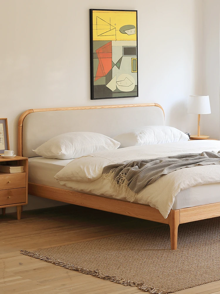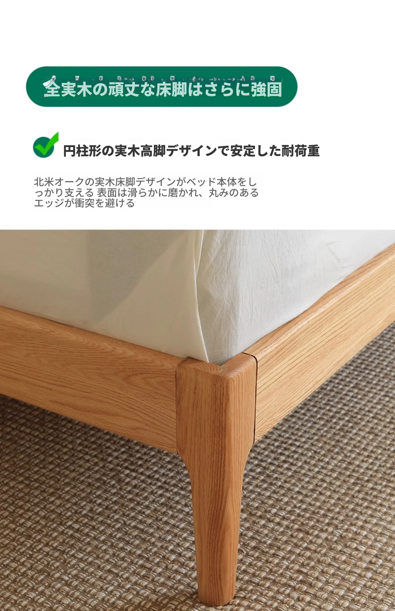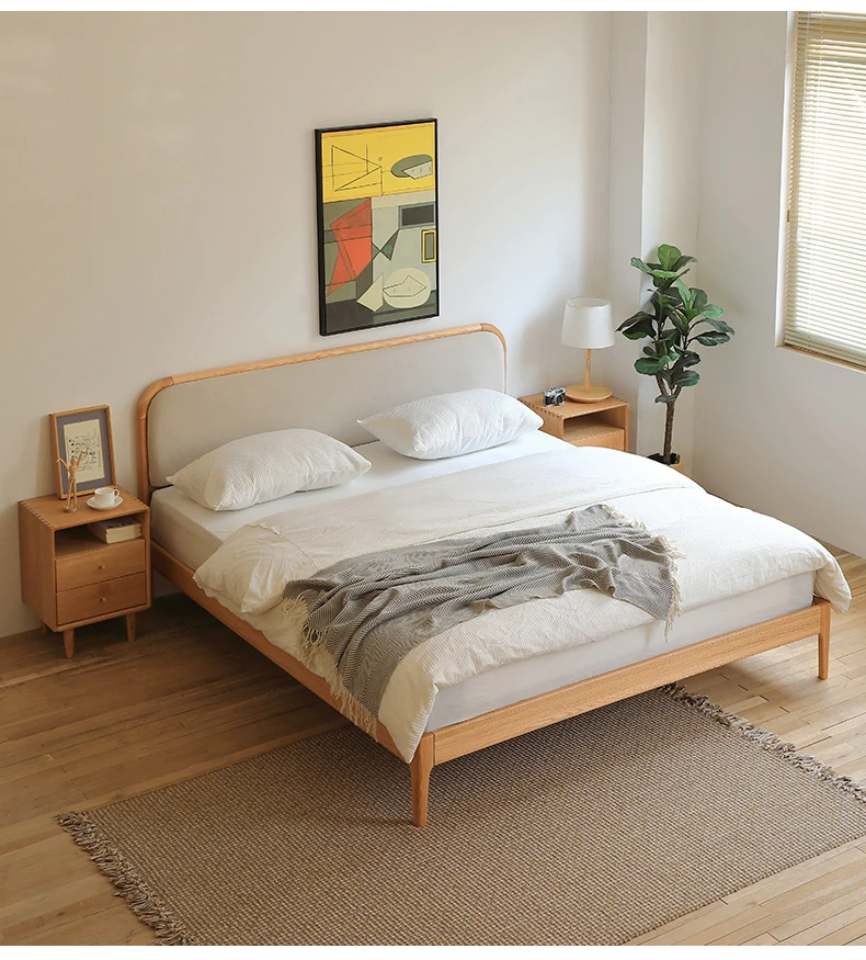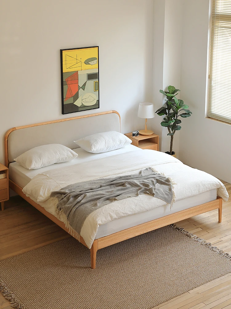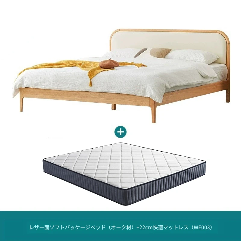北欧風の無垢材ベッド - 1.5m・1.8mのダブルサイズ、大人のためのソフトパッケージベッド。シンプルでスタイリッシュなデザイン、ナチュラルオーク素材を使用した日本の原木スタイルの寝室用ベッド。心地よい眠りを提供します!