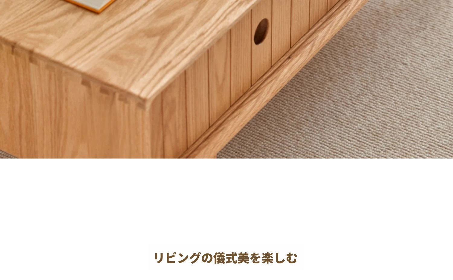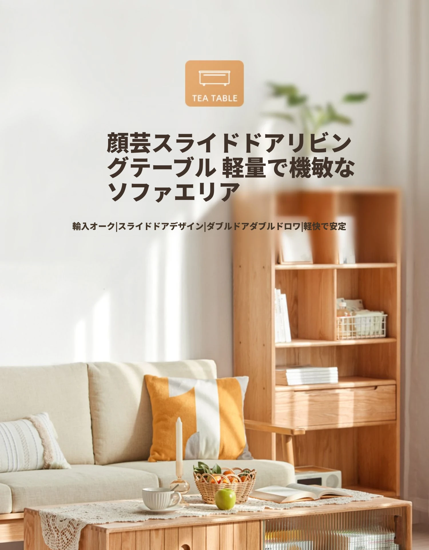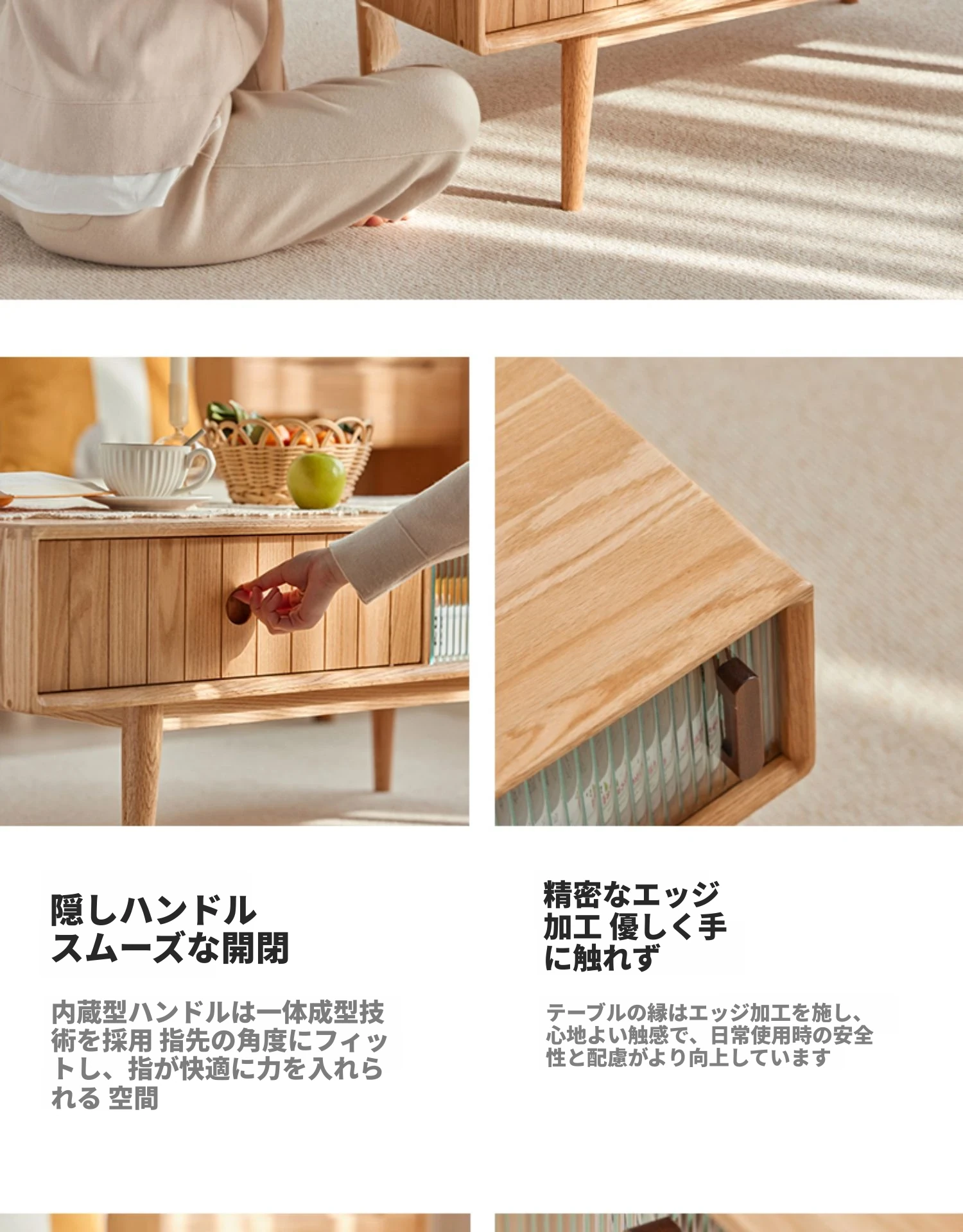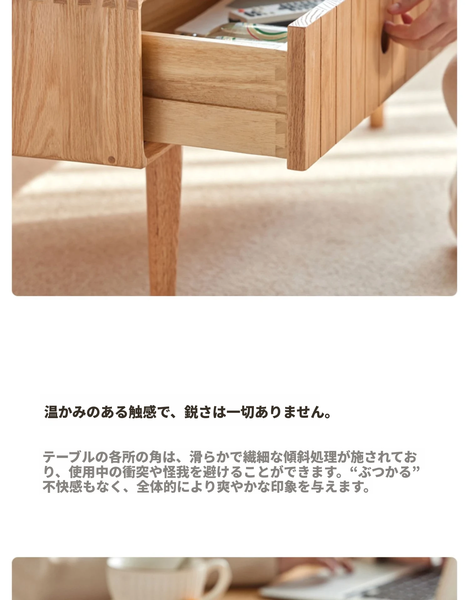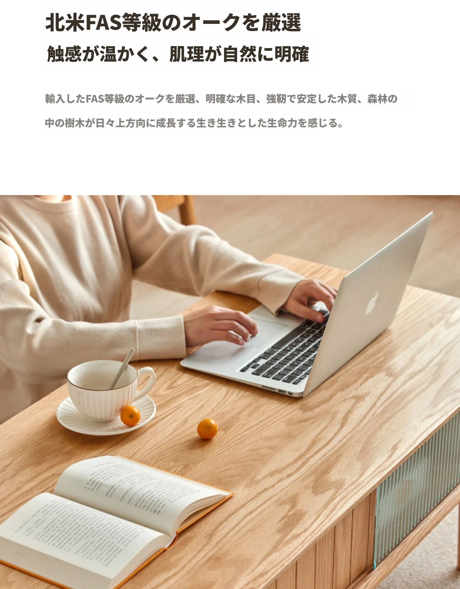オリジナルエッセンス全木製コーヒーテーブル - 北欧オーク材使用のモダン&シンプルなデザイン。小さなお部屋にもぴったりな、温もりある天然木製のティーテーブルで、居心地の良いリビングを演出。