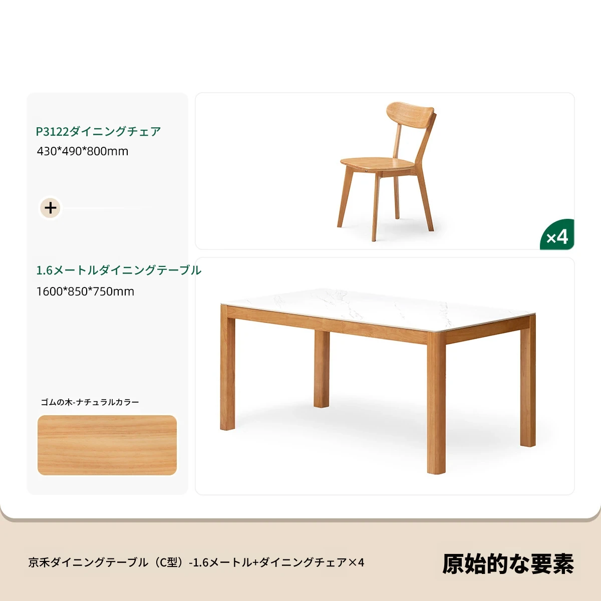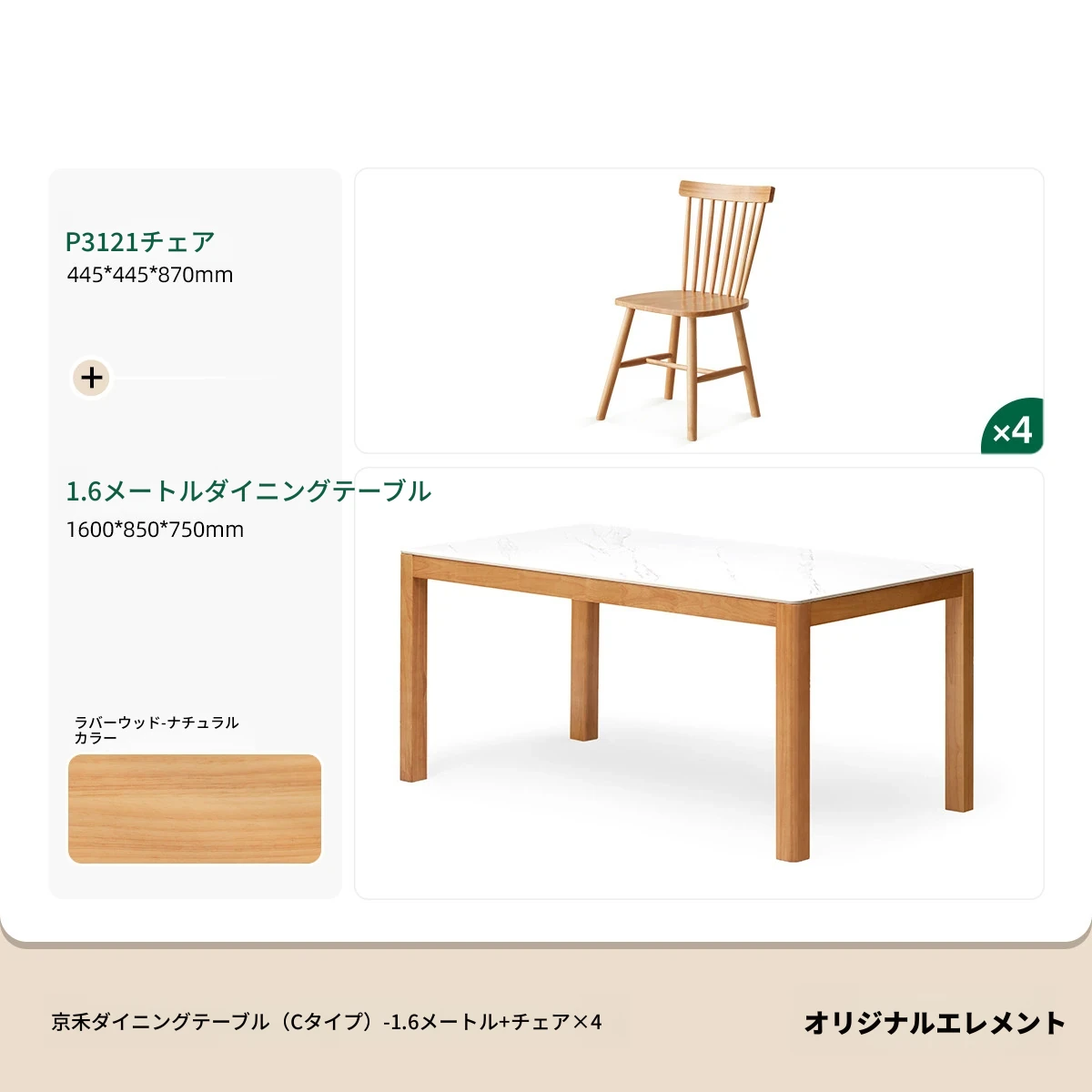 【ゴムの木-ナチュラルカラー】1.6メートルテーブル4脚セット(P3121)