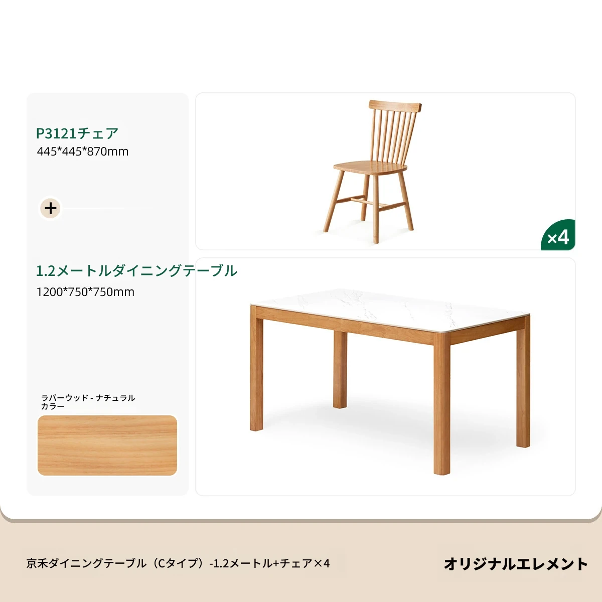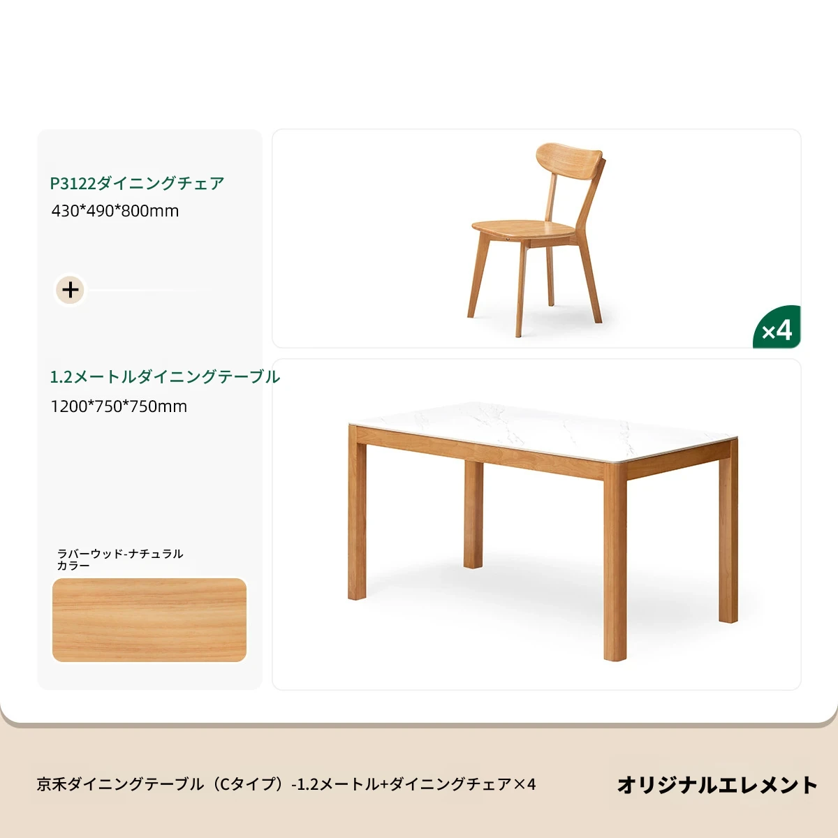 【ゴムの木-ナチュラルカラー】1.2メートルテーブル4脚セット(P3122)