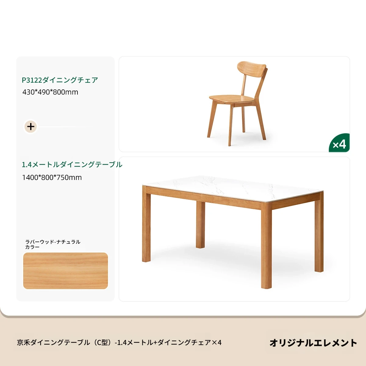 【ゴムの木-ナチュラルカラー】1.4メートルテーブル4脚セット(P3122)