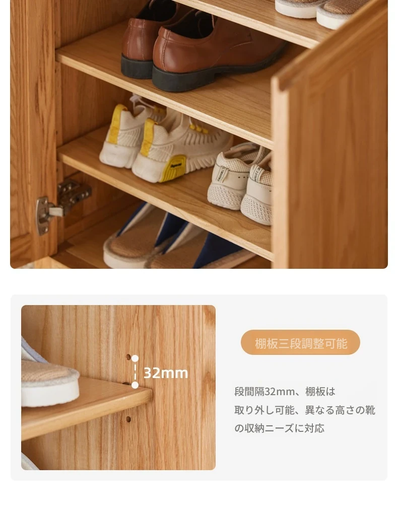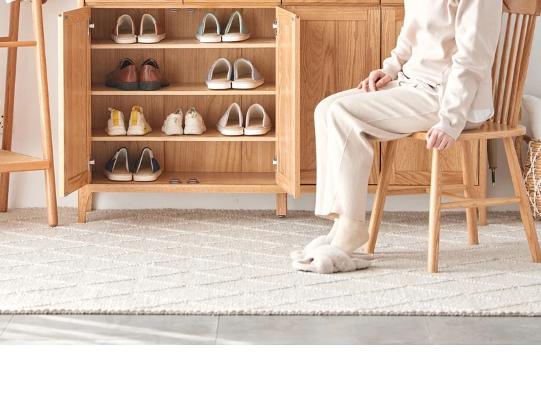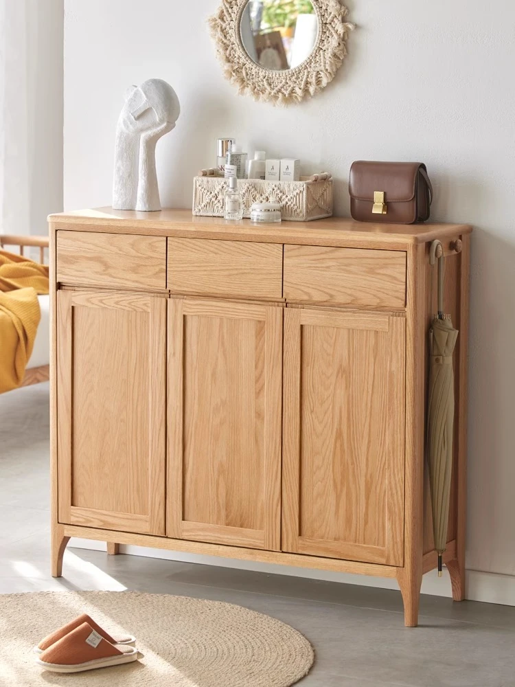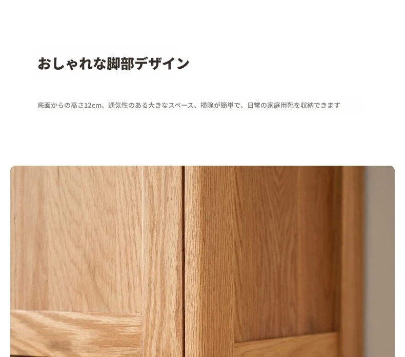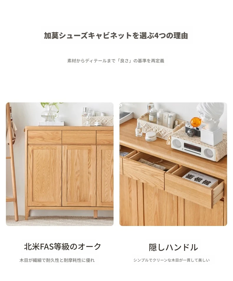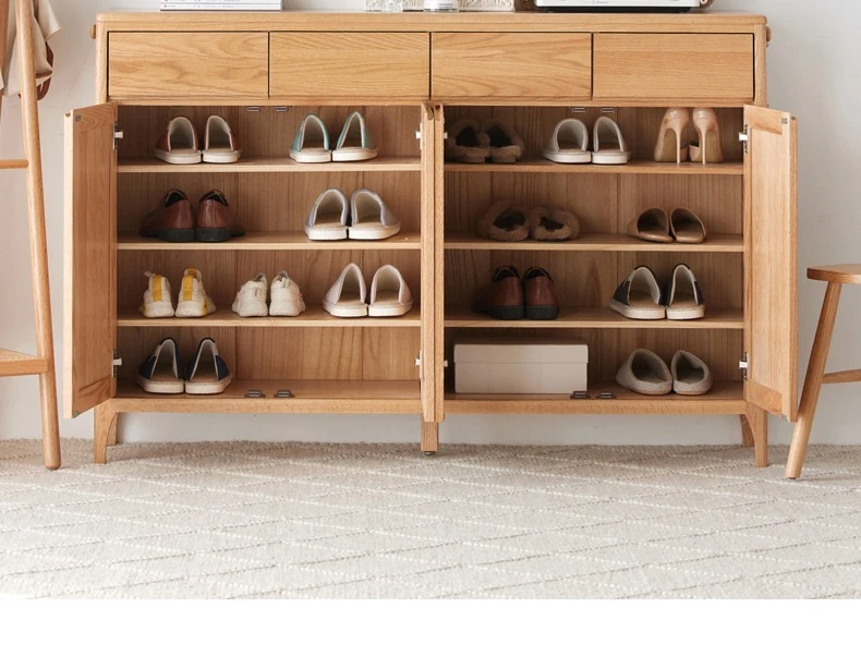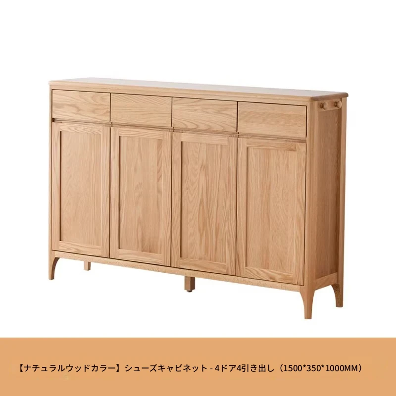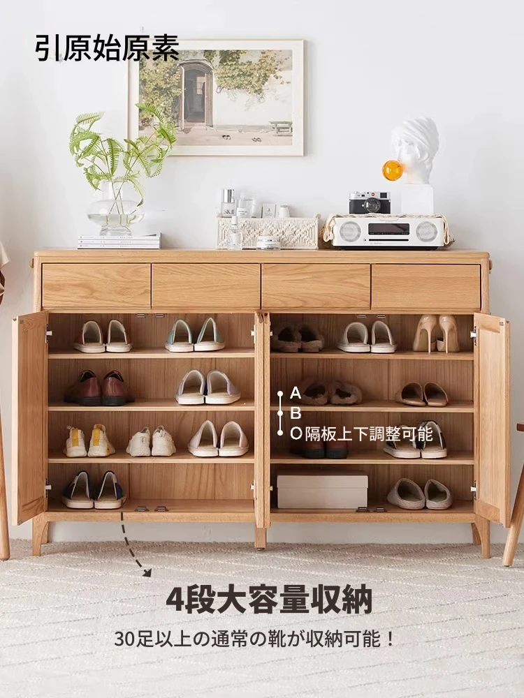 全無垢材の北欧風シューズキャビネット - 4ドアのオーク収納庫、シンプルでスタイリッシュな和風原木玄関収納、家庭にぴったり!