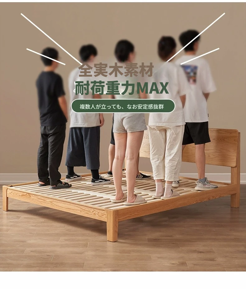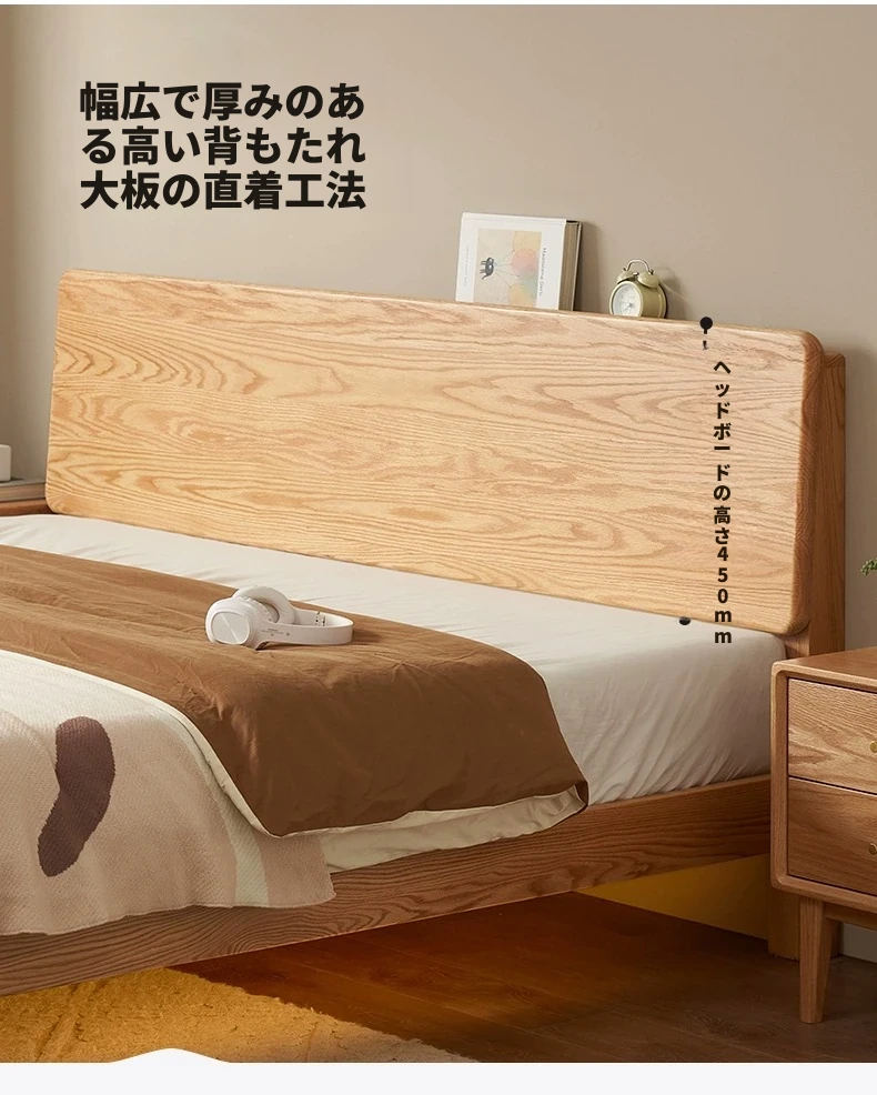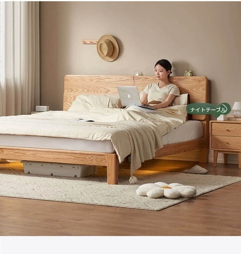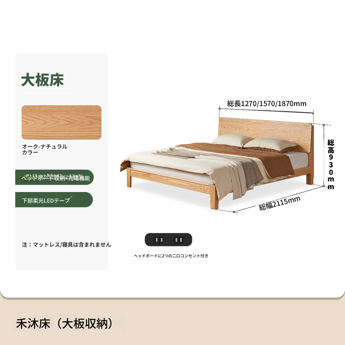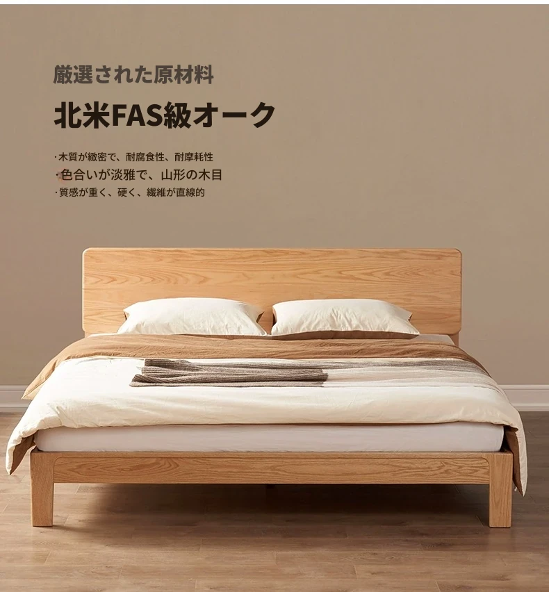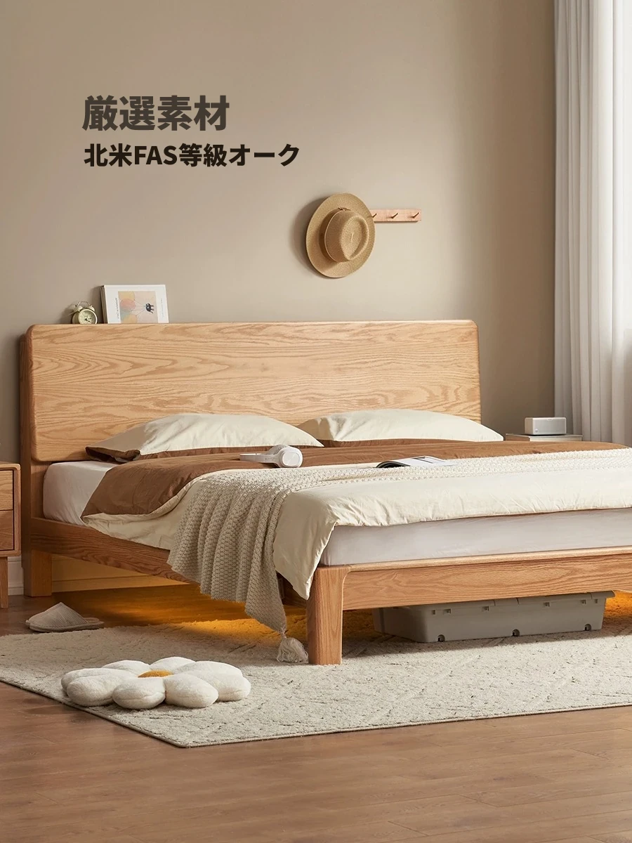 オリジナルナチュラル北欧スタイル無垢材オークダブルベッド 1.8m 幅 広々とした主寝室用フルウッドベッド - 自然の風合いを楽しむ上質な寝空間を提供!