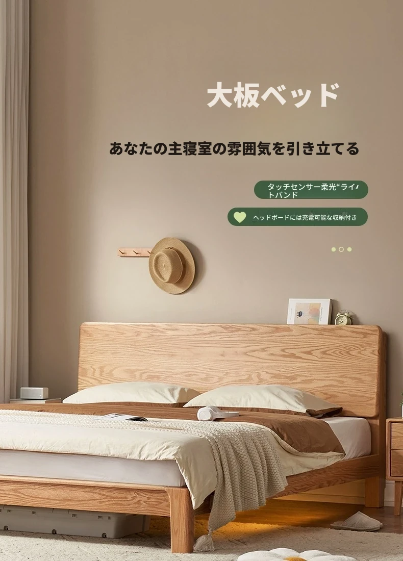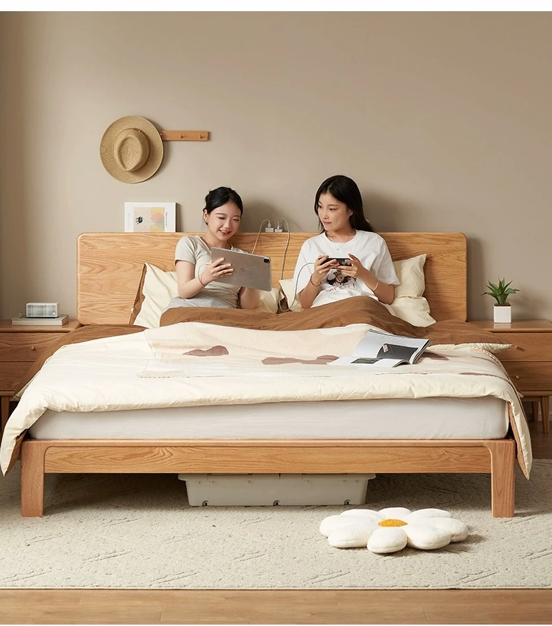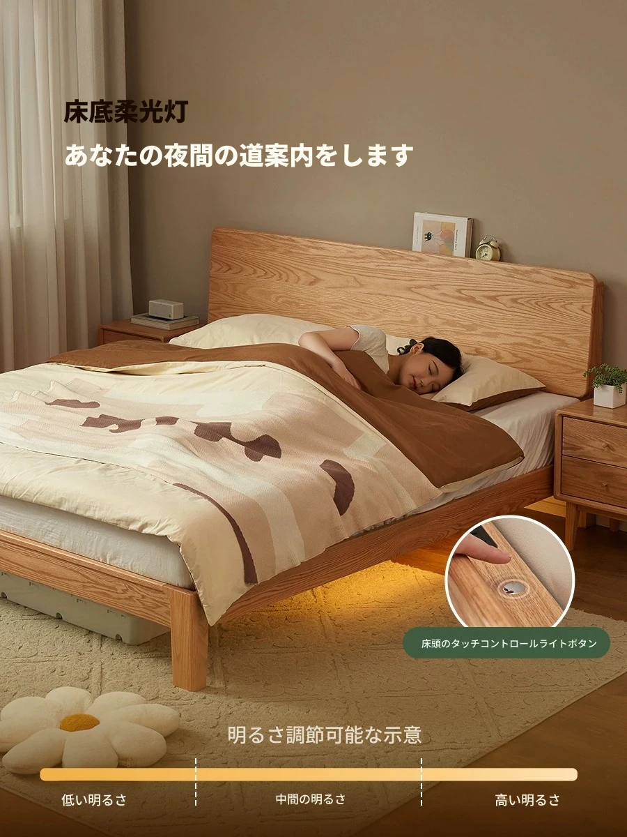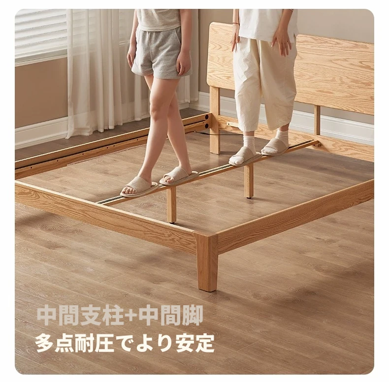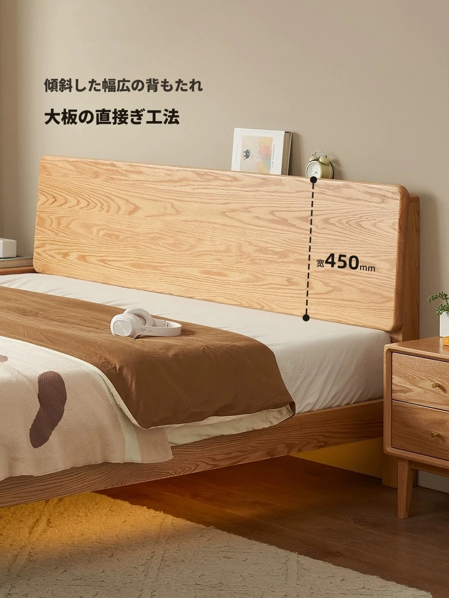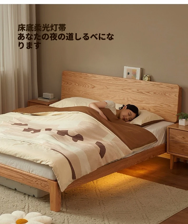 オリジナルナチュラル北欧スタイル無垢材オークダブルベッド 1.8m 幅 広々とした主寝室用フルウッドベッド - 自然の風合いを楽しむ上質な寝空間を提供!