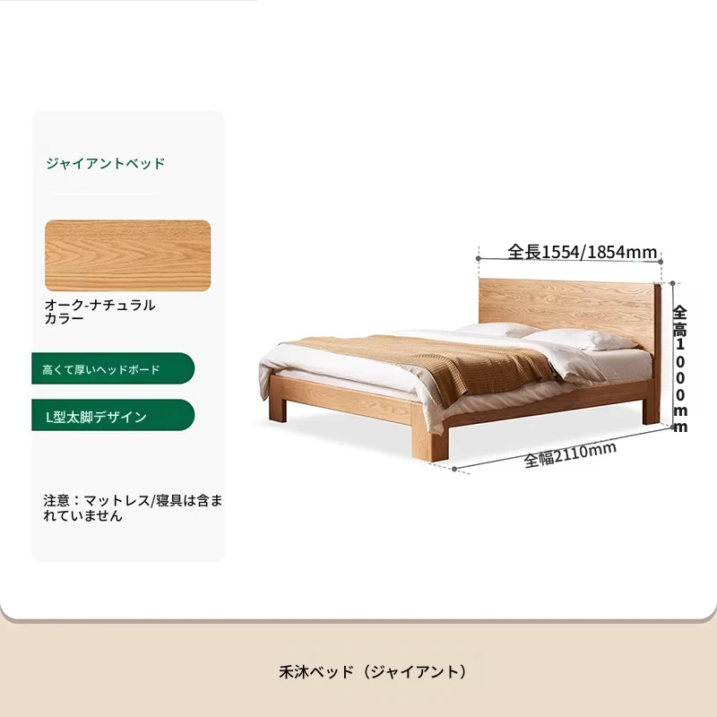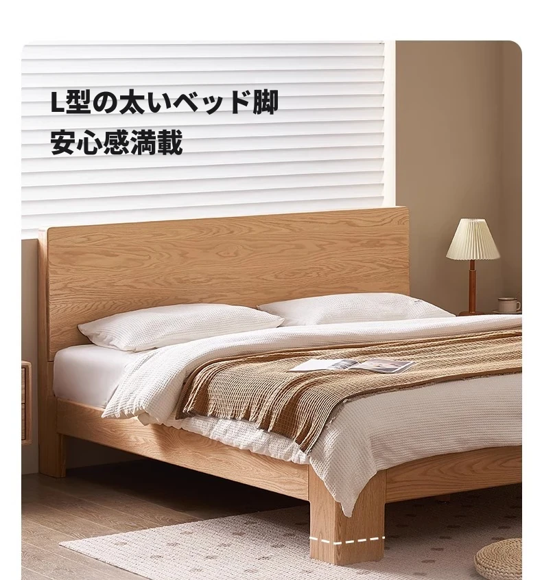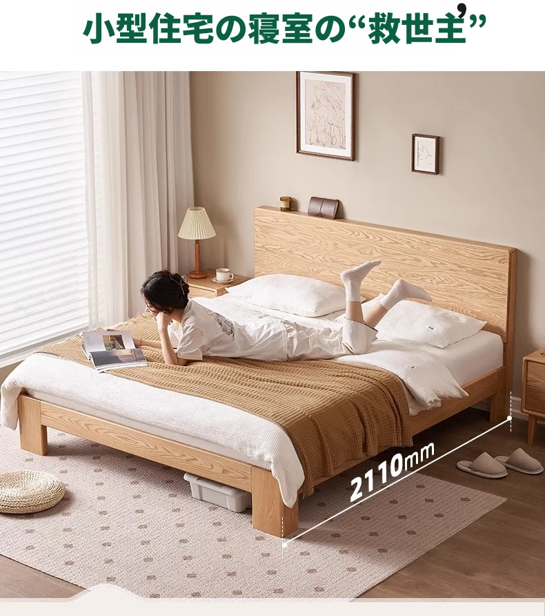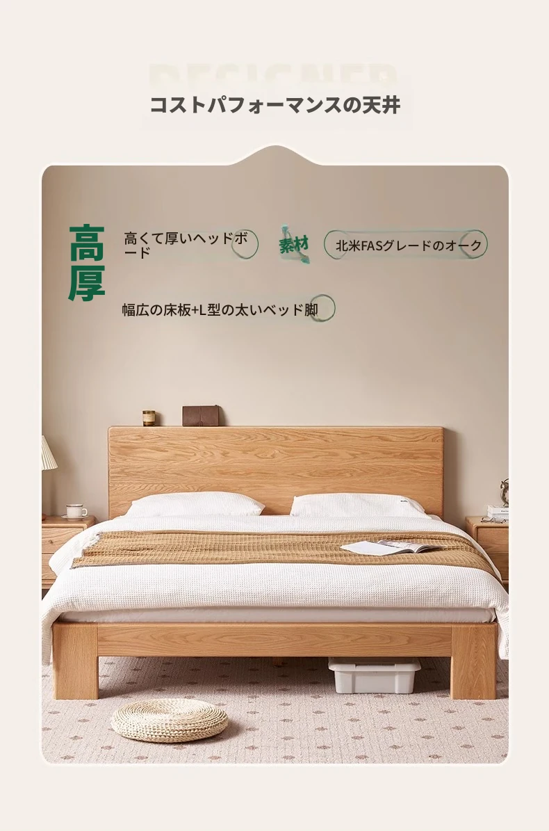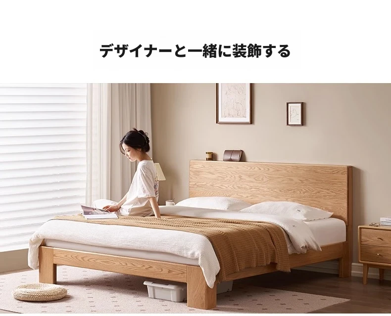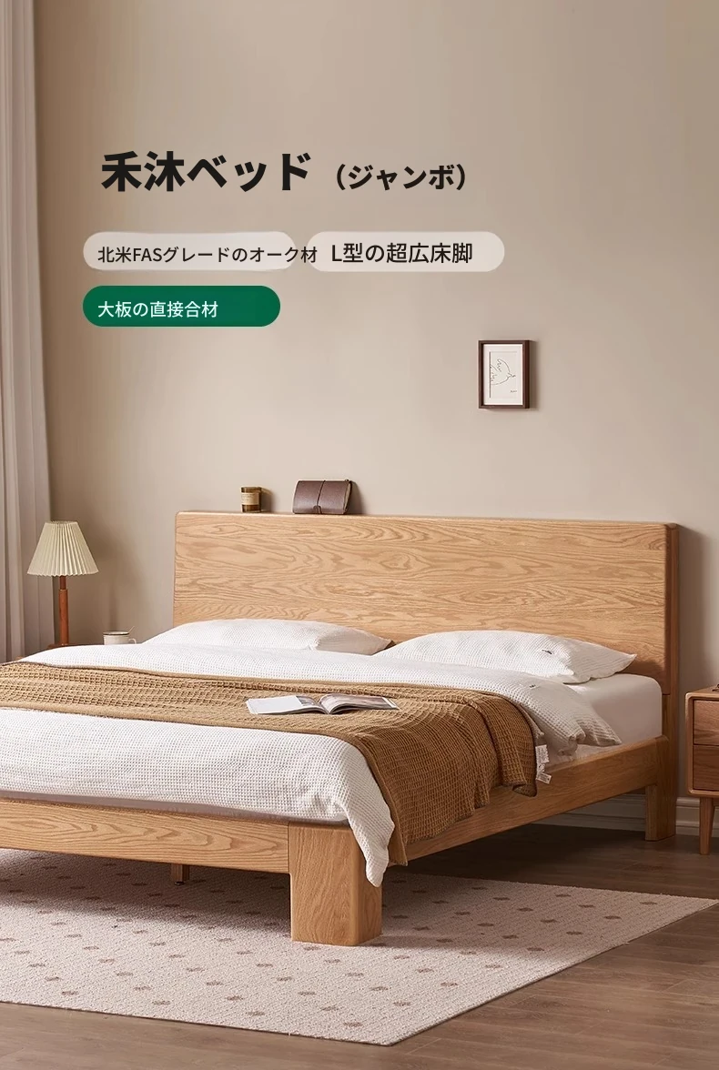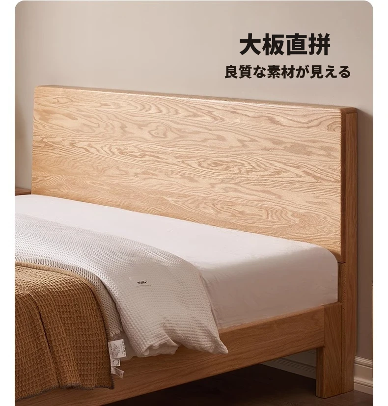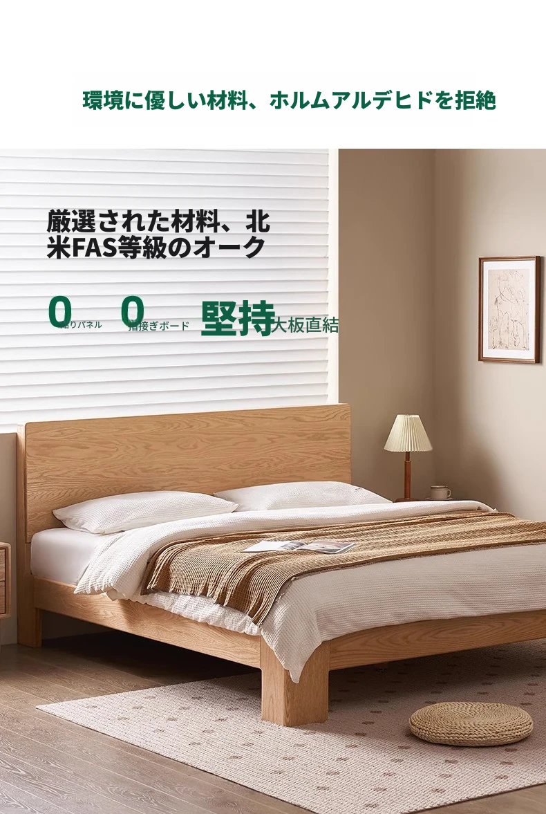 原木の魅力!モダンミニマリストオーク無垢材ベッド【1.8m】【主寝室用】【ダブルベッド】家庭にぴったりのスタイリッシュなデザイン、ゆったり寝られる大板ベッドで快適な眠りを実現!