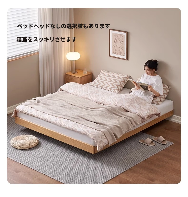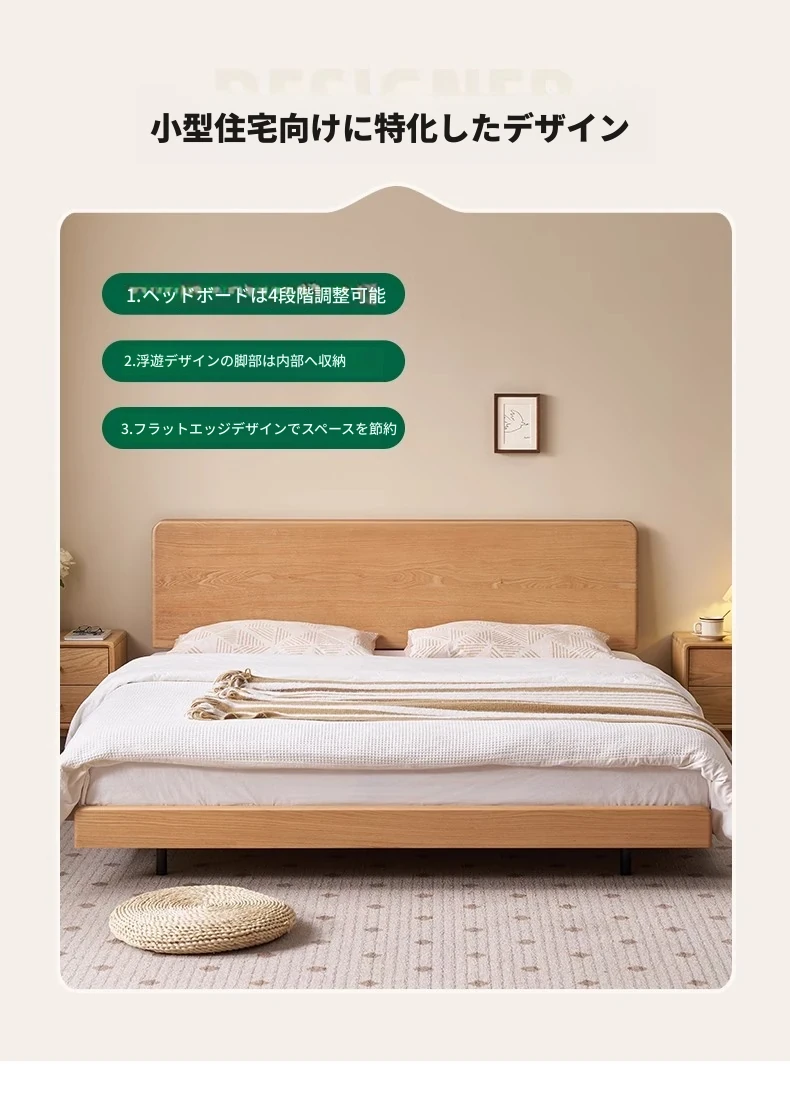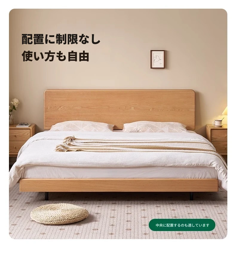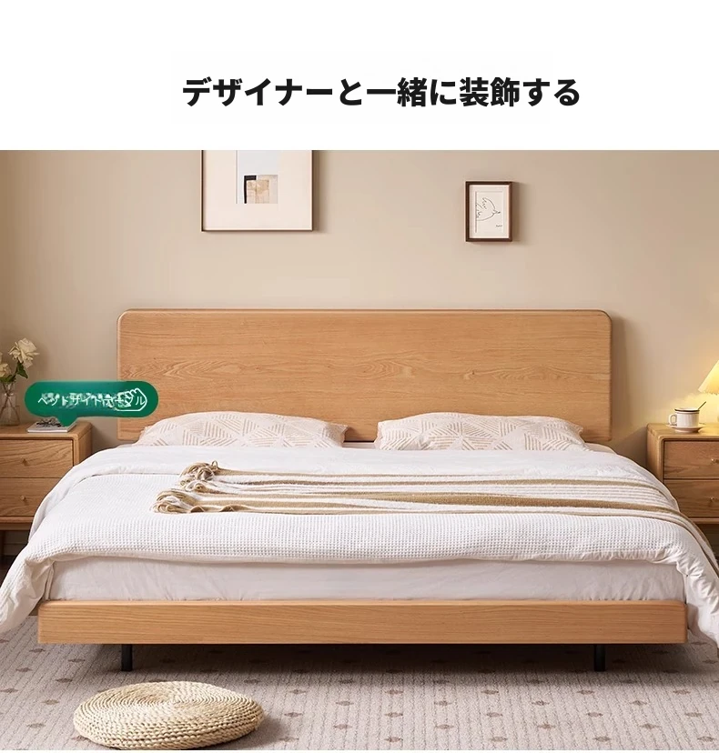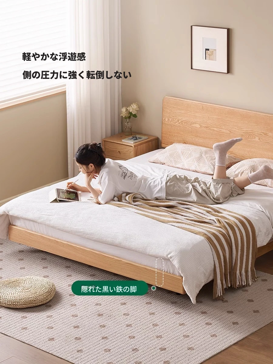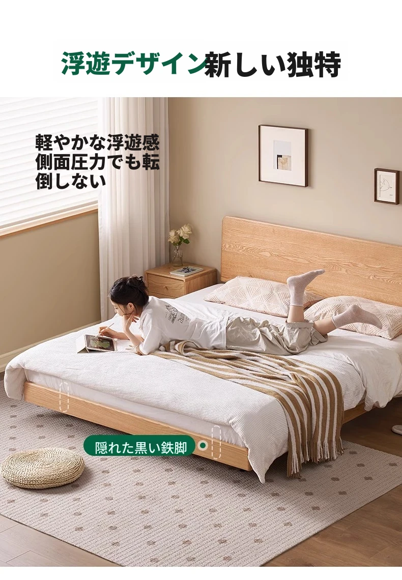 オーガニック素材の無垢材を使用したオーク浮床デザイン、ナイトライト付き!おしゃれな北欧スタイルのダブルベッドで、小さなお部屋でも快適に。主寝室にぴったりな洗練された家具。