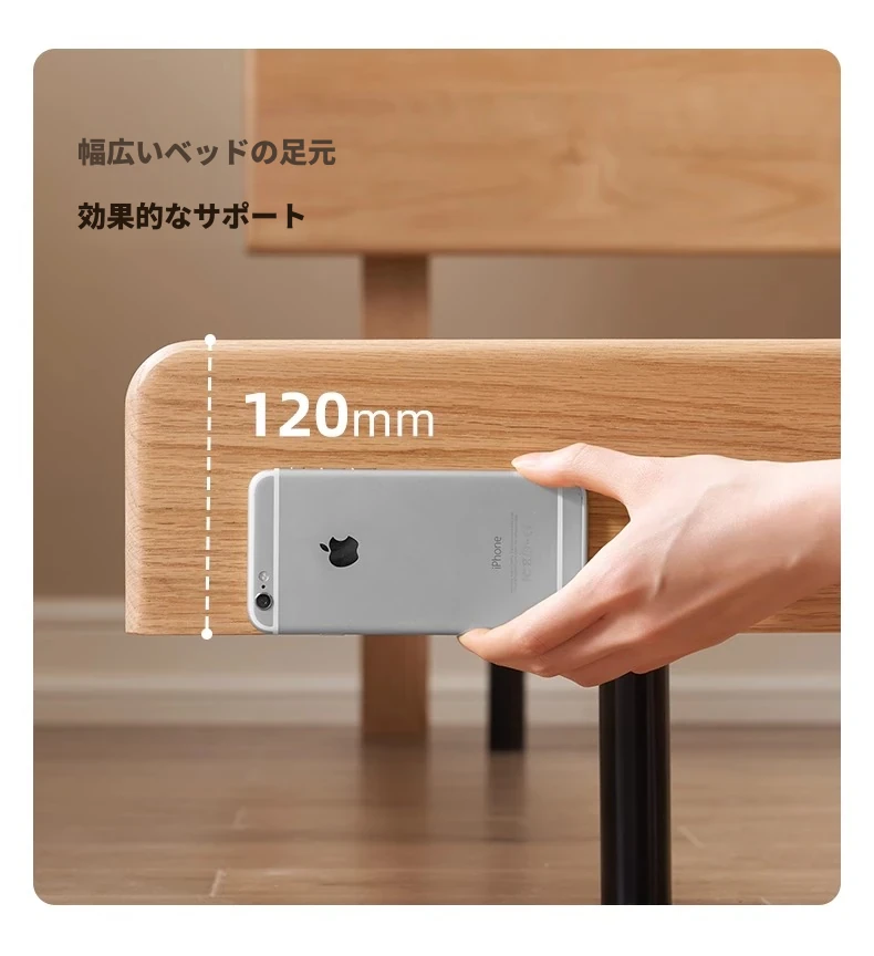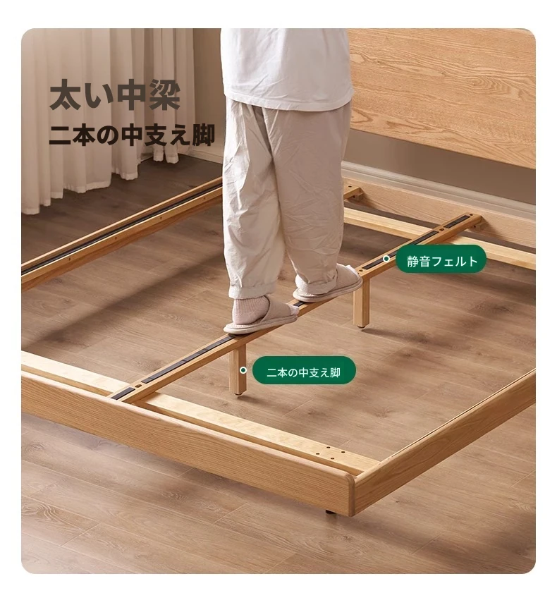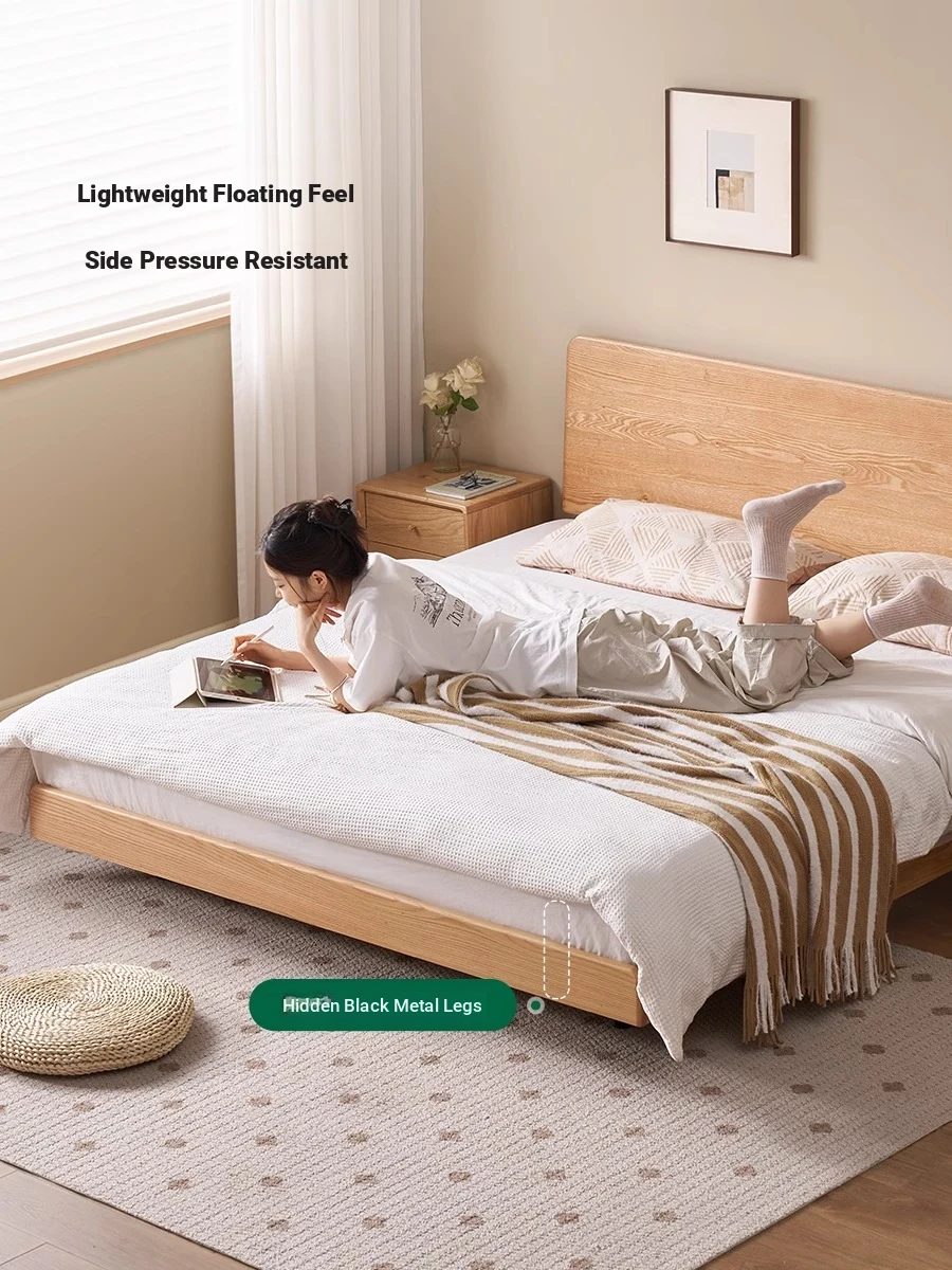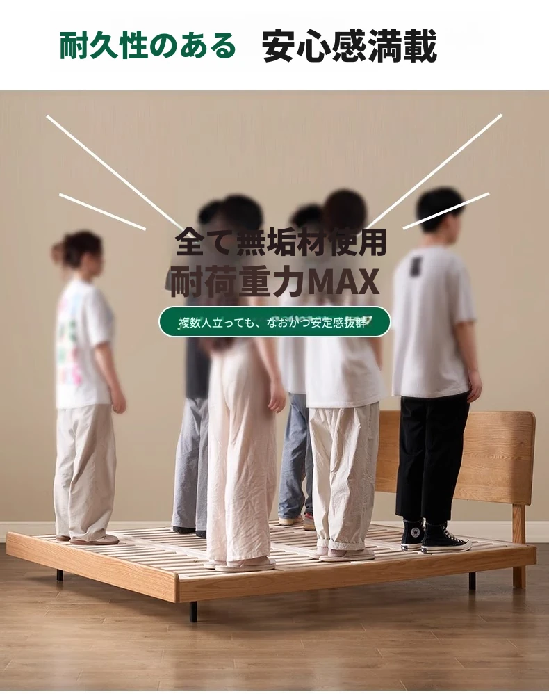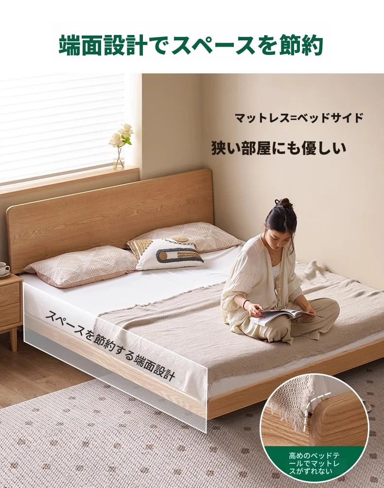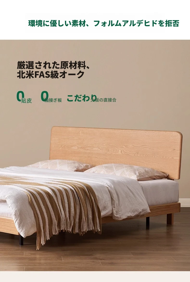 オーガニック素材の無垢材を使用したオーク浮床デザイン、ナイトライト付き!おしゃれな北欧スタイルのダブルベッドで、小さなお部屋でも快適に。主寝室にぴったりな洗練された家具。