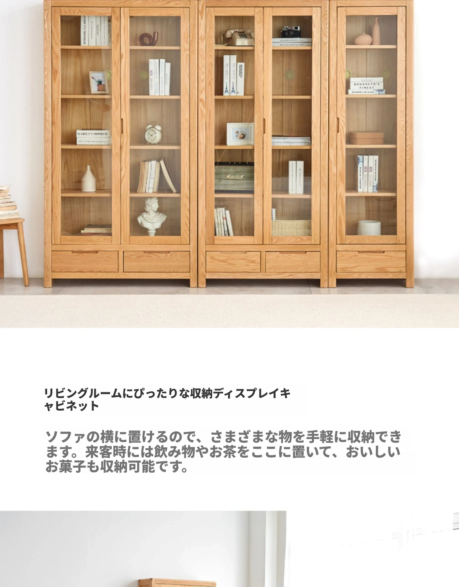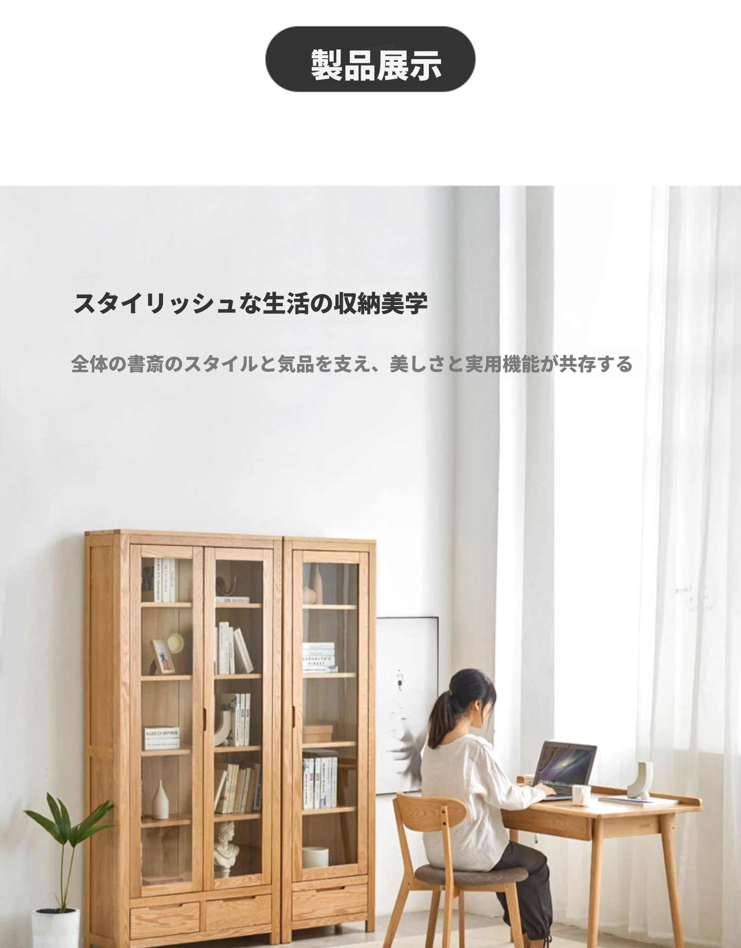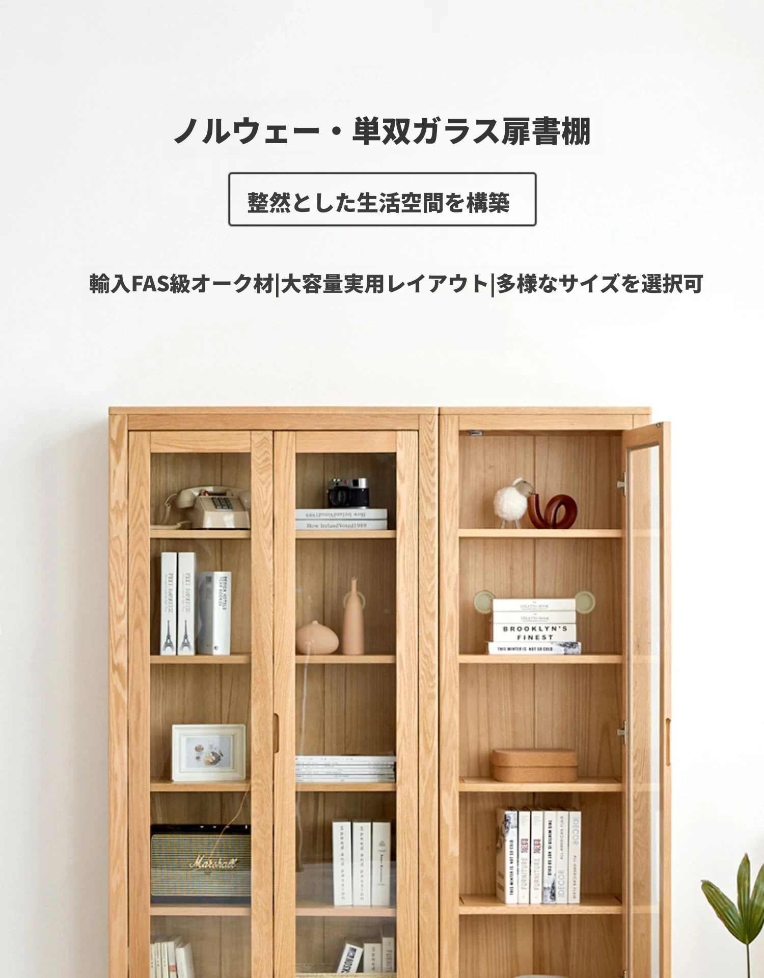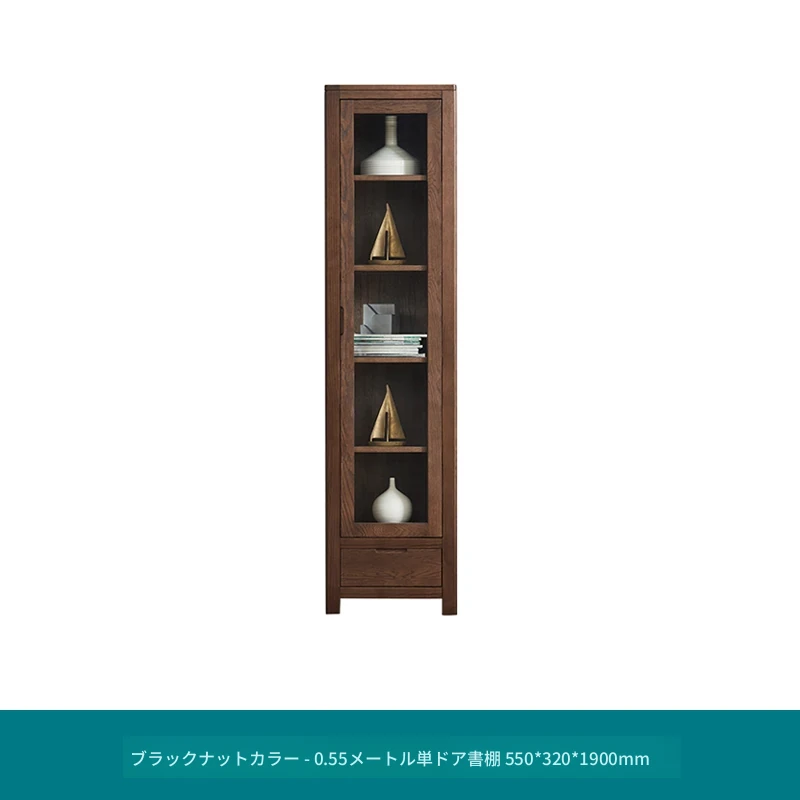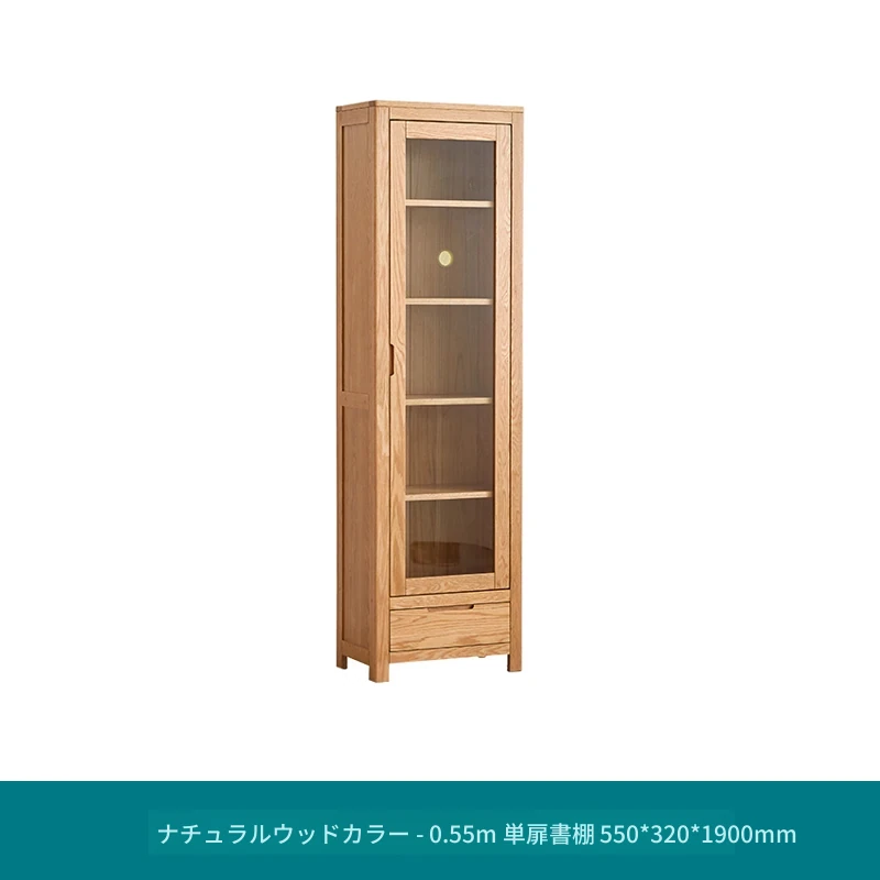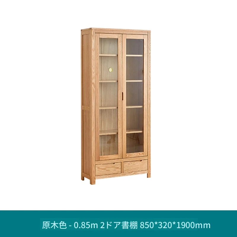 原材料にこだわった本格的無垢材製の書棚!北欧スタイルのオーク材とガラス扉で、シンプルで洗練された書斎に最適な展示キャビネット。あなたの本を美しく飾り、インテリアを引き立てます。