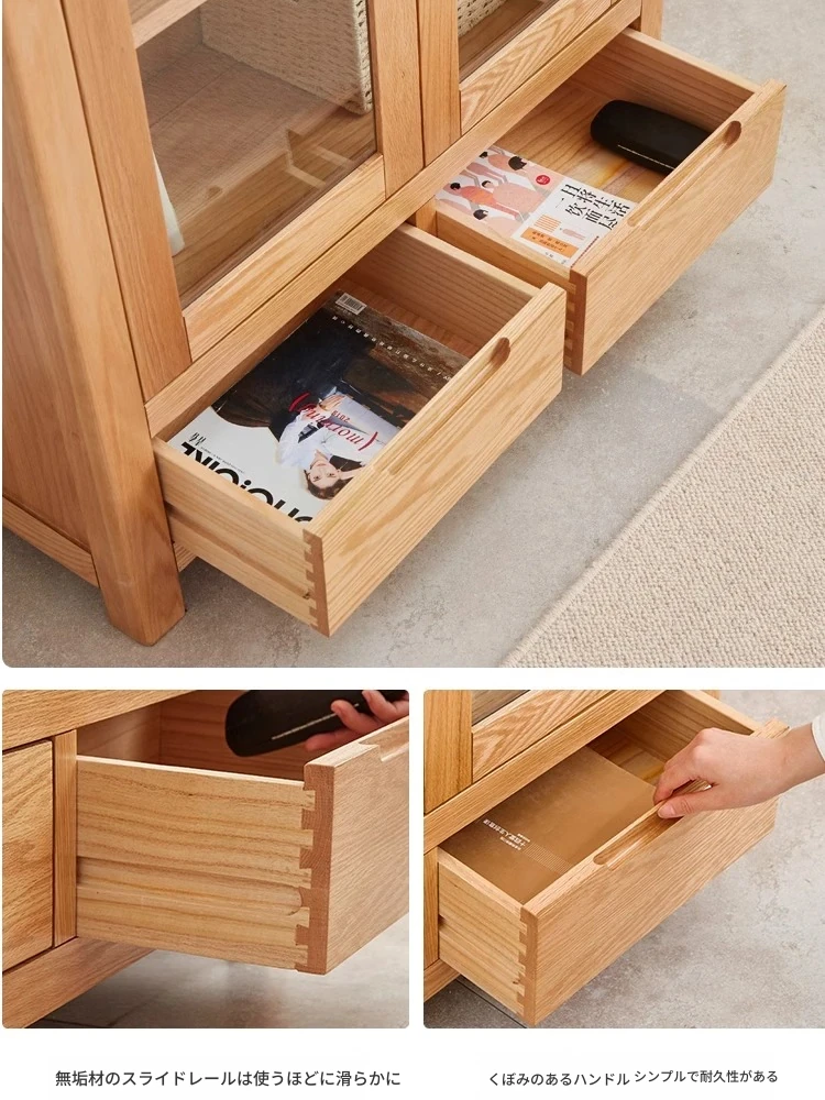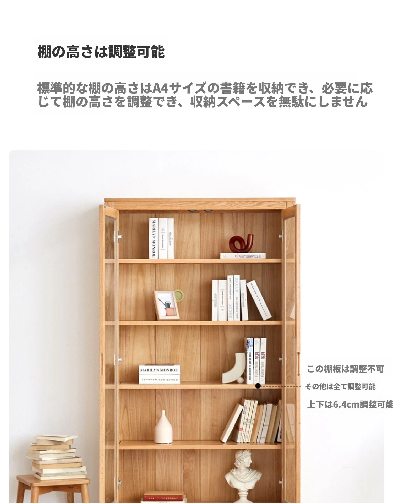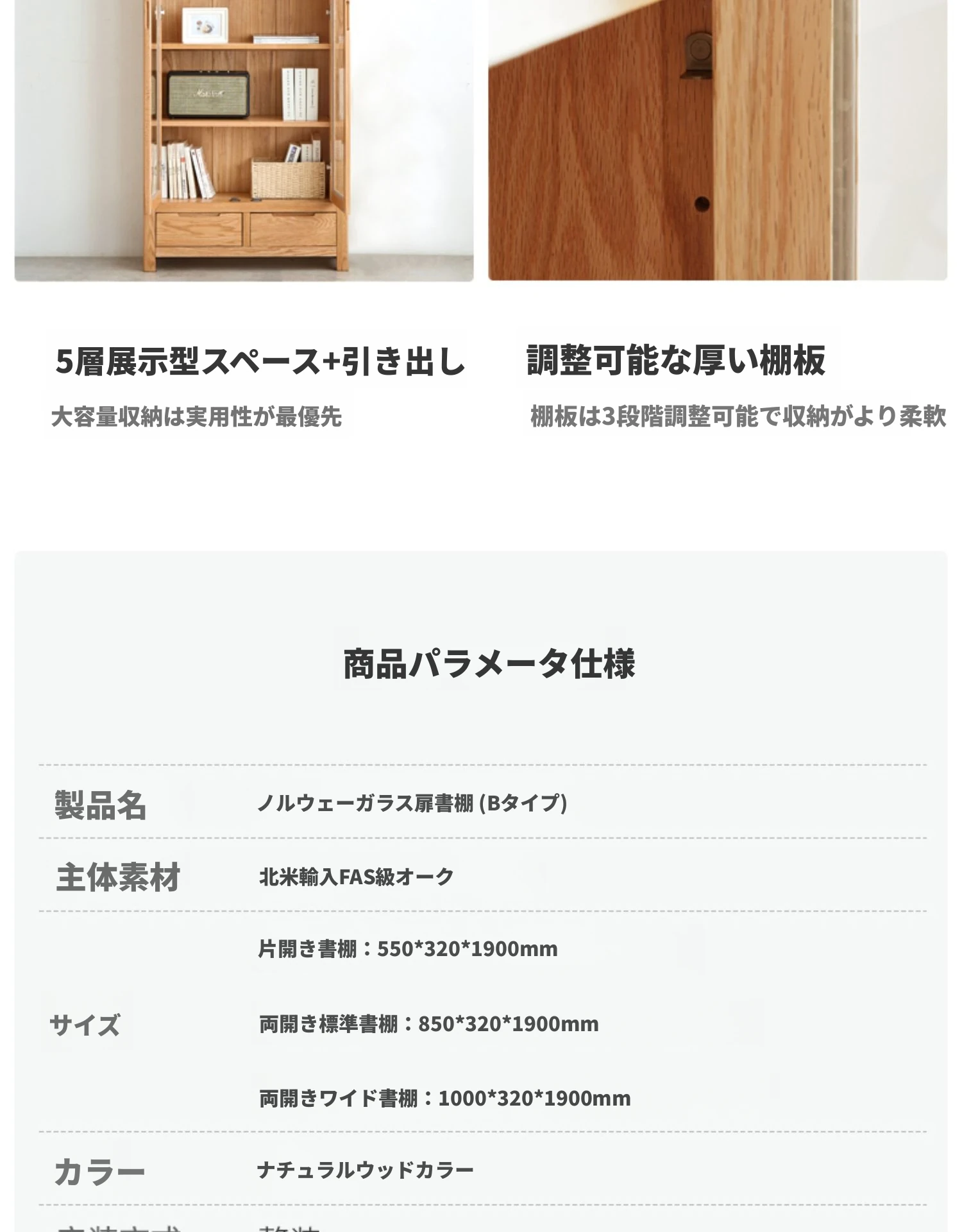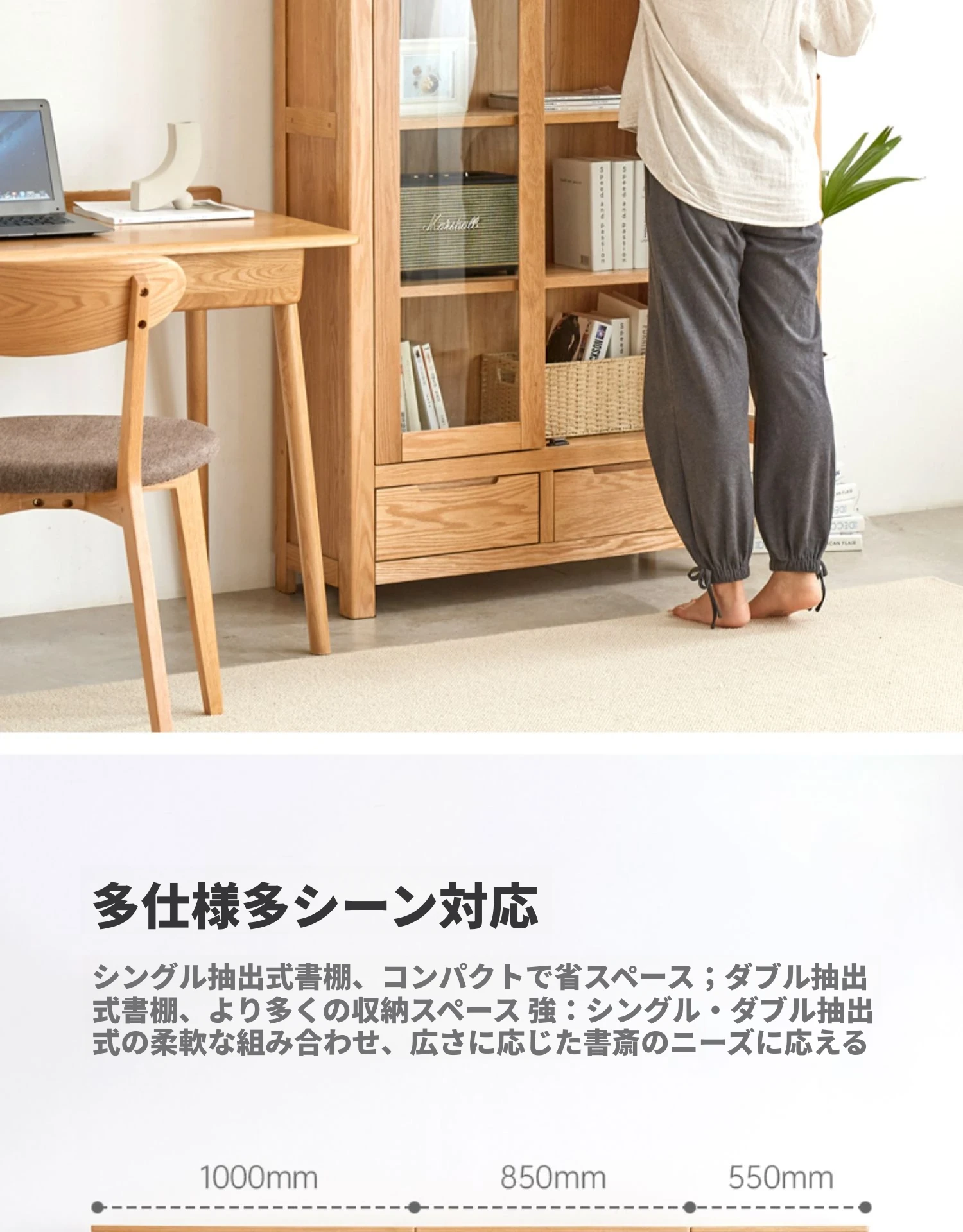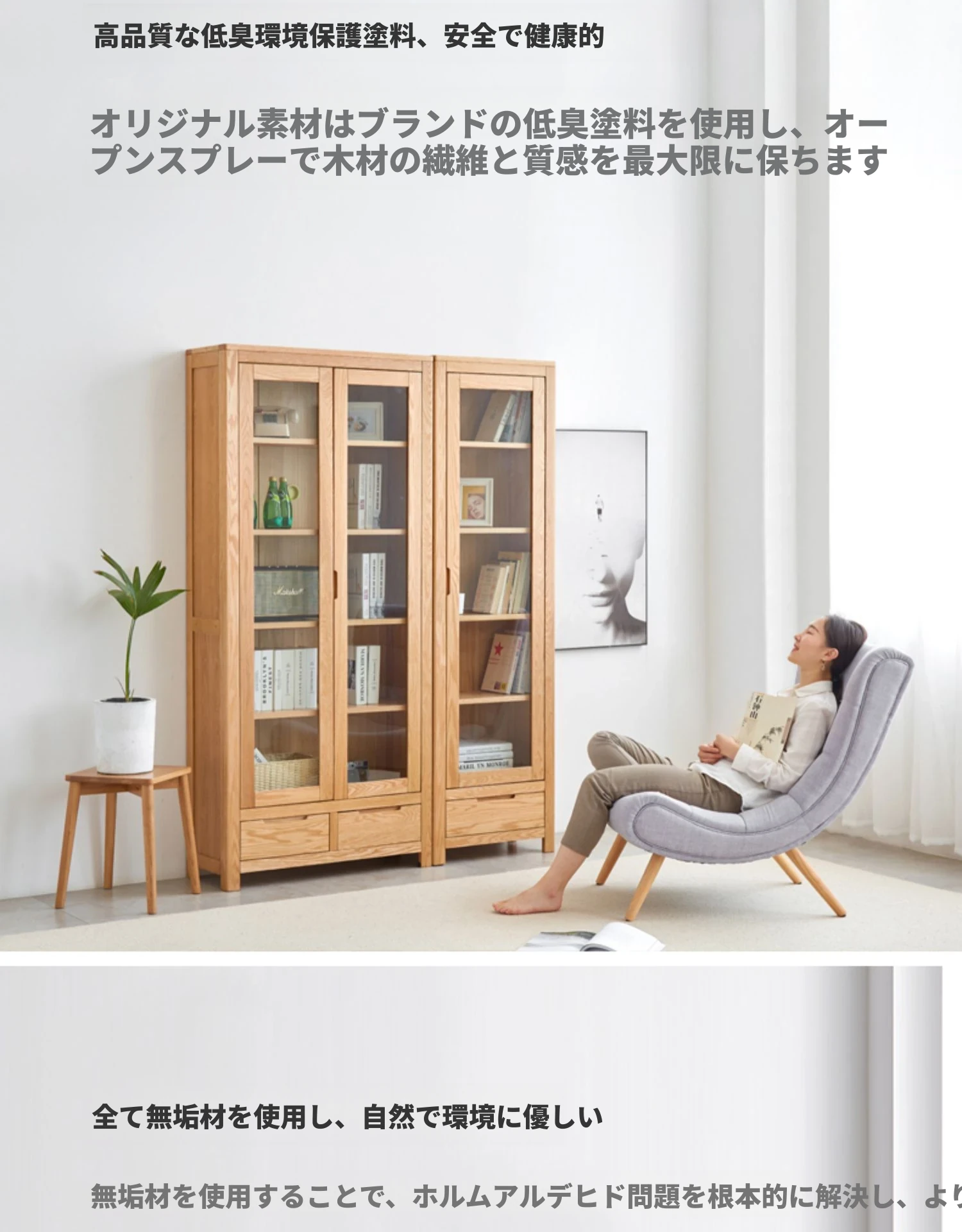 原材料にこだわった本格的無垢材製の書棚!北欧スタイルのオーク材とガラス扉で、シンプルで洗練された書斎に最適な展示キャビネット。あなたの本を美しく飾り、インテリアを引き立てます。