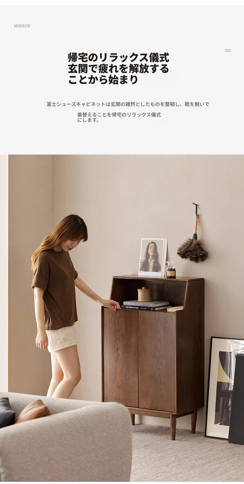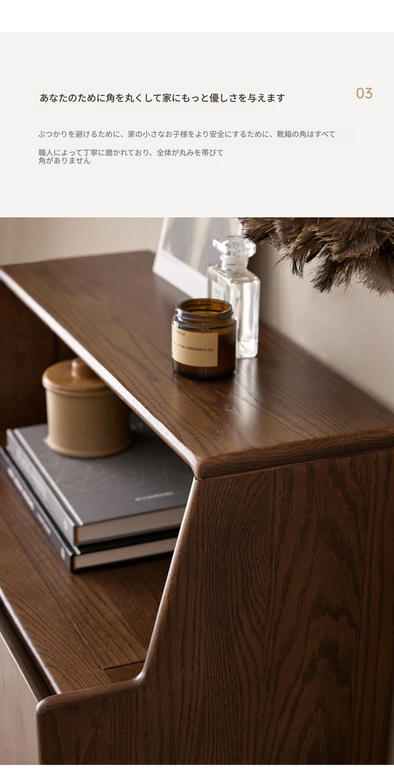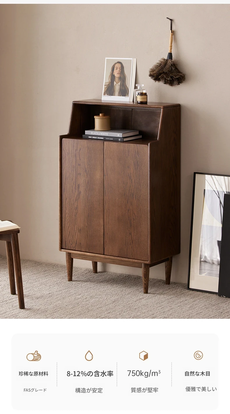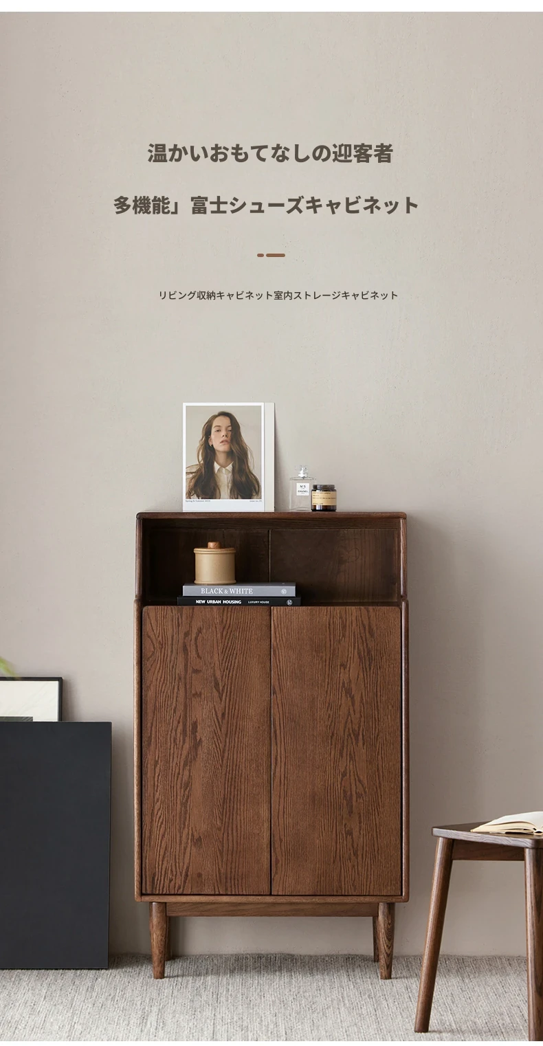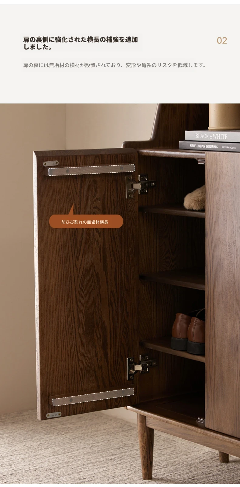 エレガントな無垢材の靴収納キャビネット – 北欧風・和風のミニマリストデザイン、オーク材を使用した小型リビング向けインテリア・玄関収納。すっきりとした空間を作り出す、こだわりの逸品!