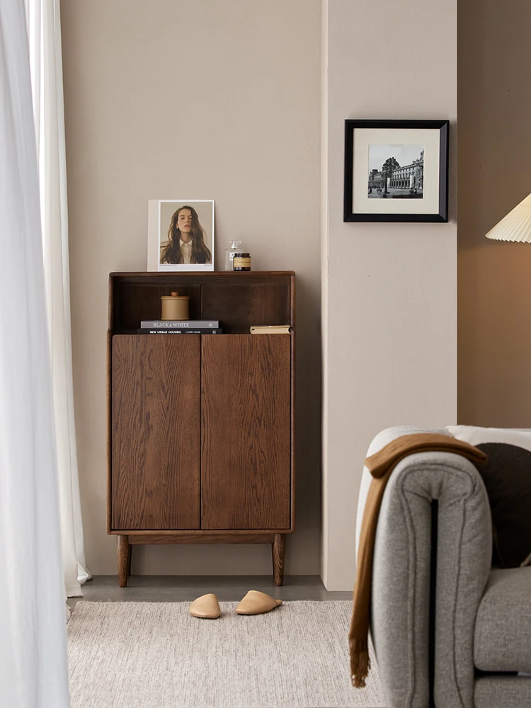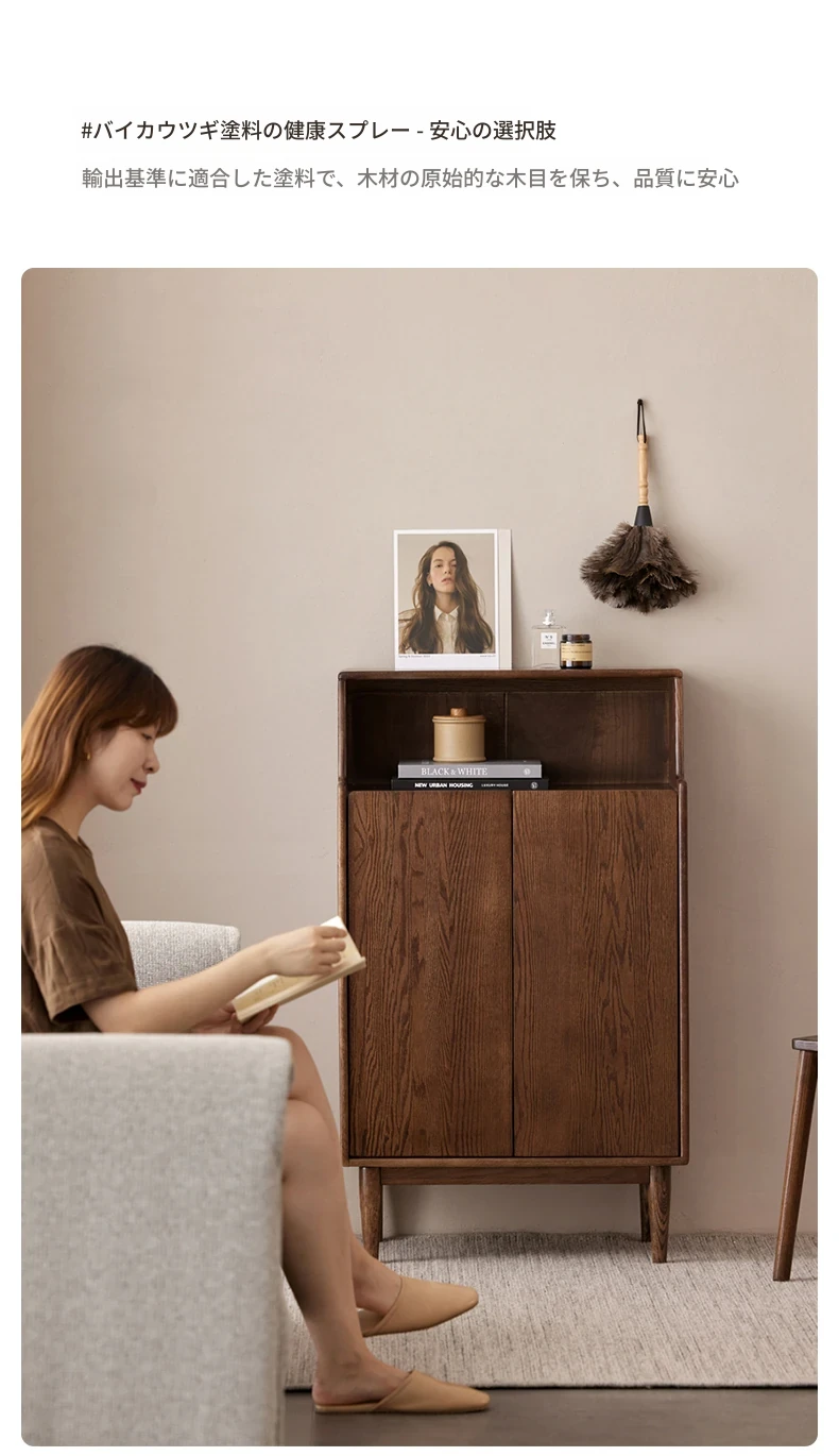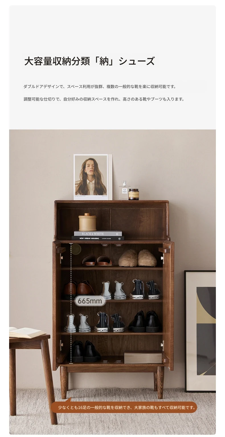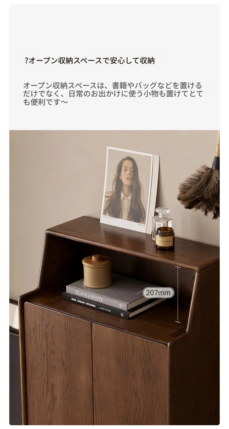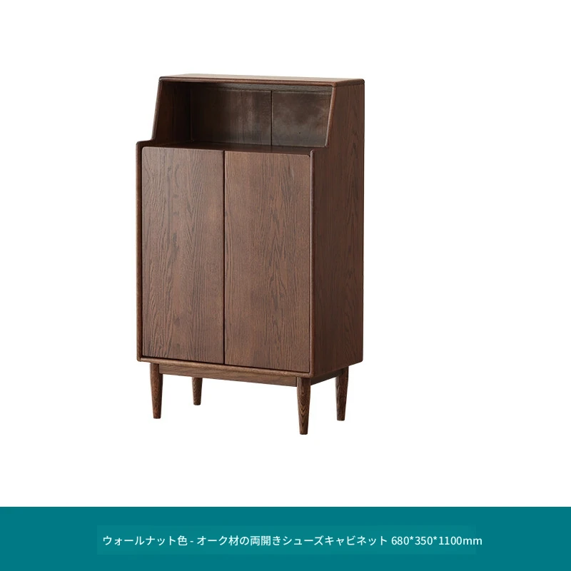 エレガントな無垢材の靴収納キャビネット – 北欧風・和風のミニマリストデザイン、オーク材を使用した小型リビング向けインテリア・玄関収納。すっきりとした空間を作り出す、こだわりの逸品!