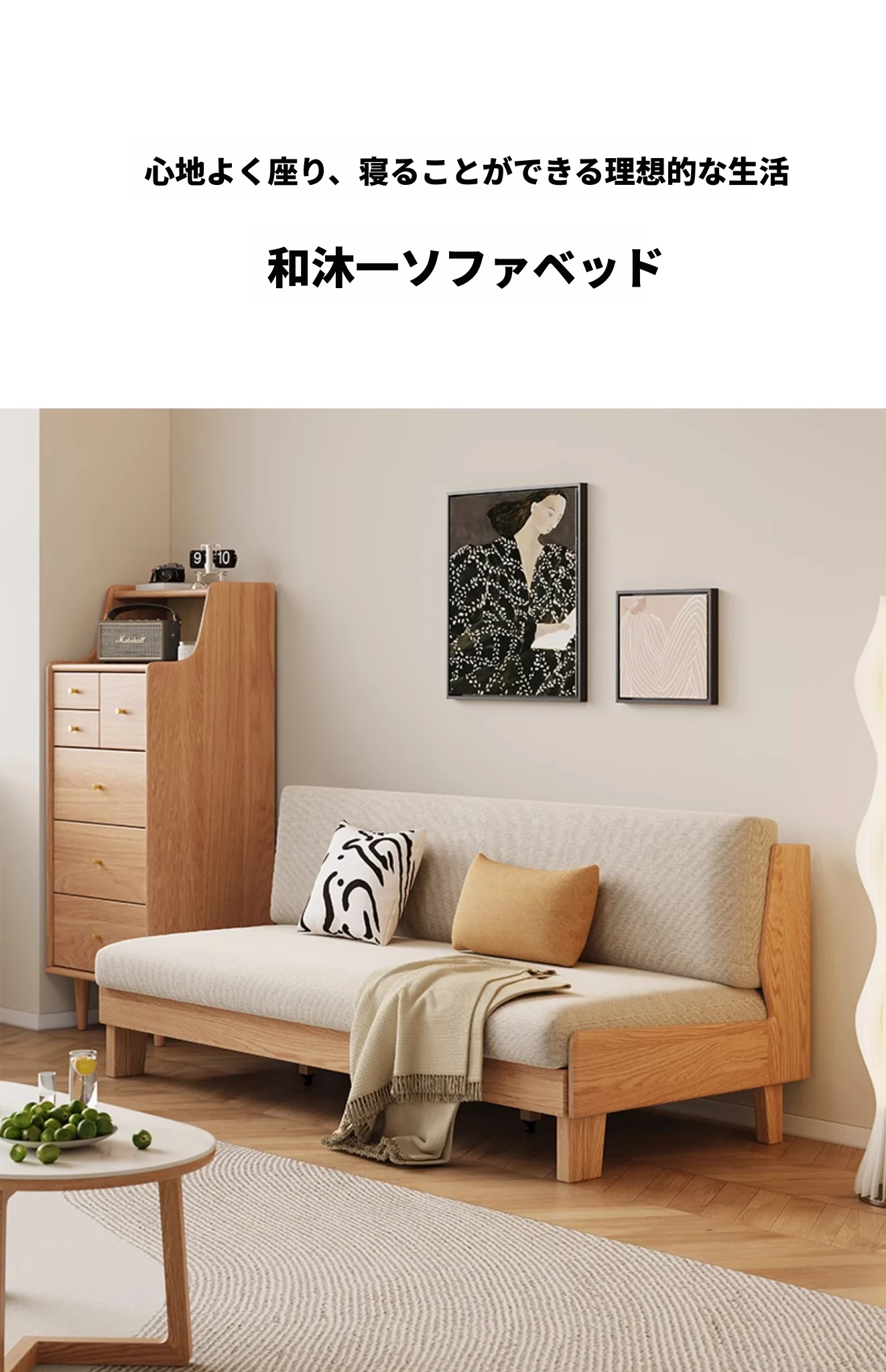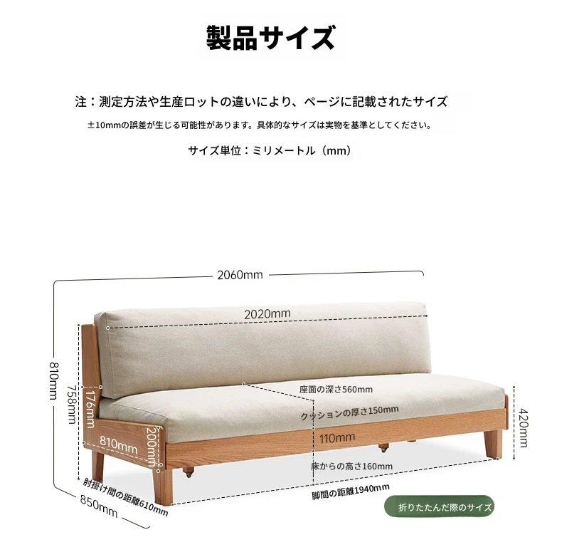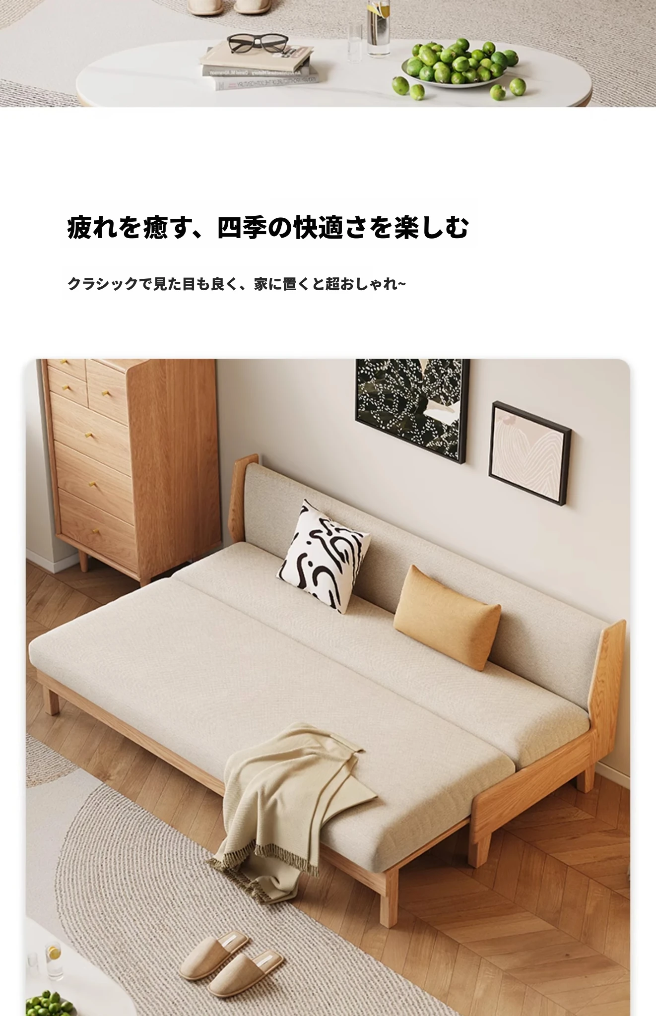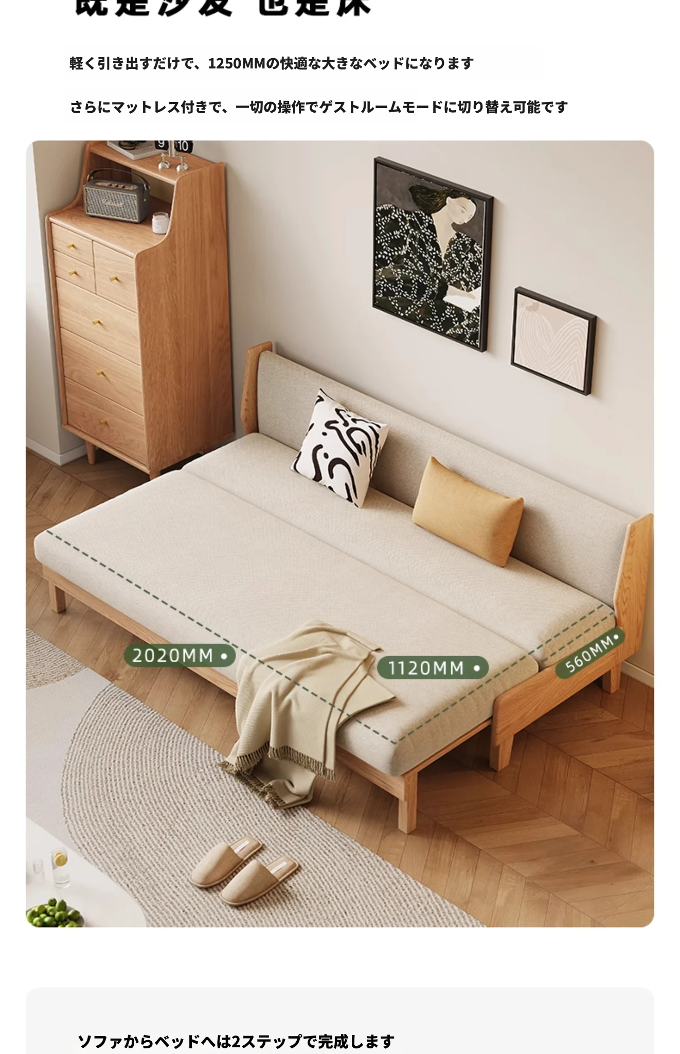 原木の風合いを生かした折りたたみソファベッド|現代的でシンプルなデザイン|小さなスペースにも最適なオーク製スライドベッド【多機能・快適なリビング空間を実現】