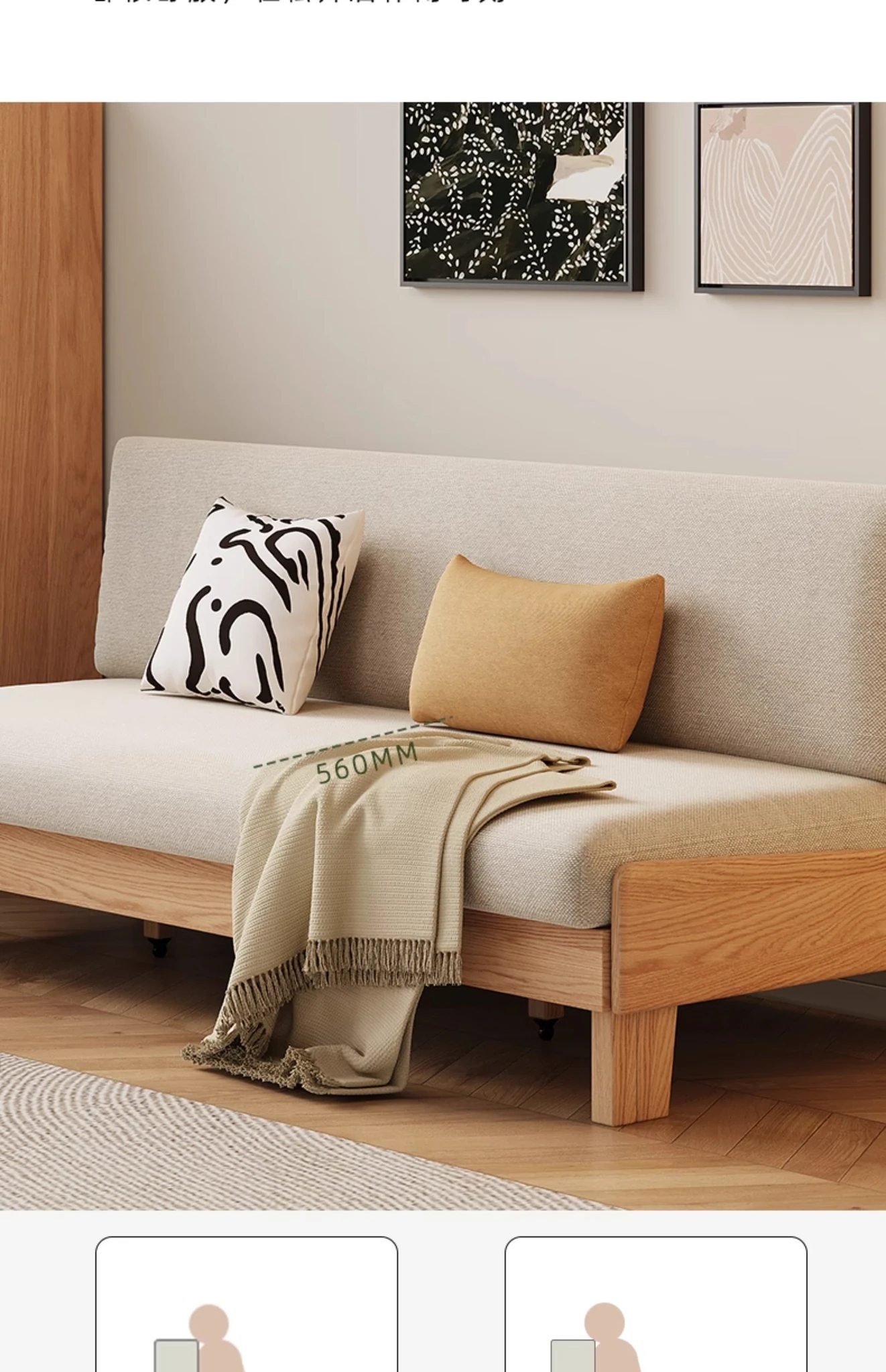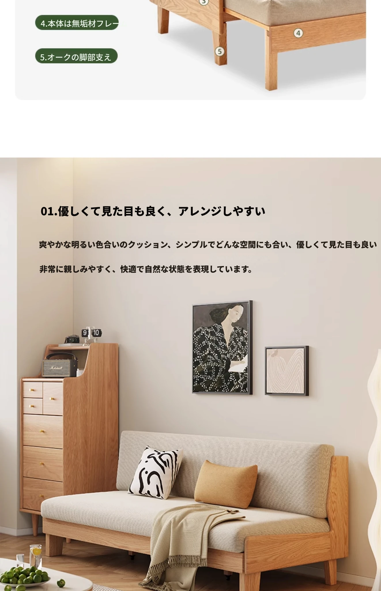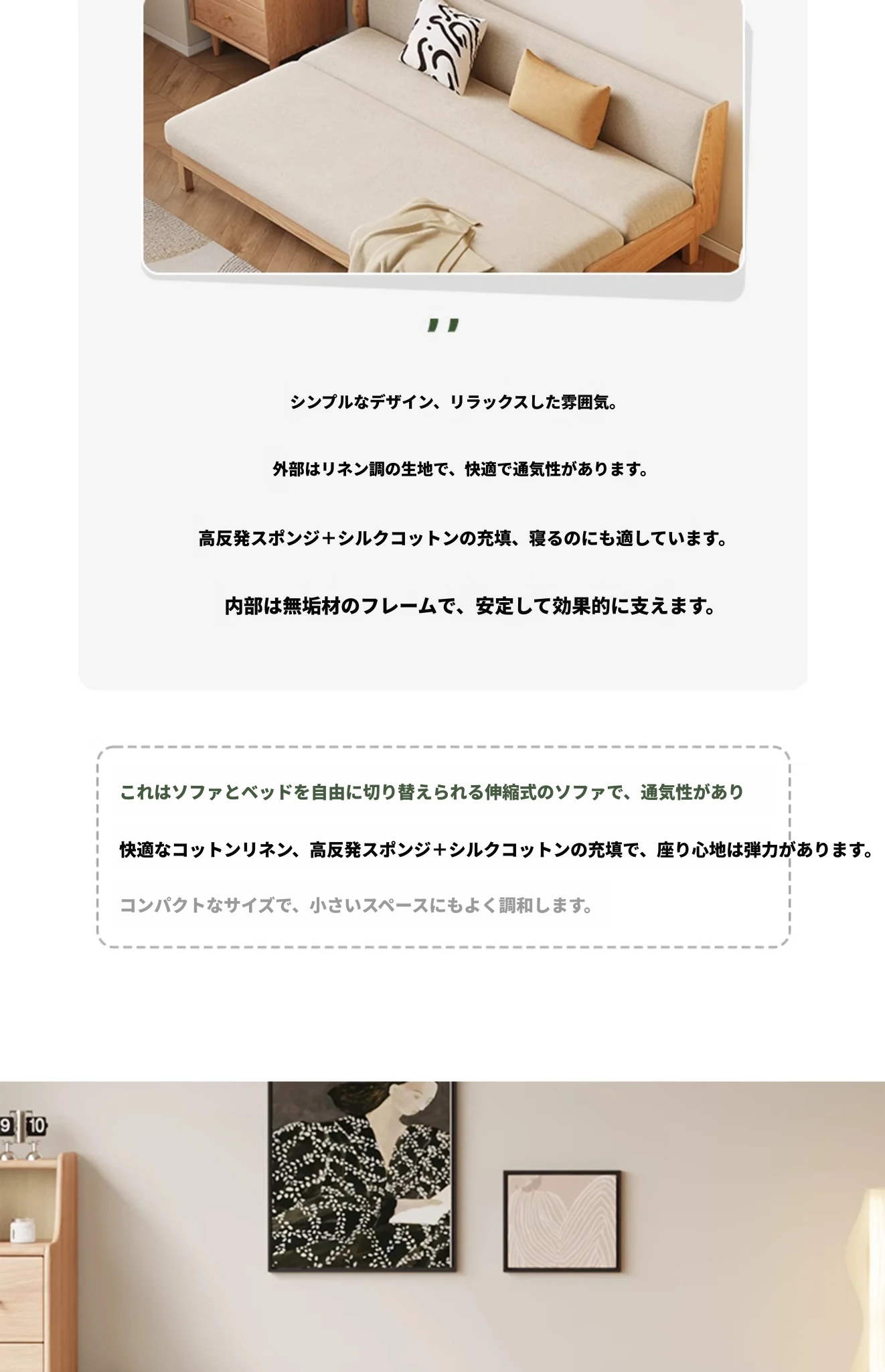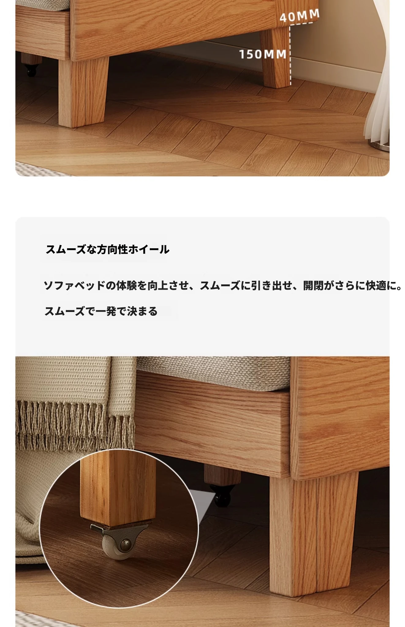 原木の風合いを生かした折りたたみソファベッド|現代的でシンプルなデザイン|小さなスペースにも最適なオーク製スライドベッド【多機能・快適なリビング空間を実現】