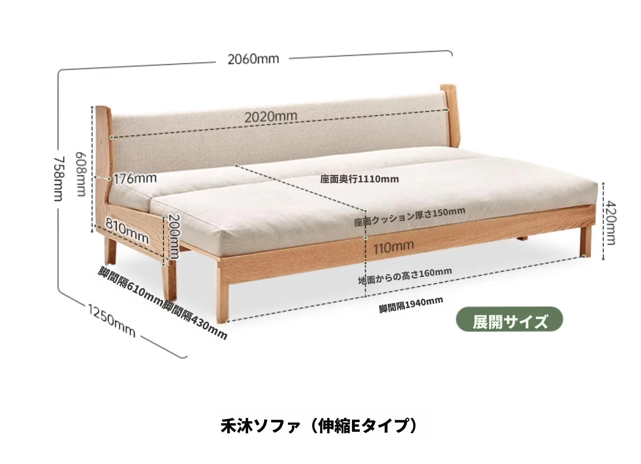 ナチュラルカラー - オークソファ (伸縮式) (グレーソフトパック) 2060*850*758mm