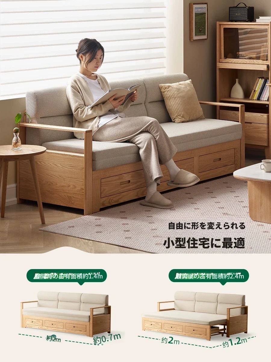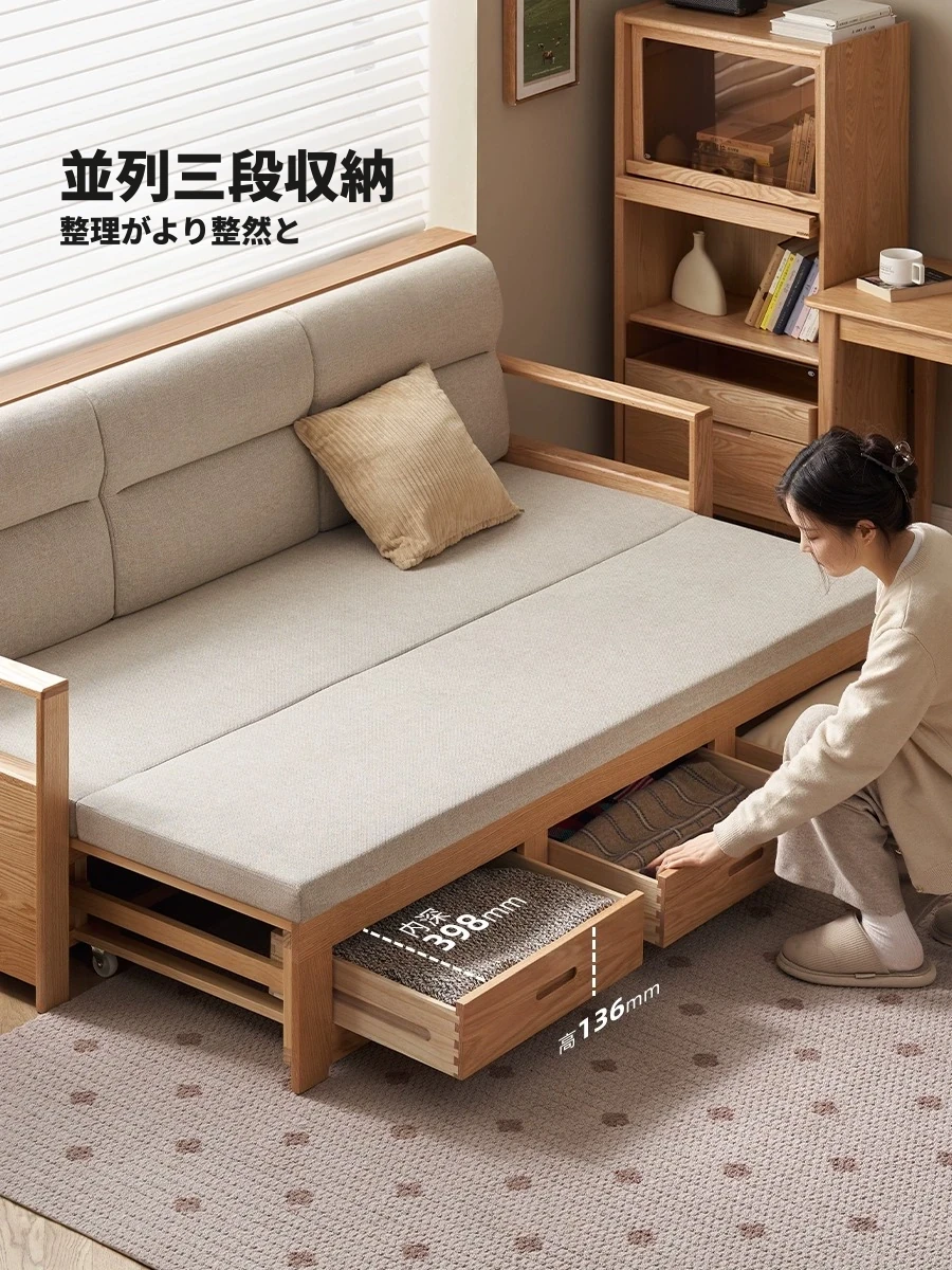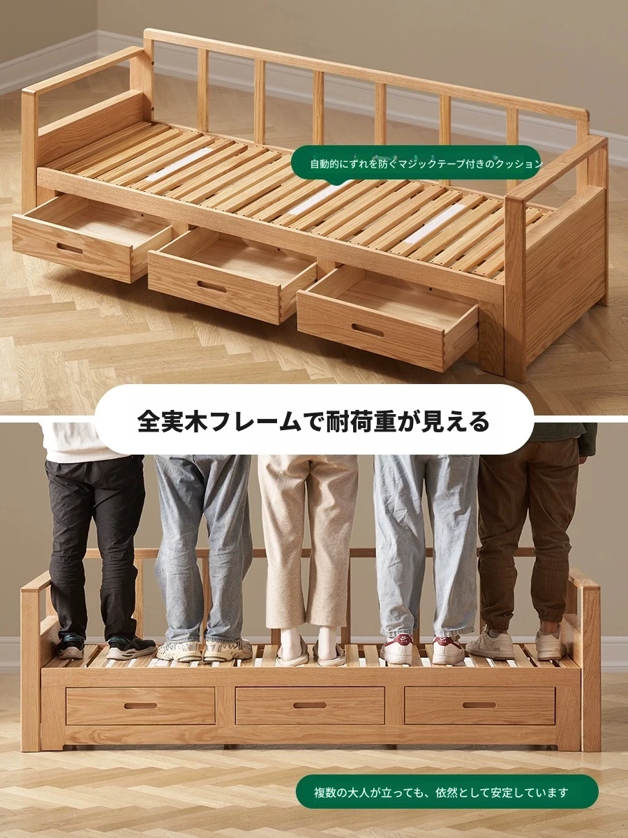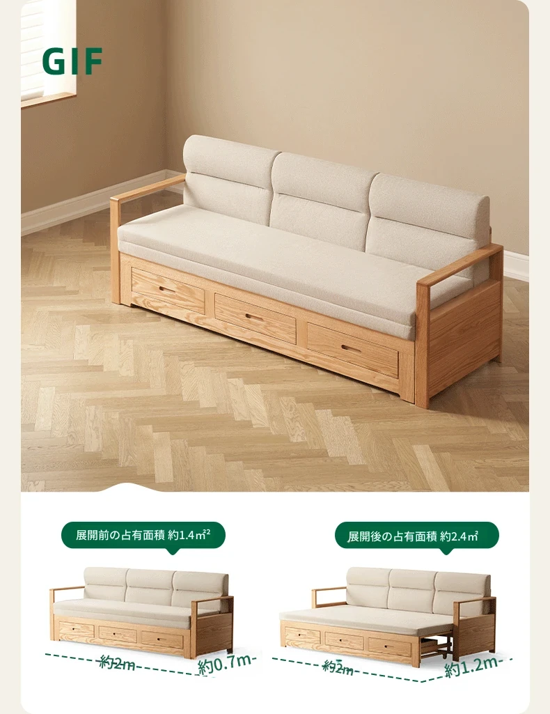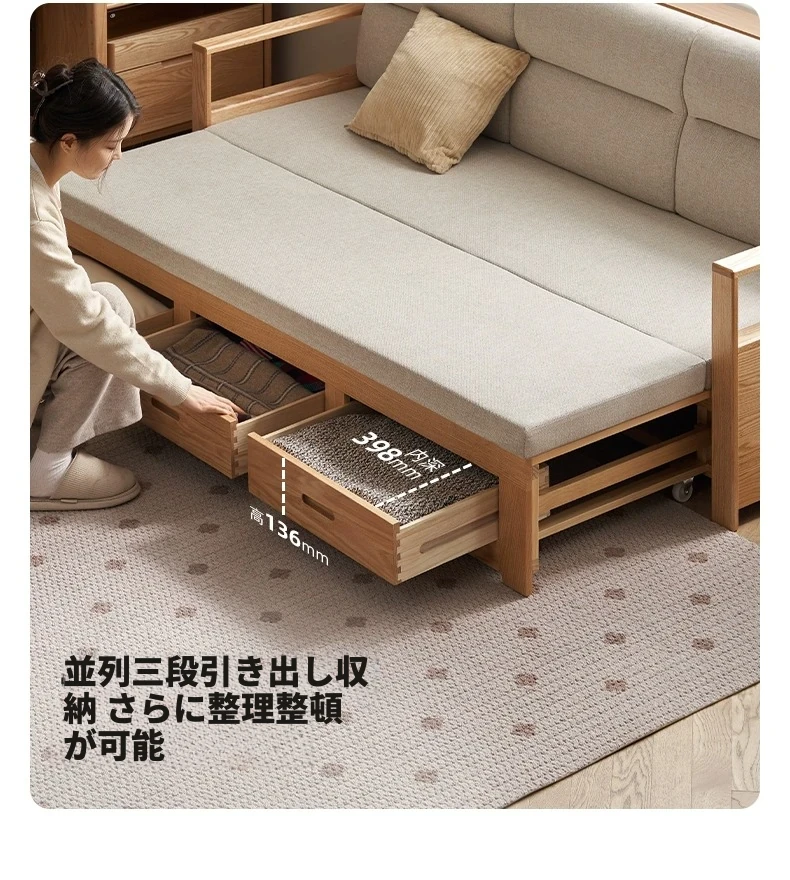オリジナルエッセンス 全木製 折りたたみソファベッド オーク材 多機能伸縮ベッド リビング収納付き 3人掛けソファ - スタイリッシュで実用的な空間を演出!