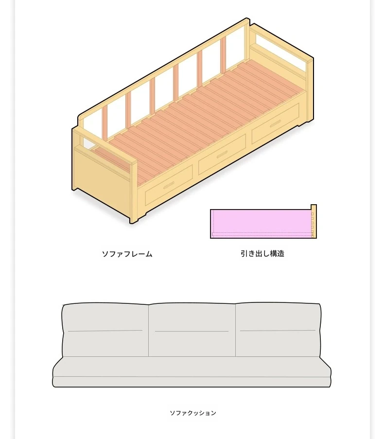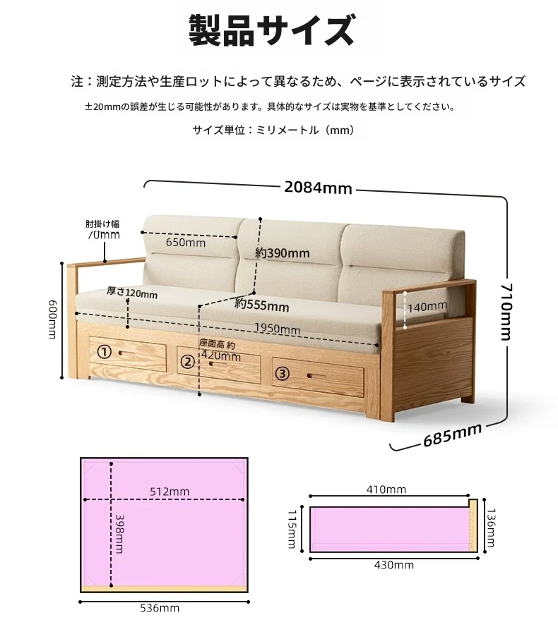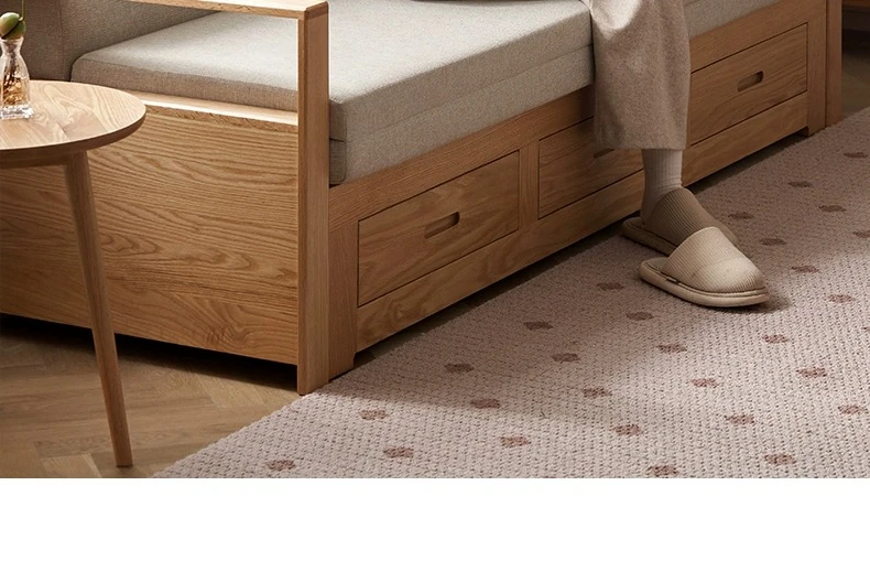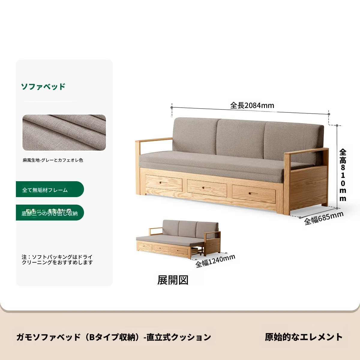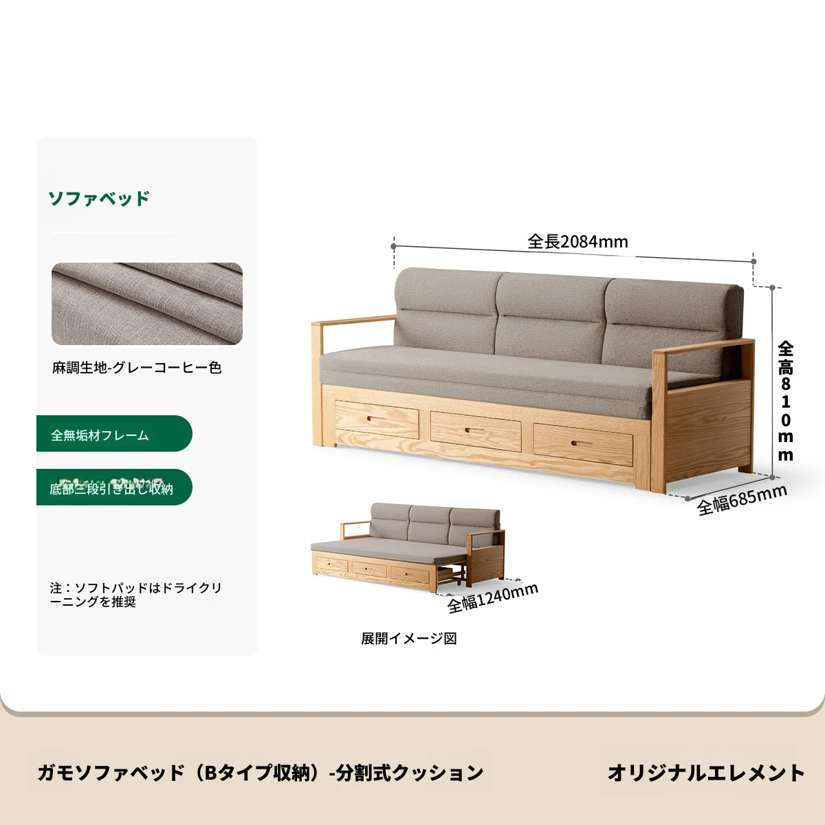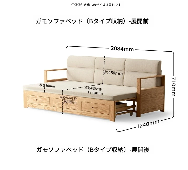 オリジナルエッセンス 全木製 折りたたみソファベッド オーク材 多機能伸縮ベッド リビング収納付き 3人掛けソファ - スタイリッシュで実用的な空間を演出!