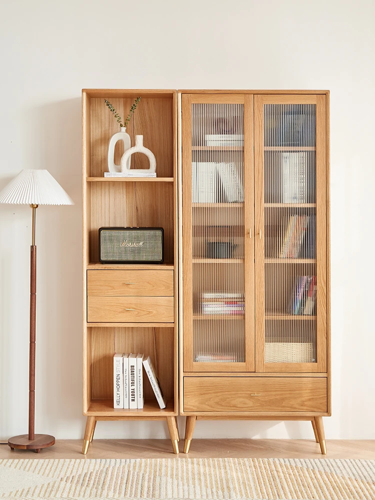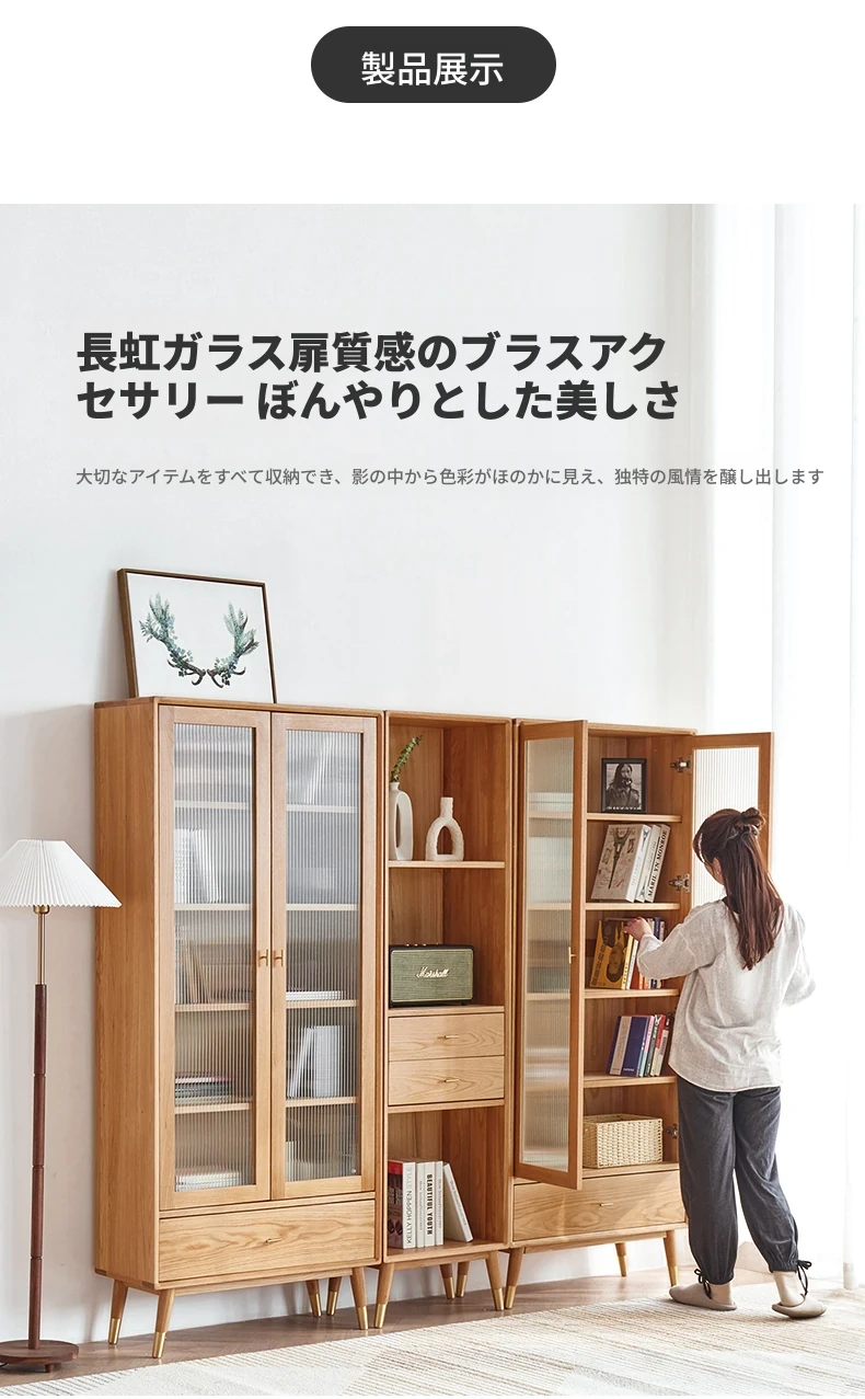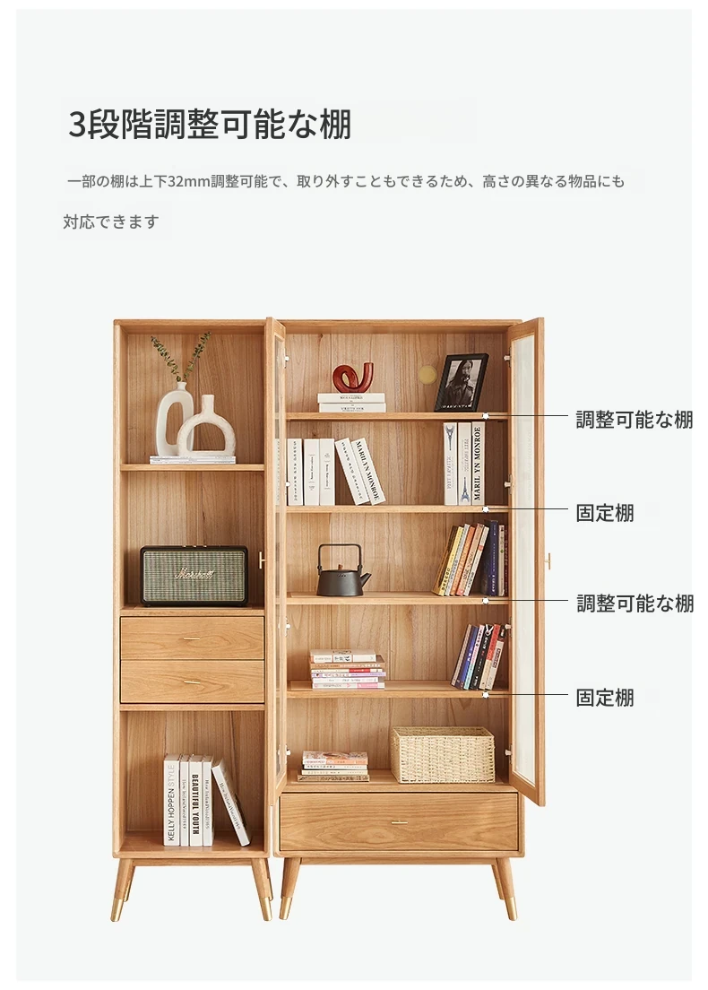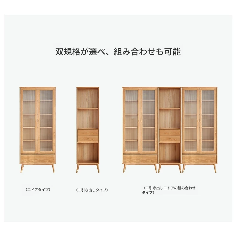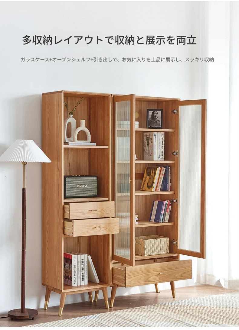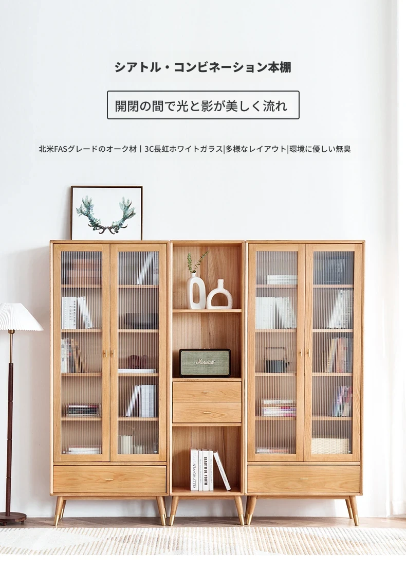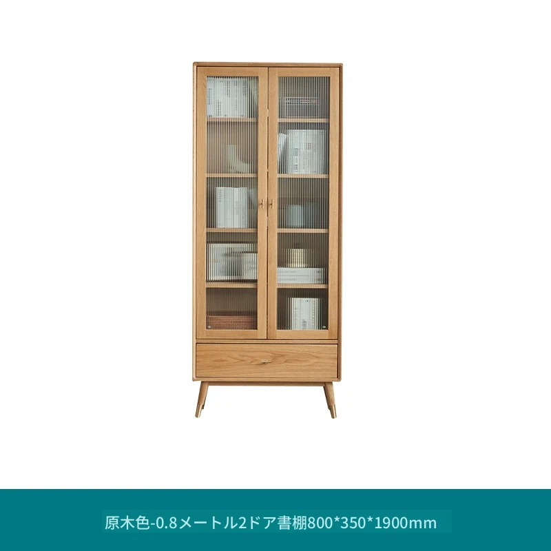 原始エレメント無垢材オールウッド書棚 北欧スタイルのオークダブルドア本棚 小型住宅に最適な書斎家具 家庭用収納書庫で、おしゃれで機能的な空間を演出!