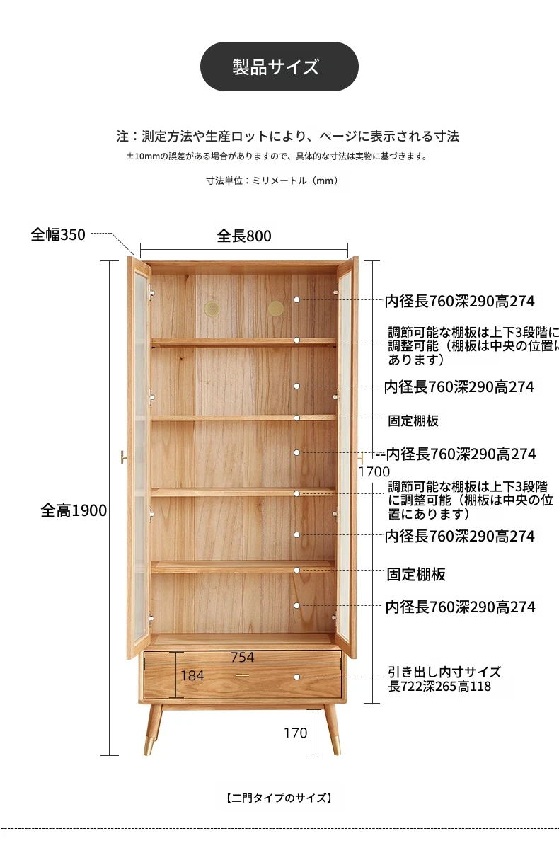 ナチュラルウッド色-二ドア書棚 800*350*1900mm