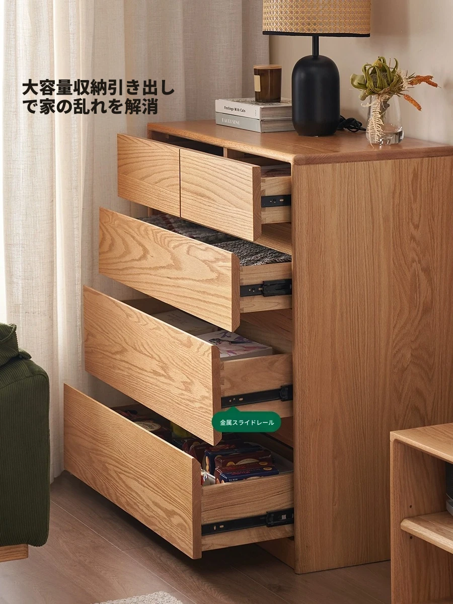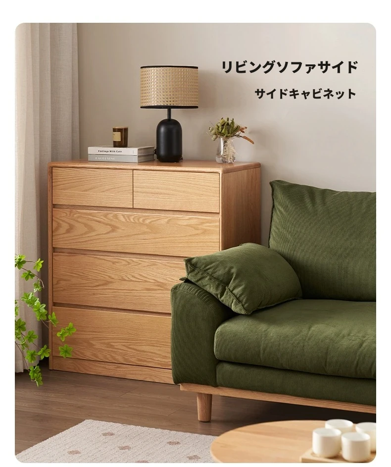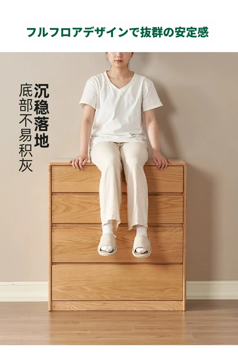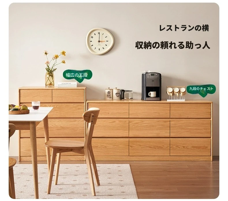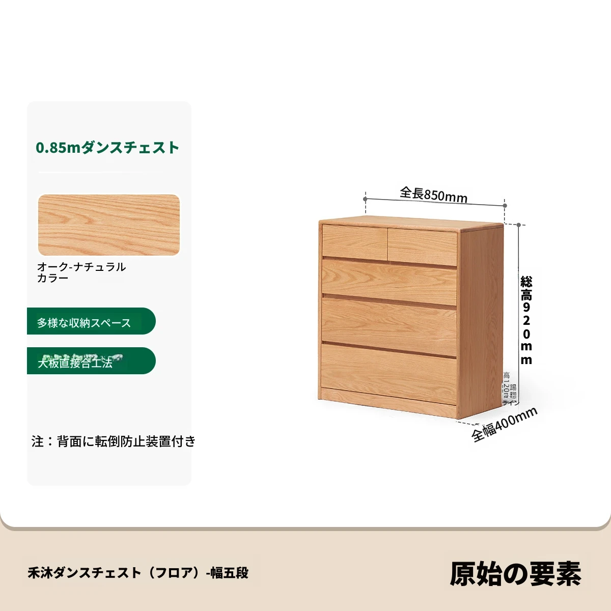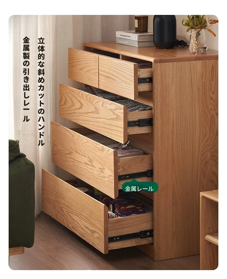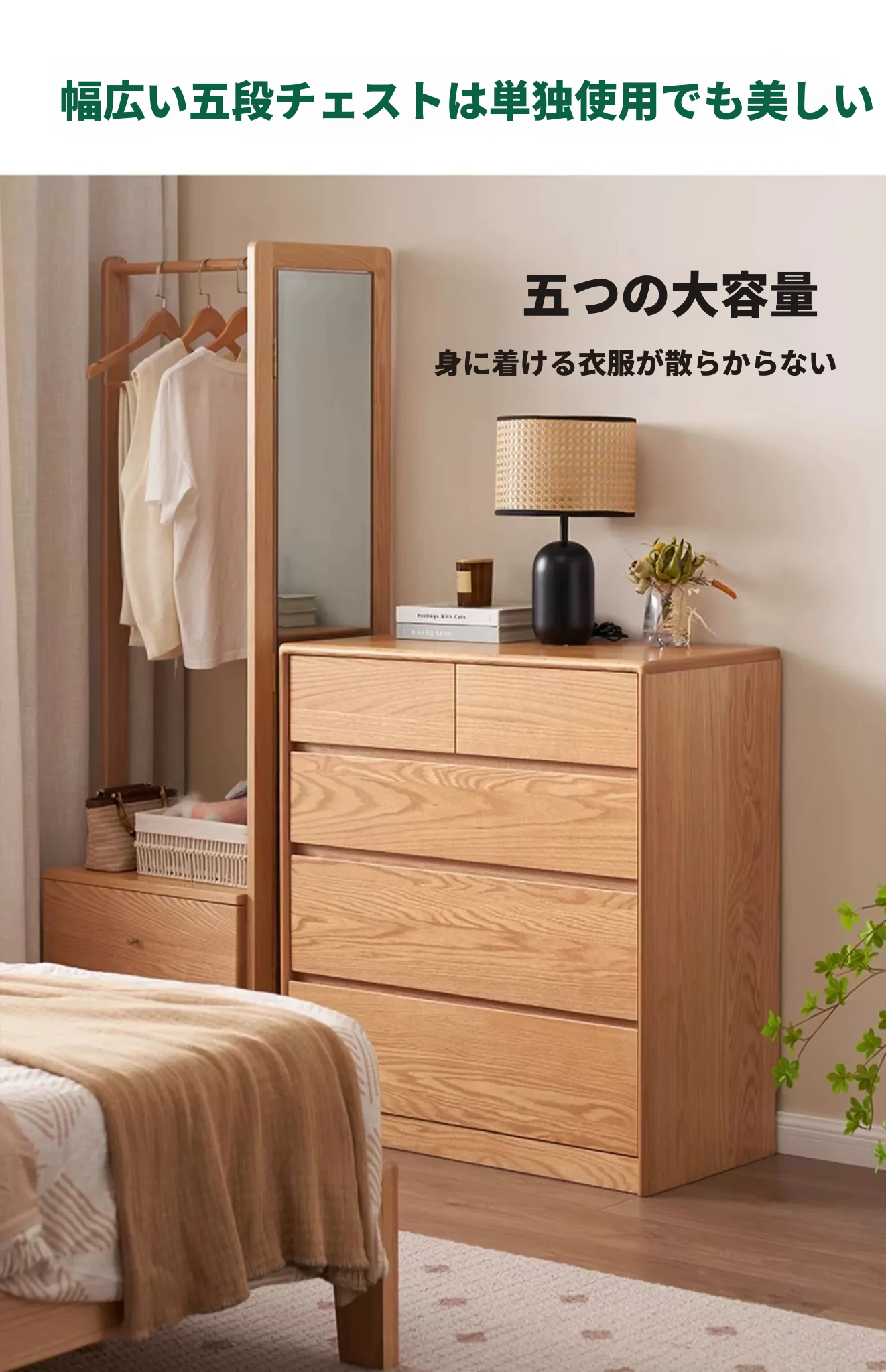天然素材の本格木製5段チェスト、北欧スタイルのオーク収納キャビネット。壁に寄せて安心設置!ベッドサイドやリビングに最適な両用デザイン。美しい仕上げでお部屋を華やかに彩ります!