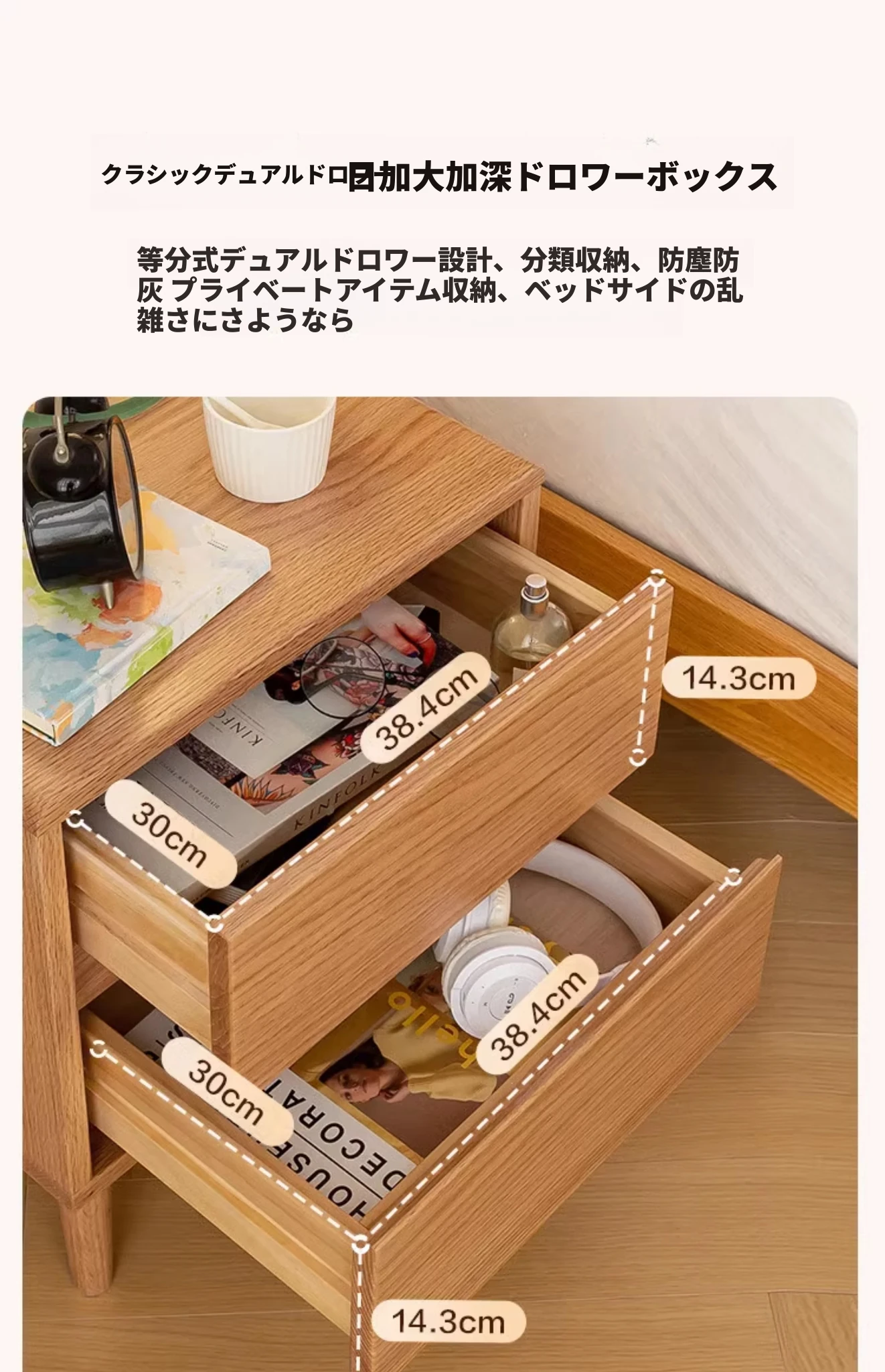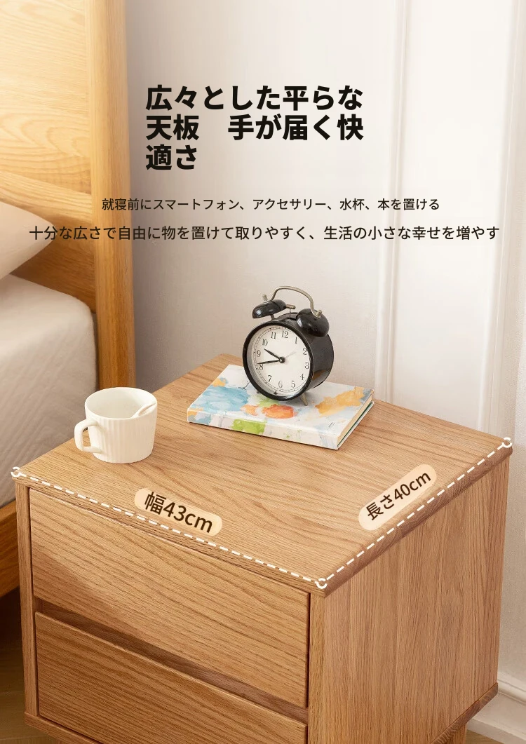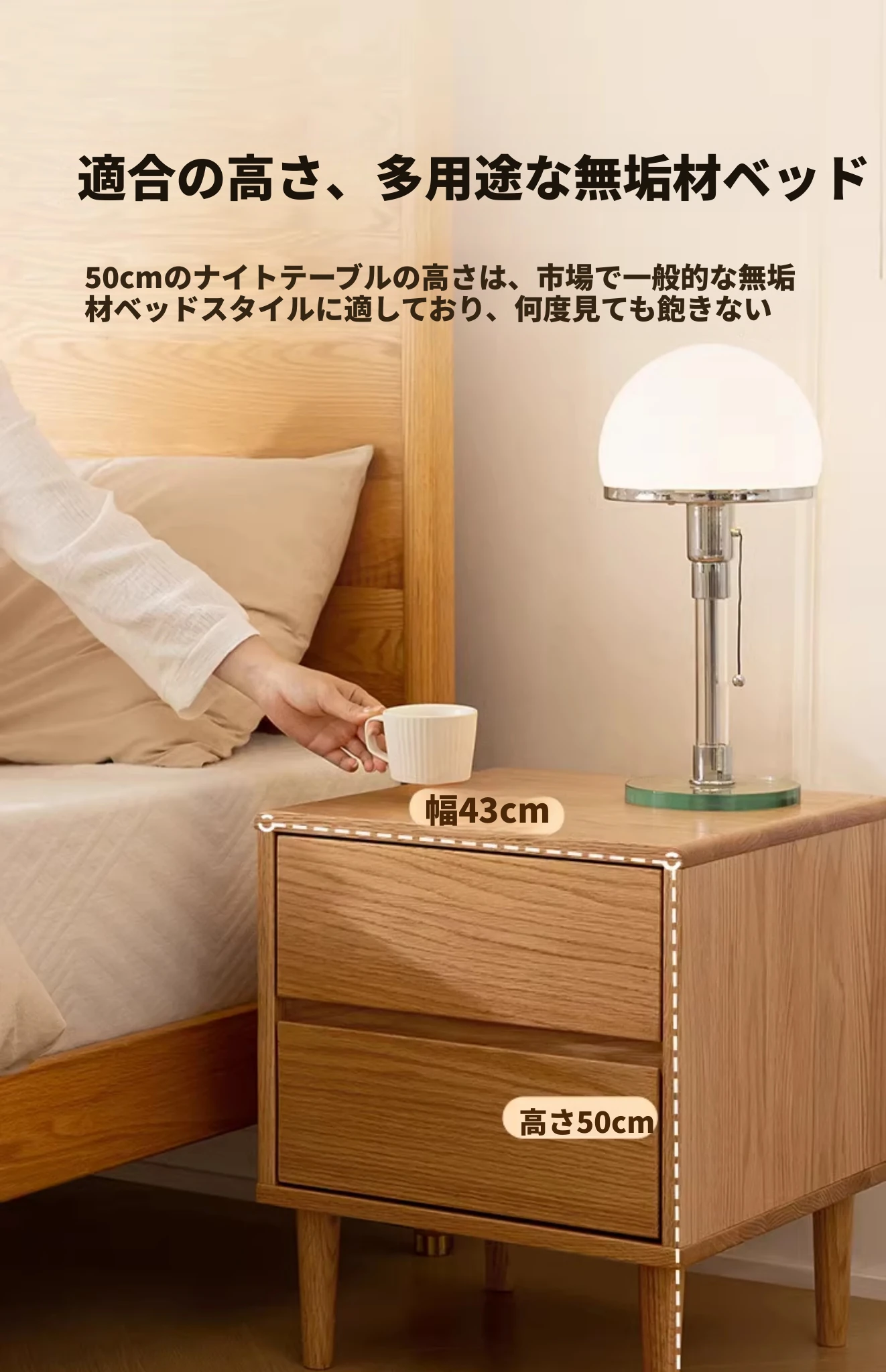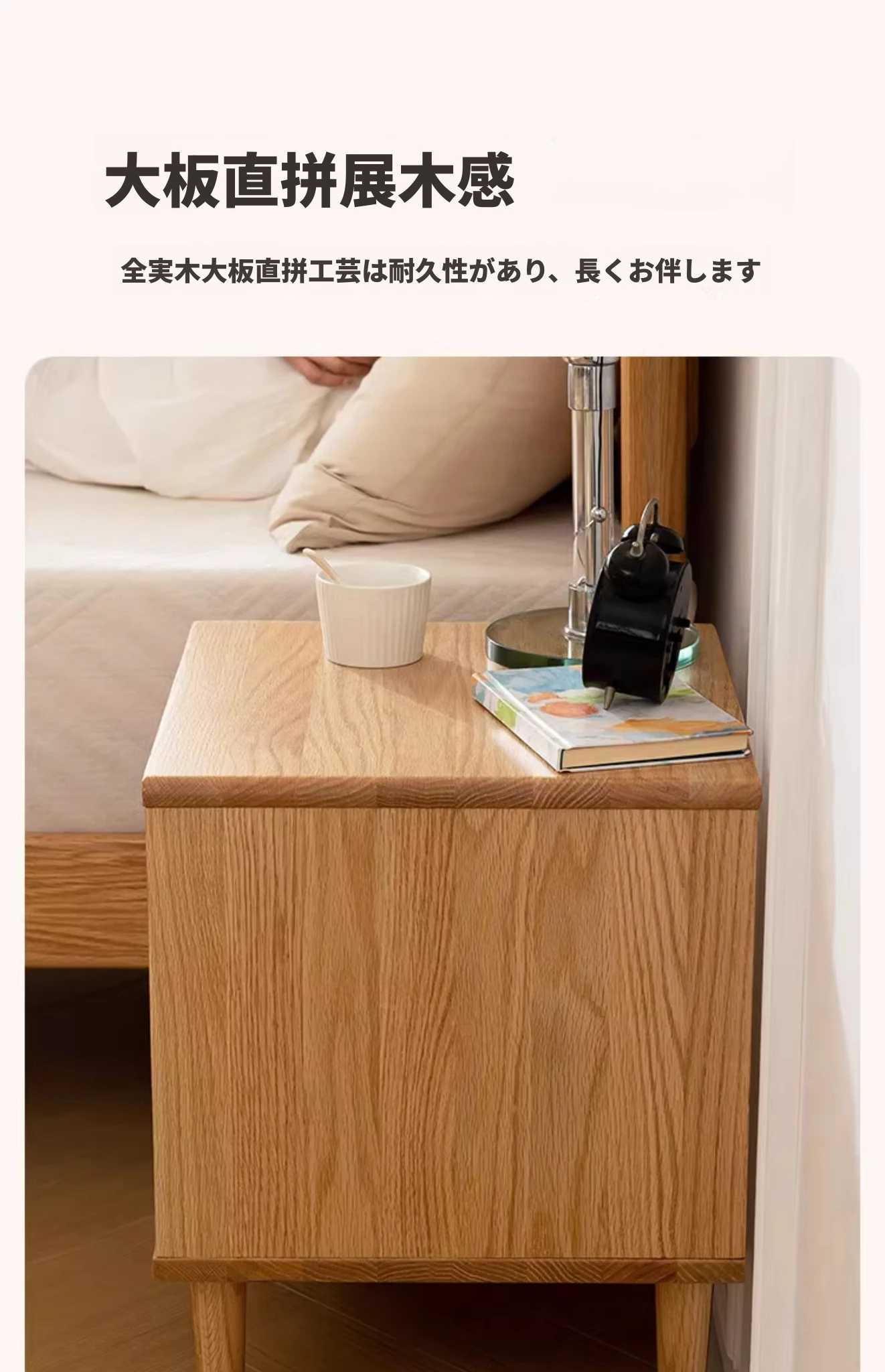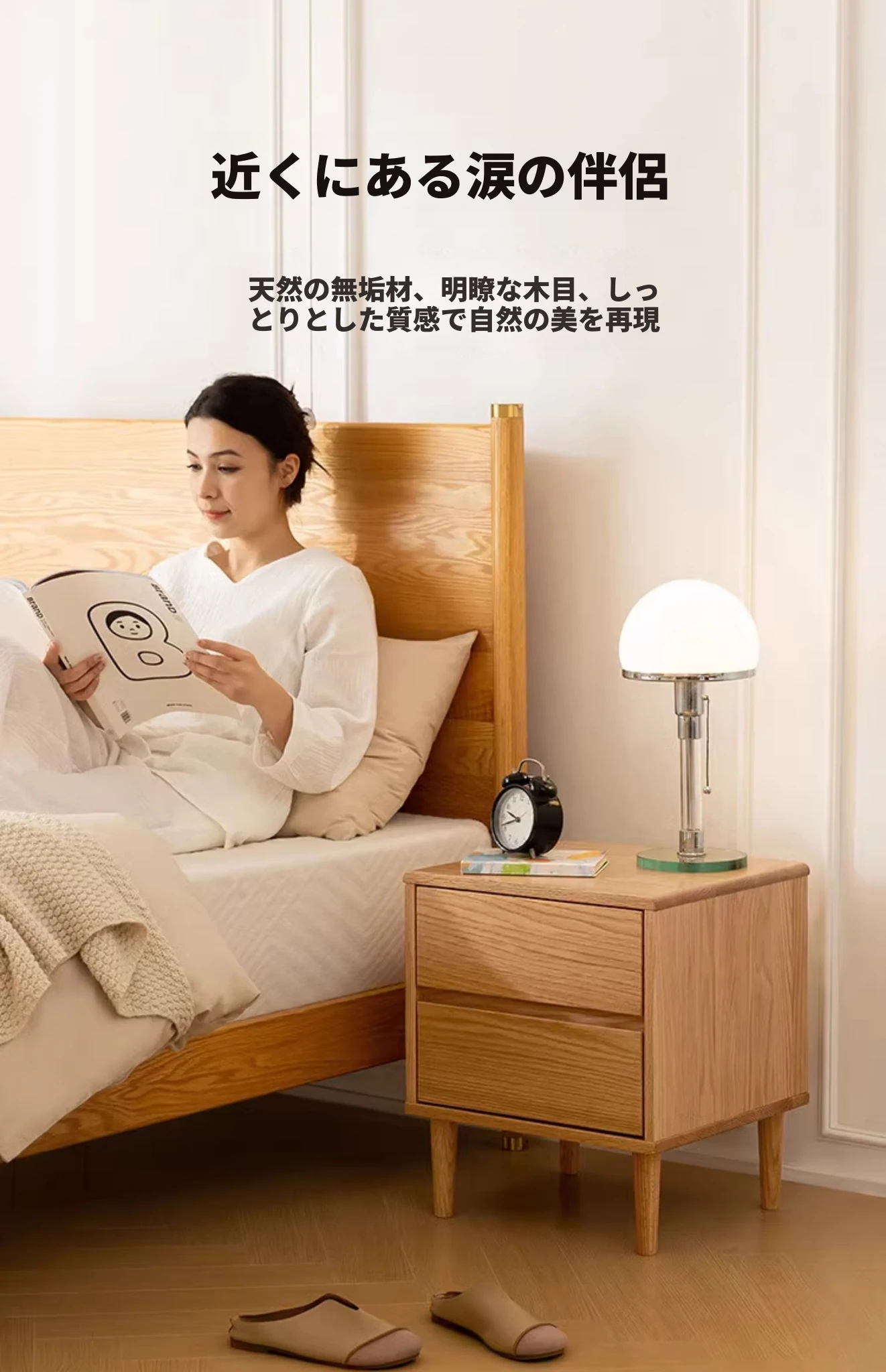 北欧モダンスタイルのシンプル全木製ナイトテーブル|おしゃれで機能的な収納兼用ドロワー付き|オーク材のベッドサイドキャビネットで、洗練された寝室空間を演出!