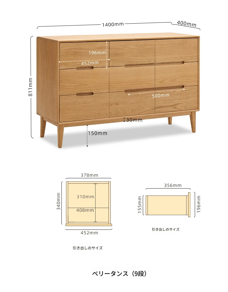 ナチュラルウッドカラー - 幅九段チェスト 1400*400*811mm