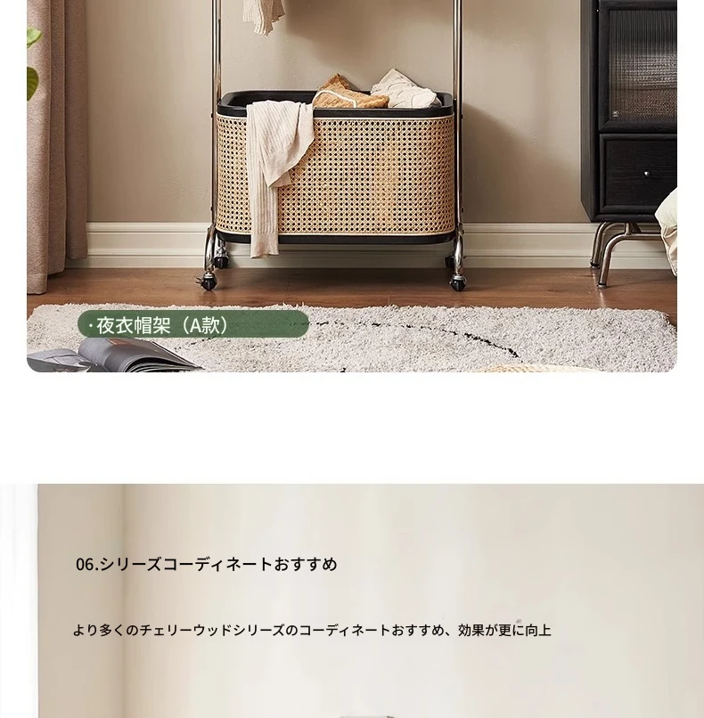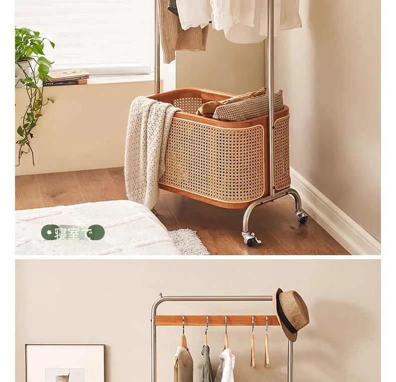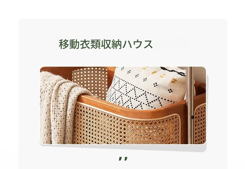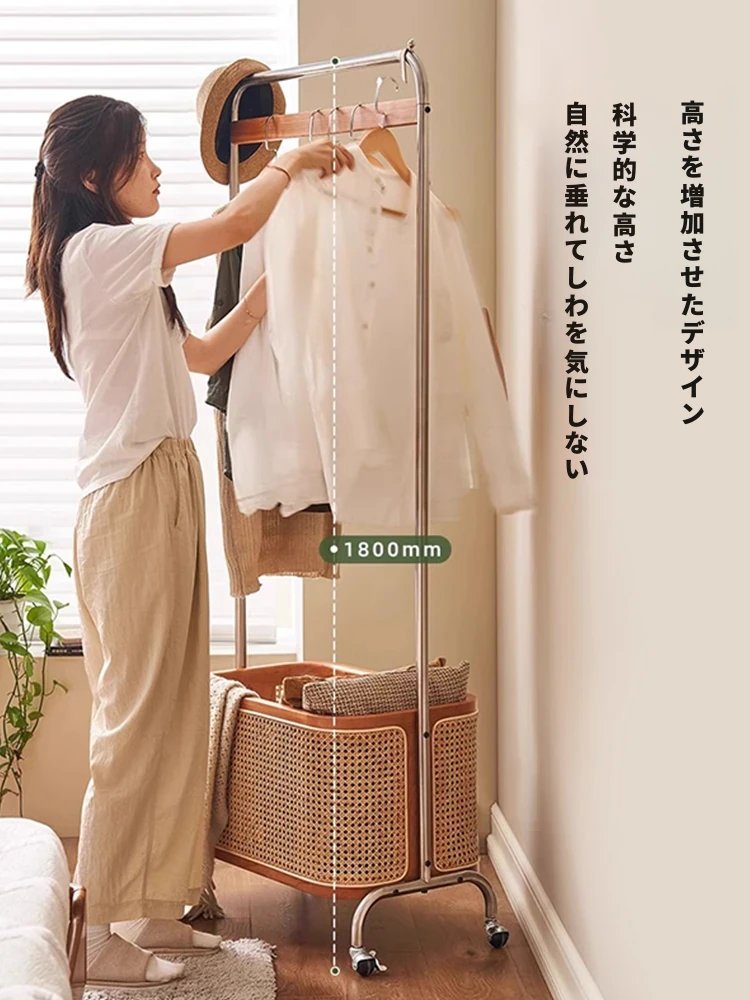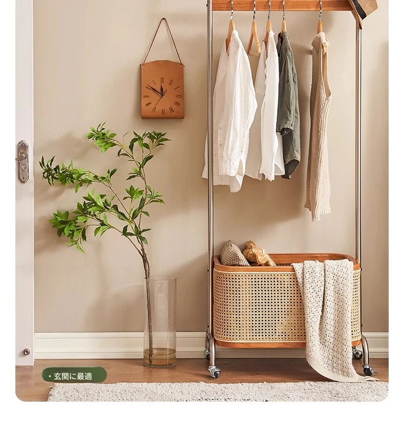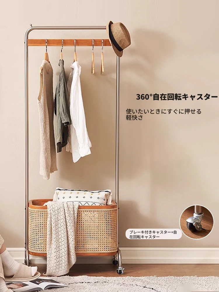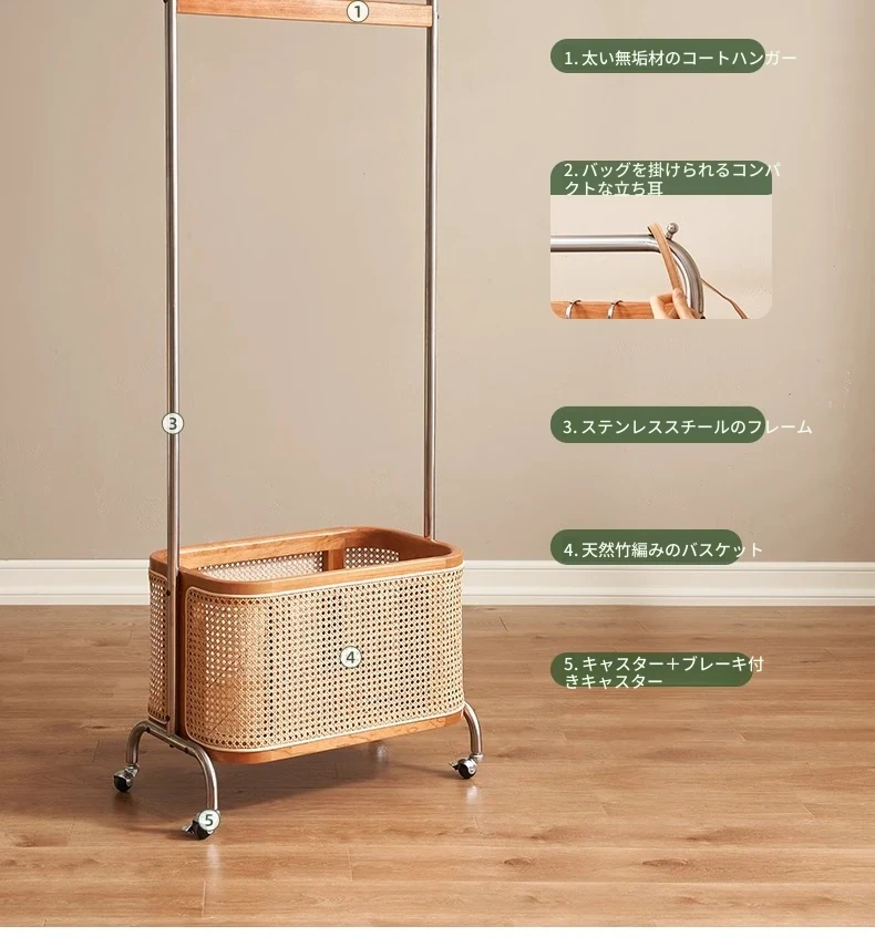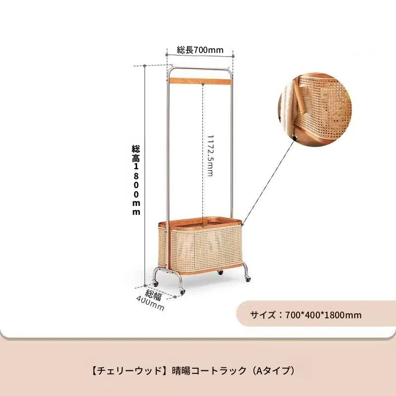 北欧デザインの天然木製コートハンガー - チェリーウッドとバスケット編みのスタイリッシュな収納ラック。おしゃれで便利な移動式ハンガー、寝室やリビングにぴったり!衣類を美しくディスプレイし、スッキリと整理整頓。