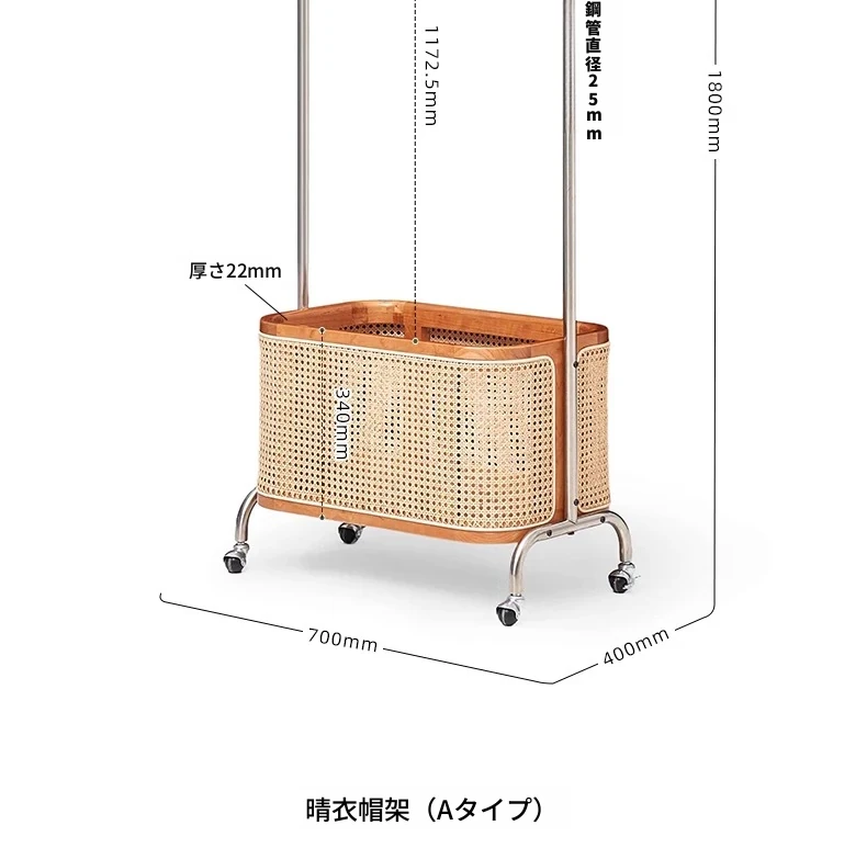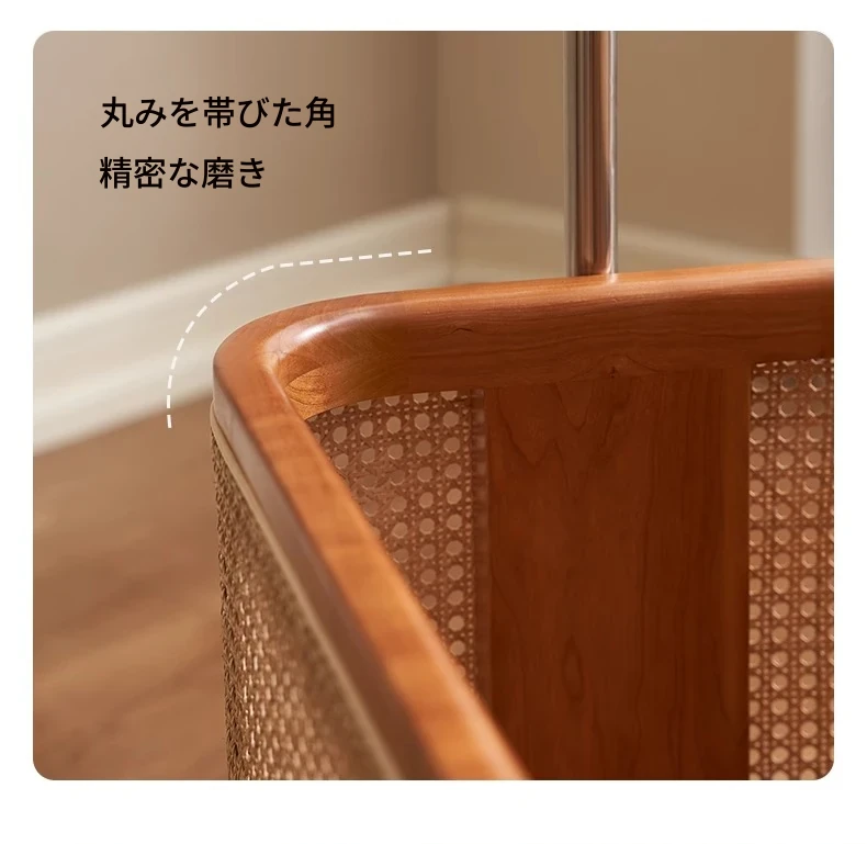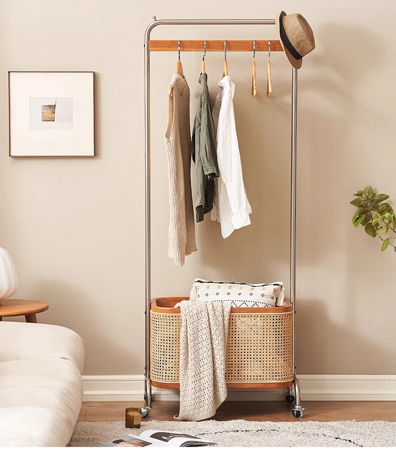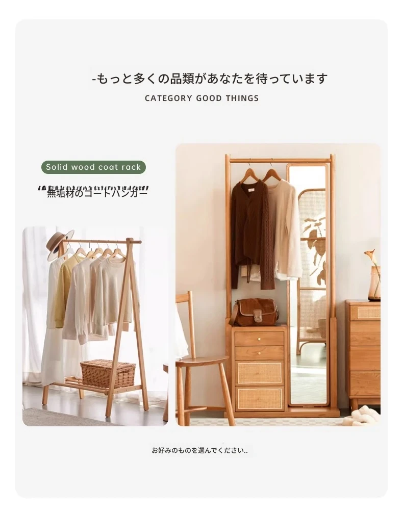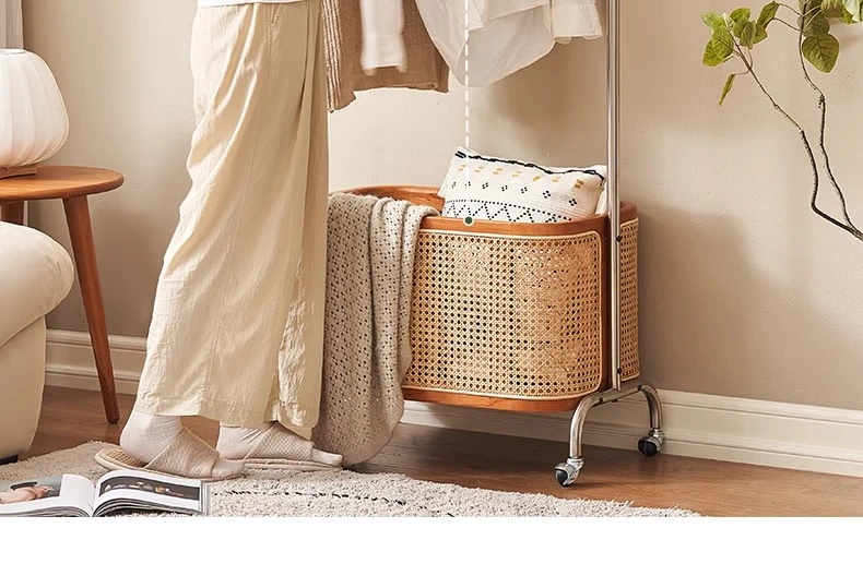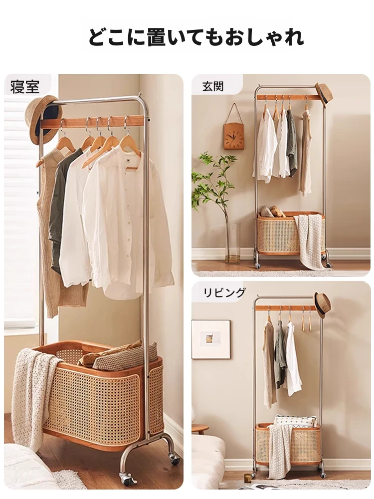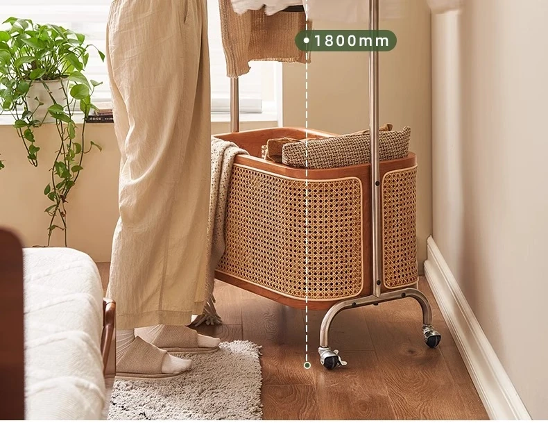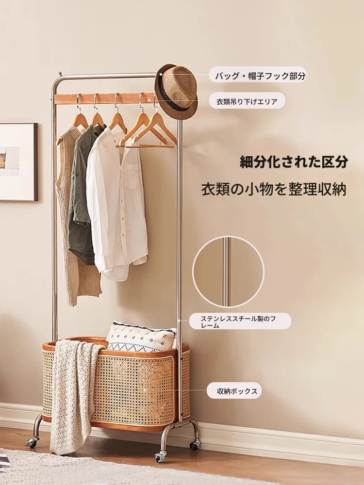 北欧デザインの天然木製コートハンガー - チェリーウッドとバスケット編みのスタイリッシュな収納ラック。おしゃれで便利な移動式ハンガー、寝室やリビングにぴったり!衣類を美しくディスプレイし、スッキリと整理整頓。