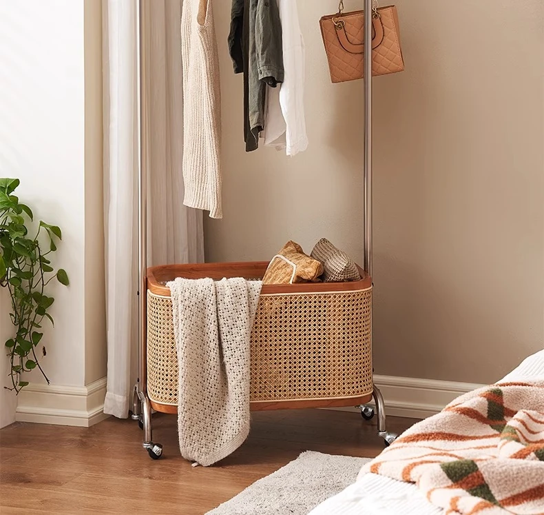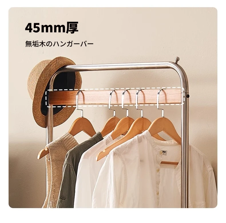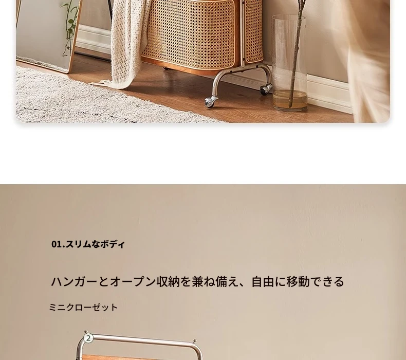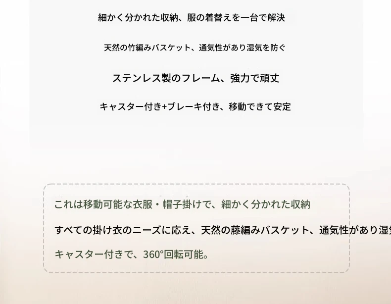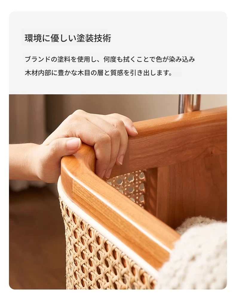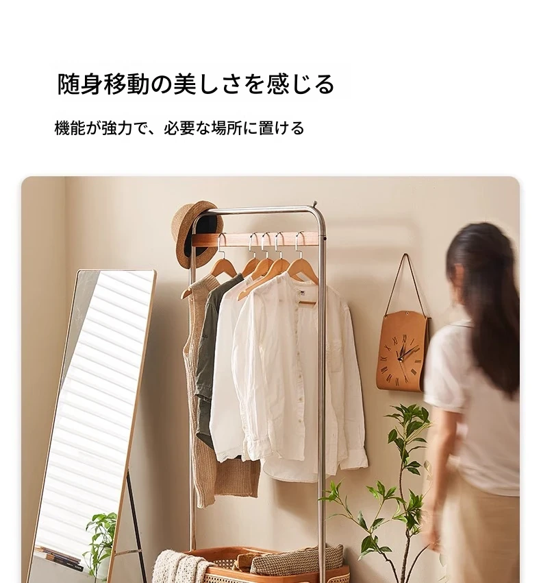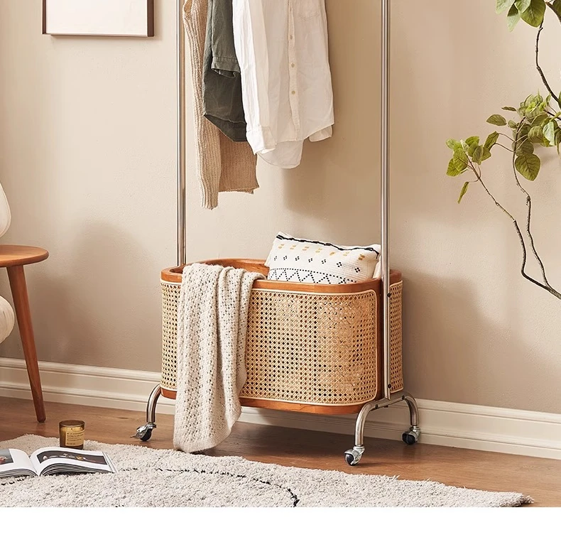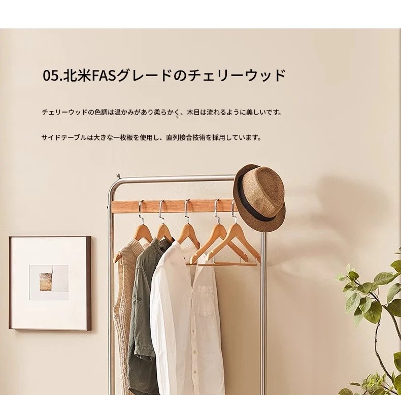 北欧デザインの天然木製コートハンガー - チェリーウッドとバスケット編みのスタイリッシュな収納ラック。おしゃれで便利な移動式ハンガー、寝室やリビングにぴったり!衣類を美しくディスプレイし、スッキリと整理整頓。