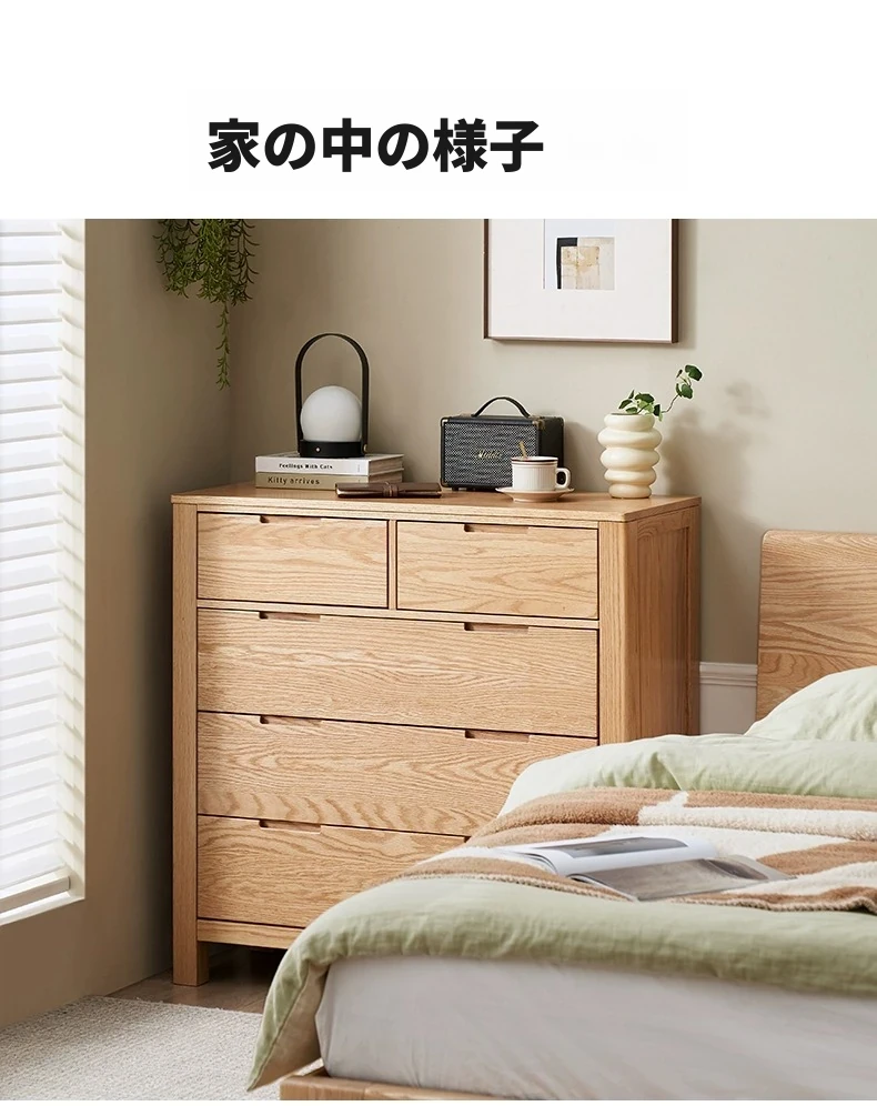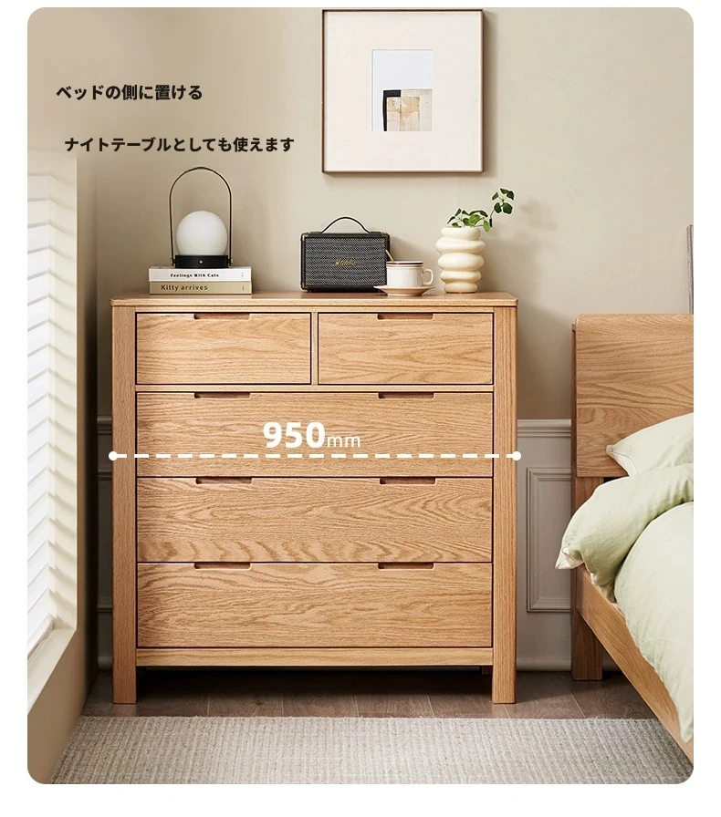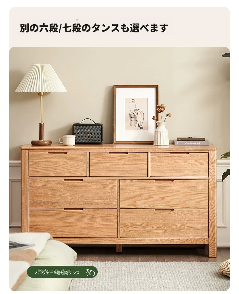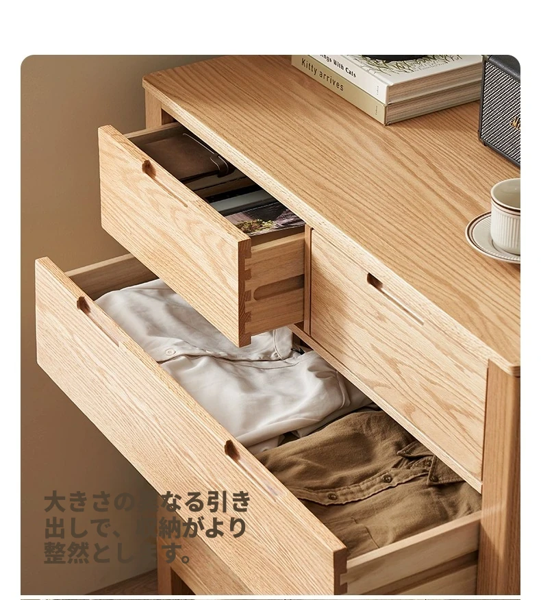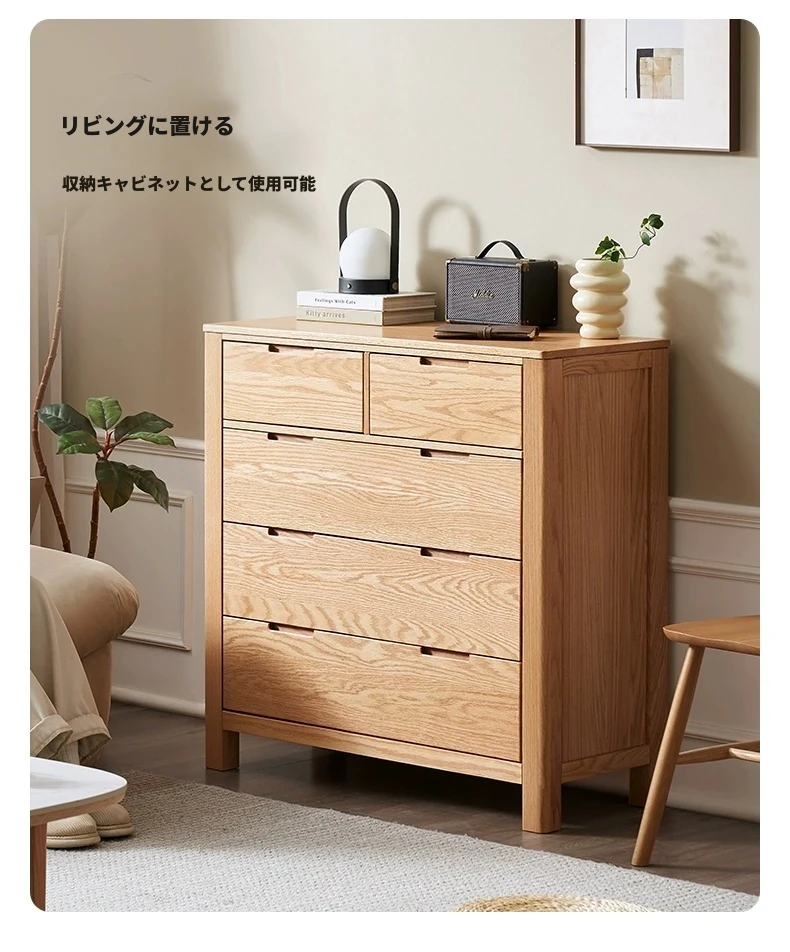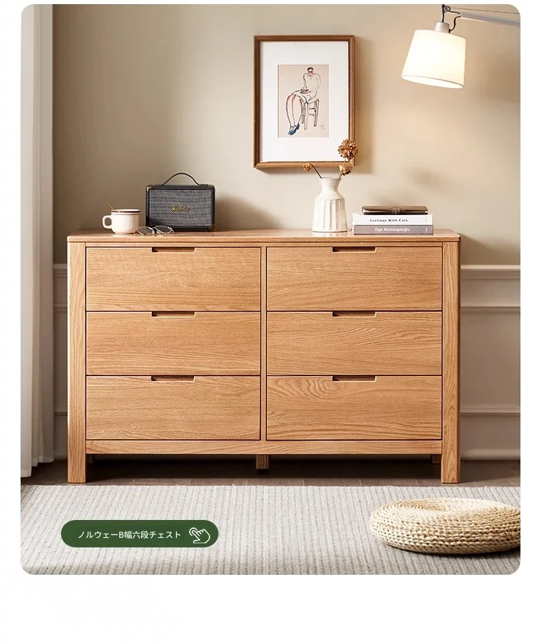 北欧スタイルの無垢材チェスト - 小型居住空間に最適なオーク製収納キャビネット。整理整頓が容易で、美しいデザインがインテリアを引き立てる!おしゃれな6段タンスでお部屋をすっきり。