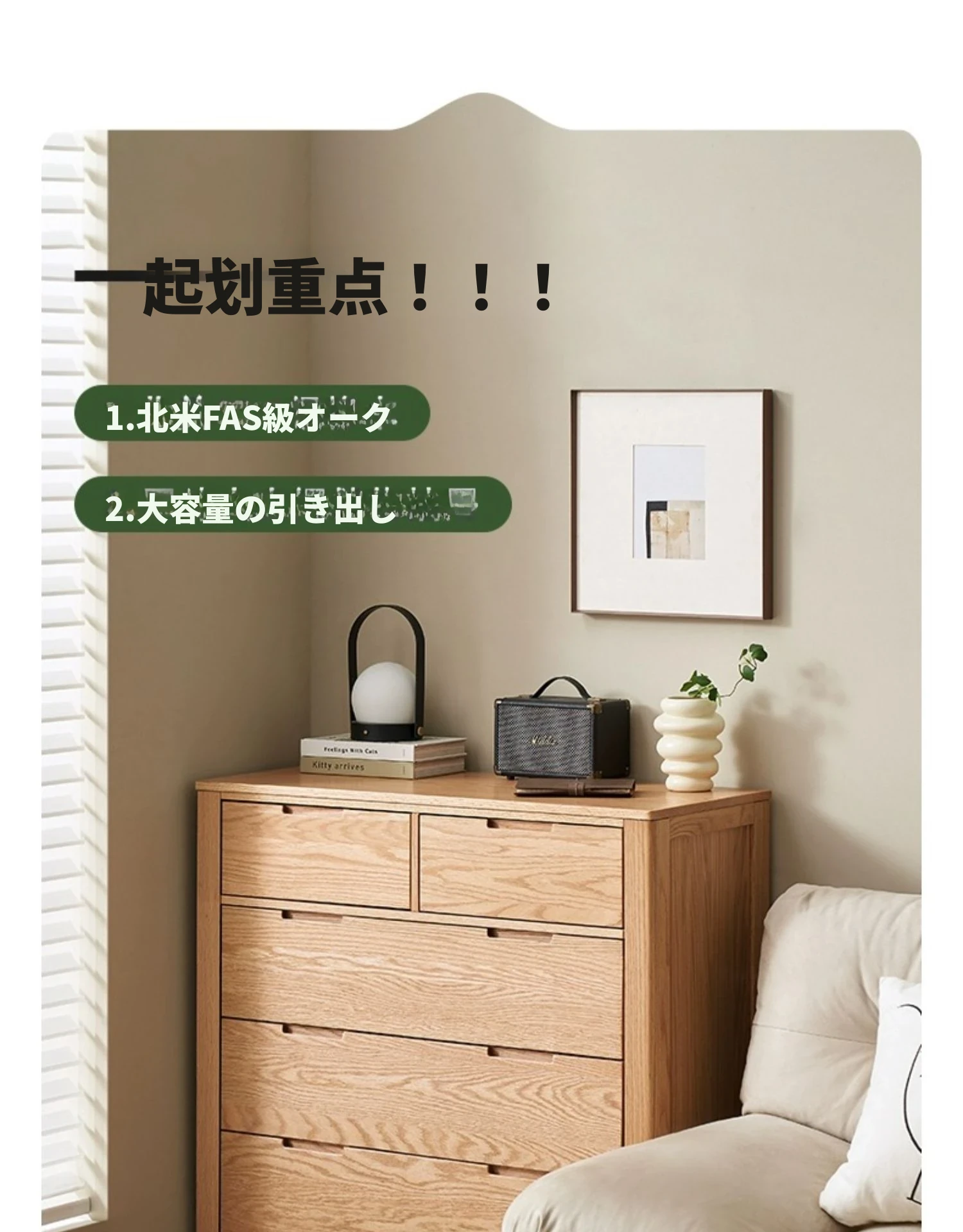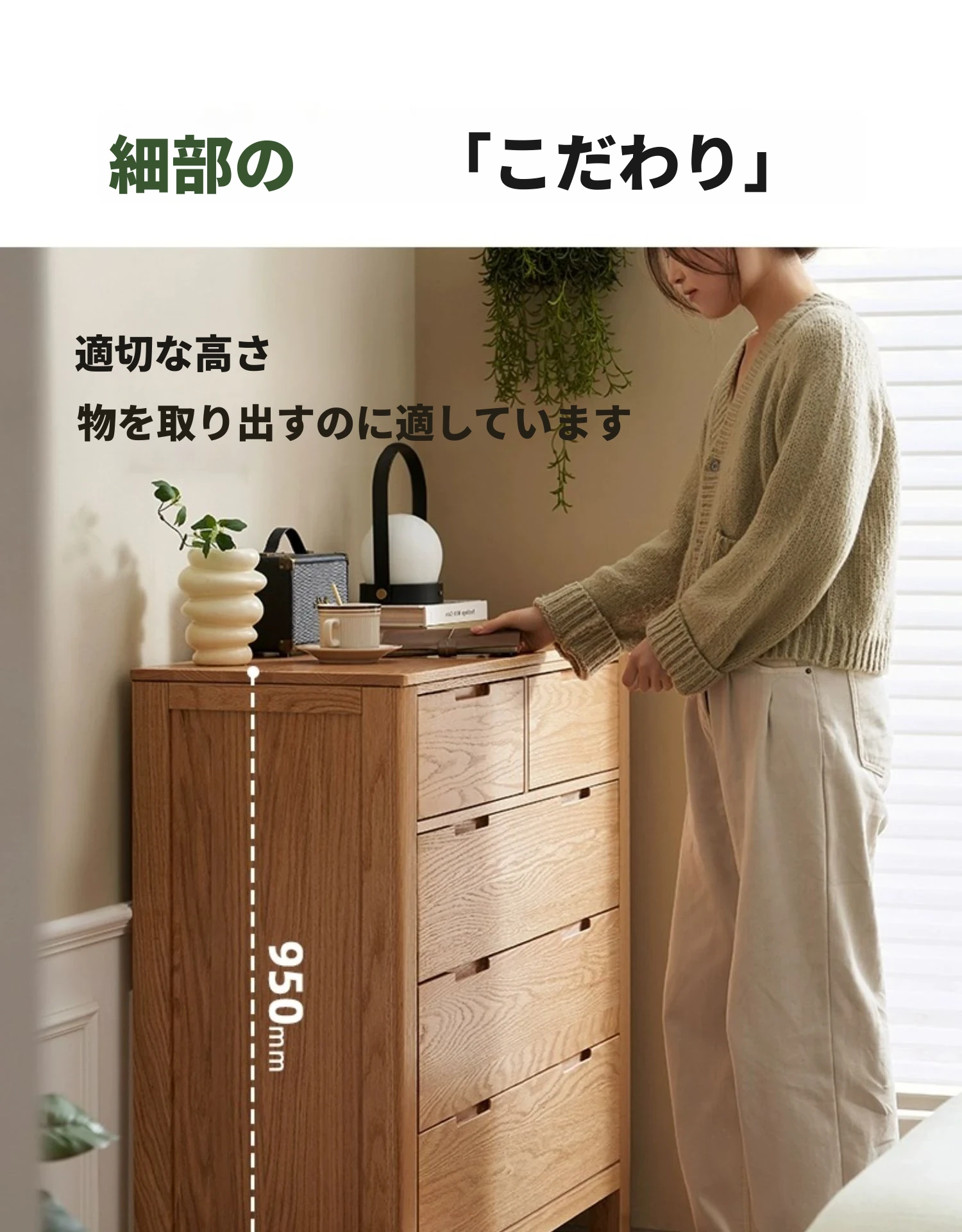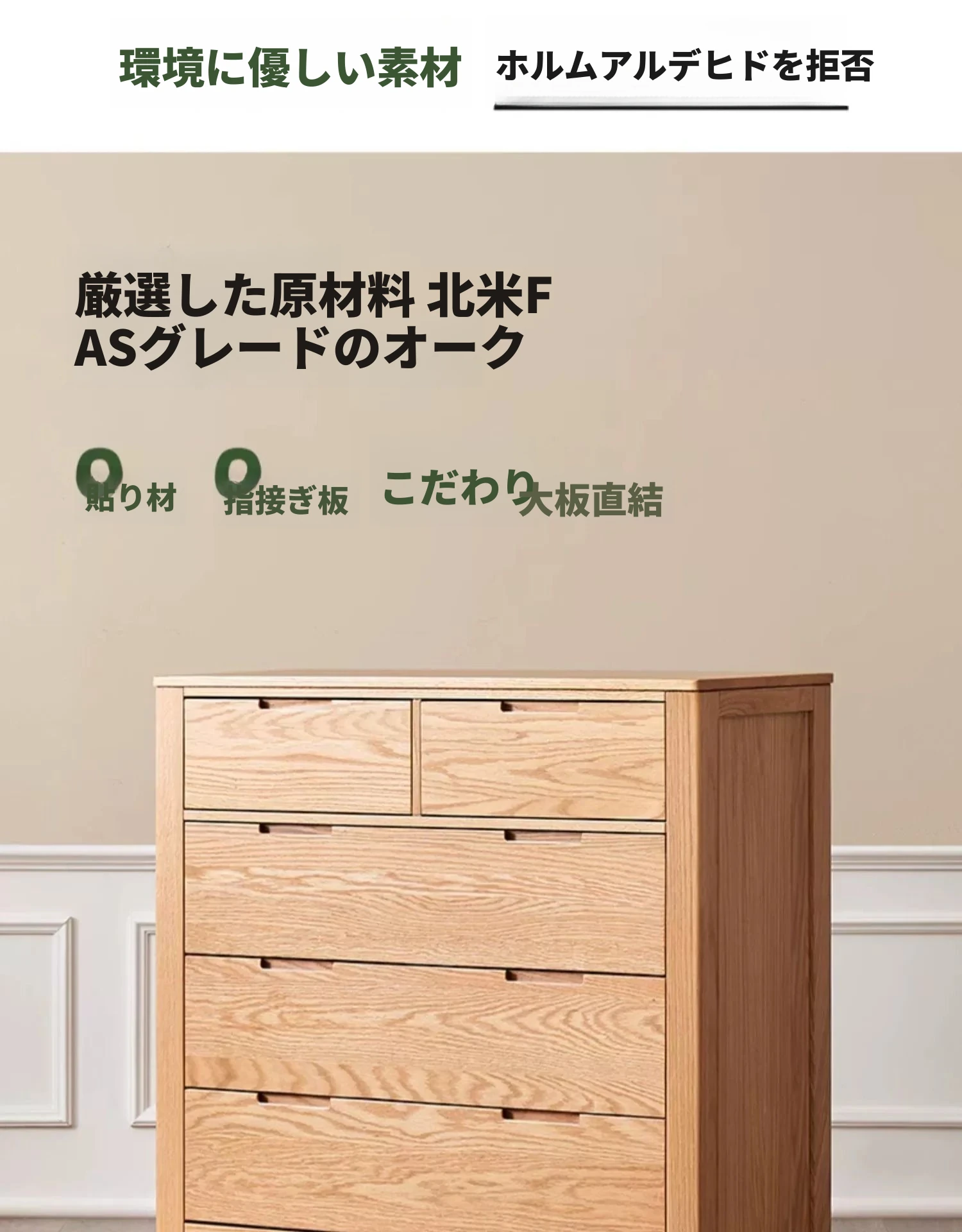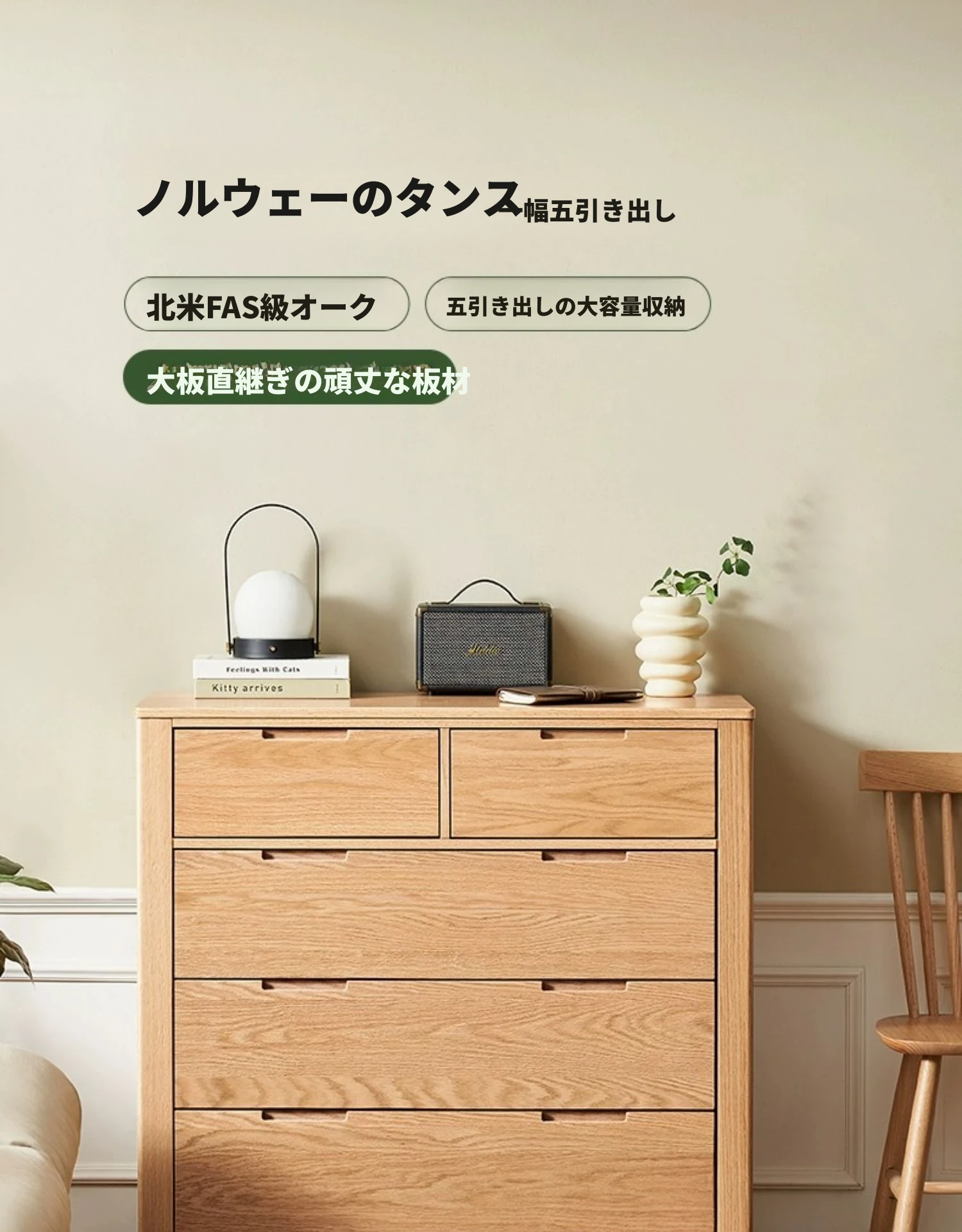 北欧スタイルの無垢材チェスト - 小型居住空間に最適なオーク製収納キャビネット。整理整頓が容易で、美しいデザインがインテリアを引き立てる!おしゃれな6段タンスでお部屋をすっきり。