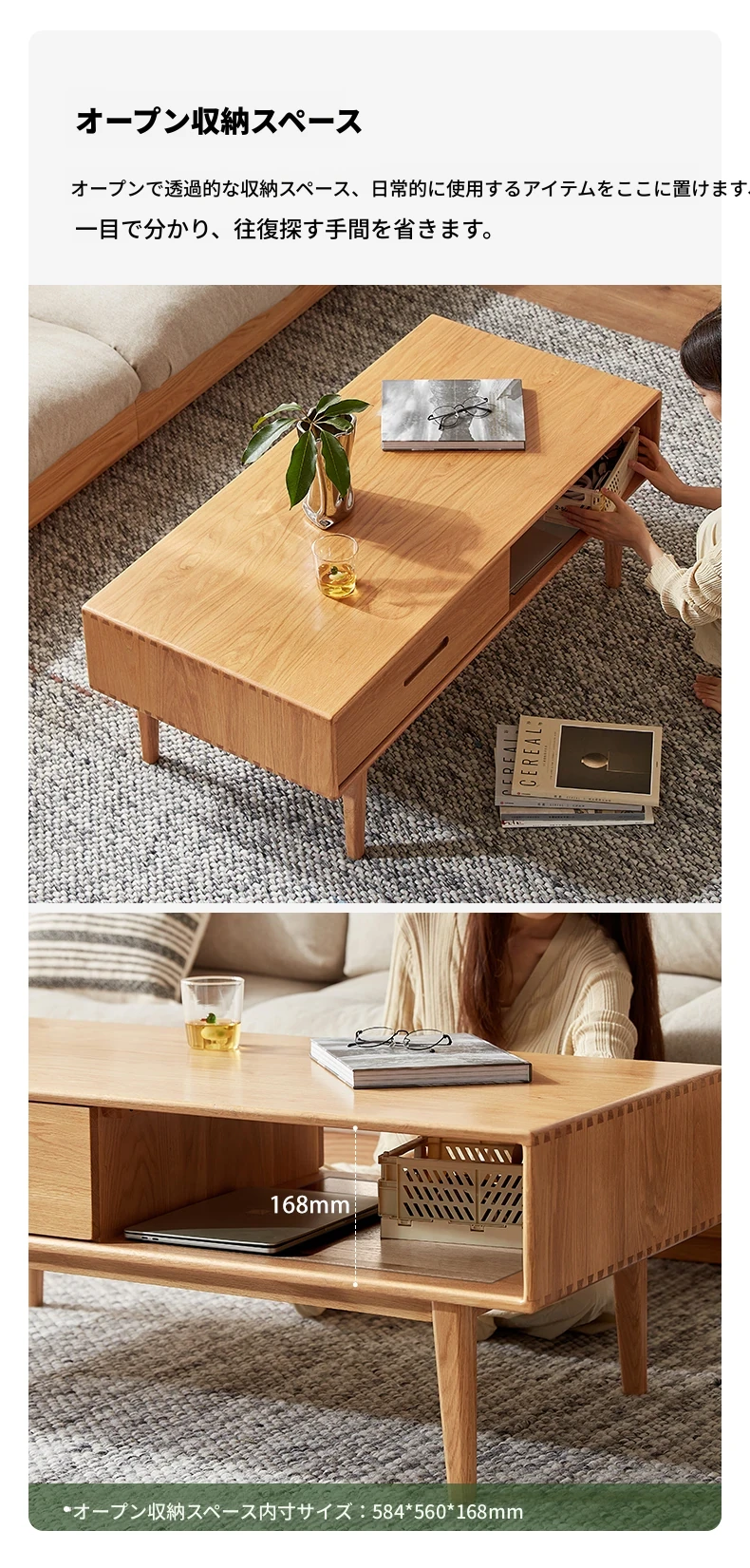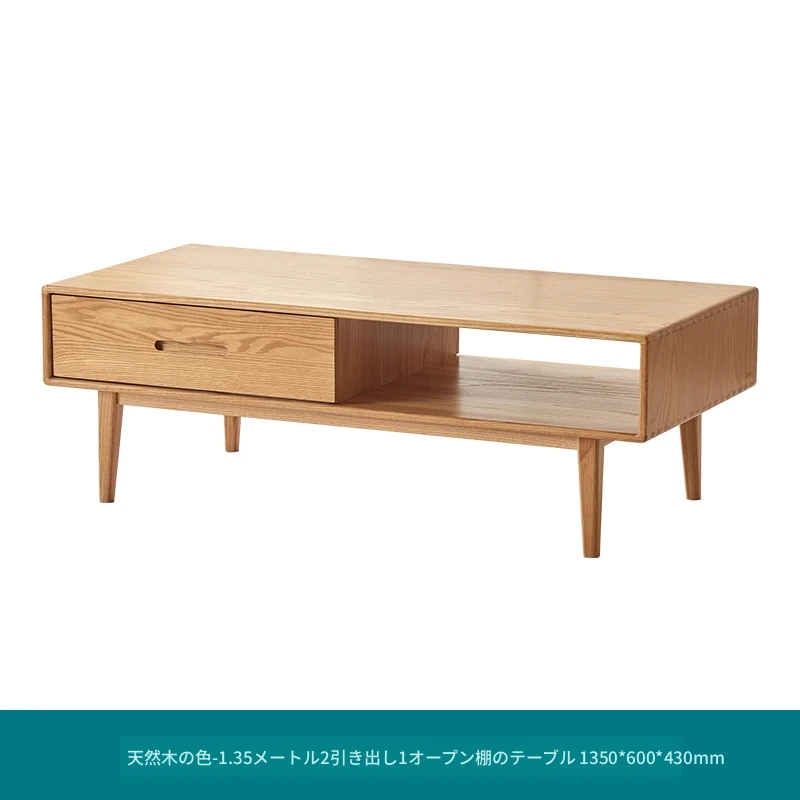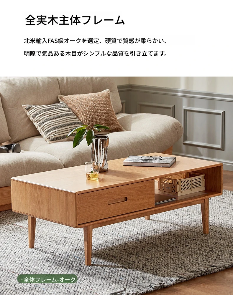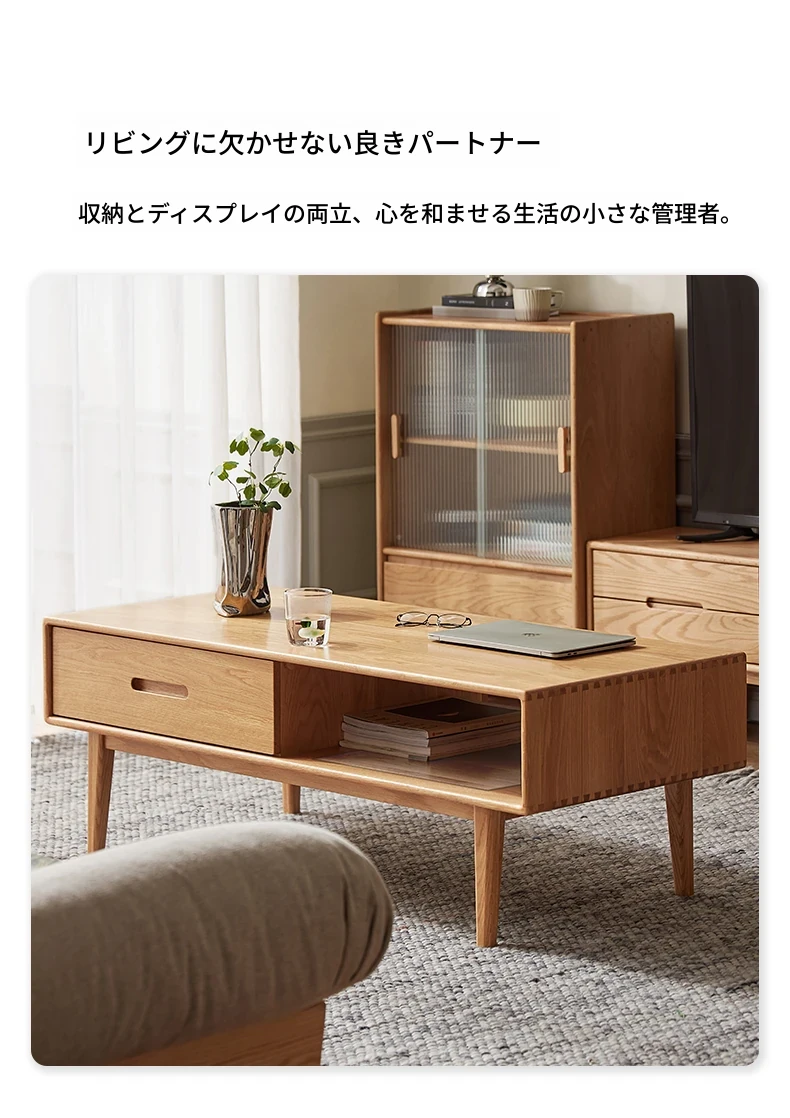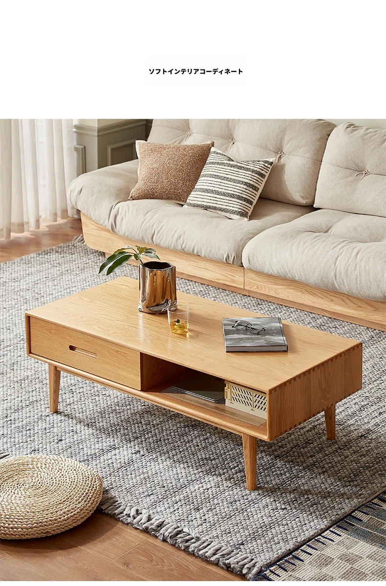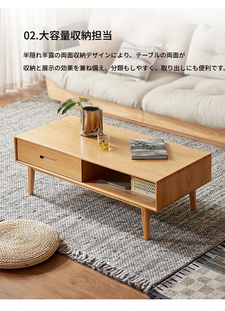 北欧風のシンプルな無垢材のコーヒーテーブル - 小さなリビングにぴったりなオーク製の収納付きティーテーブル!おしゃれなデザインで、くつろぎのひとときを演出します。