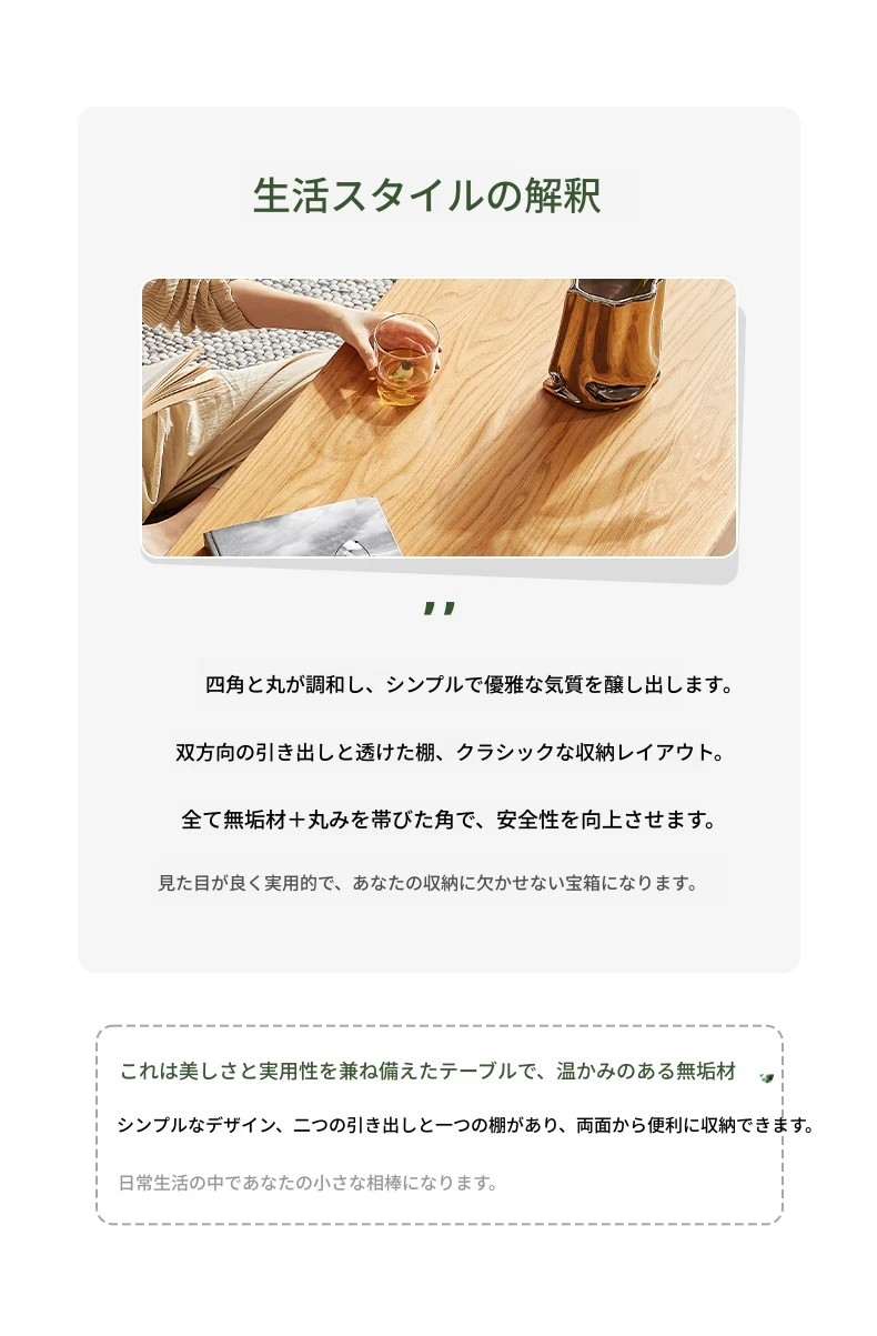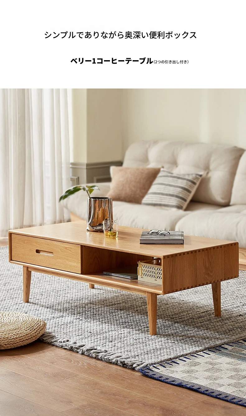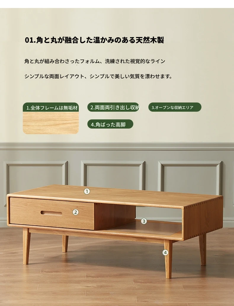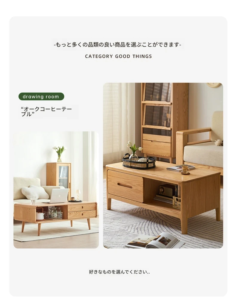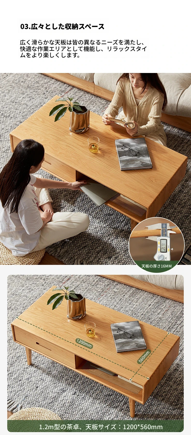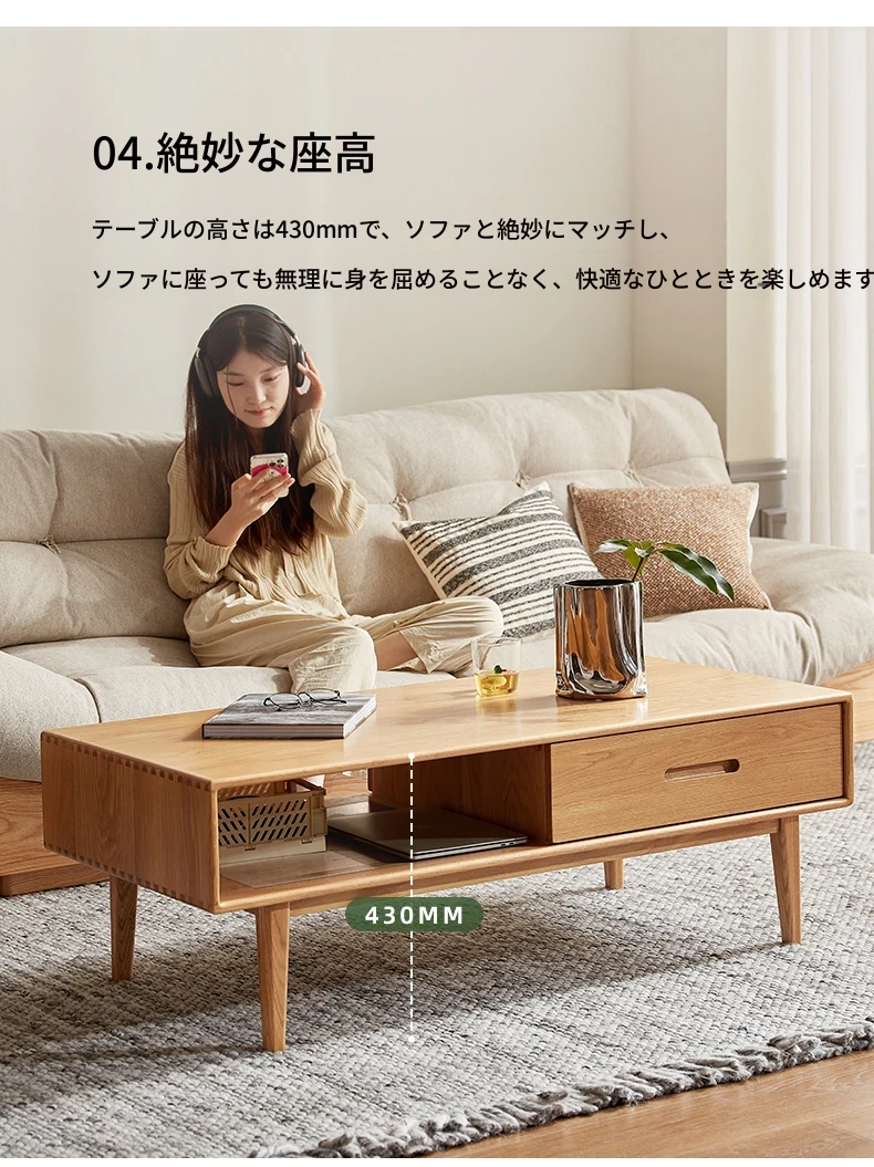 北欧風のシンプルな無垢材のコーヒーテーブル - 小さなリビングにぴったりなオーク製の収納付きティーテーブル!おしゃれなデザインで、くつろぎのひとときを演出します。