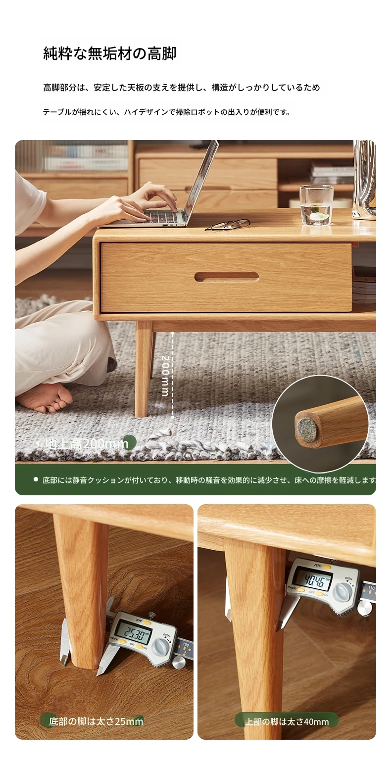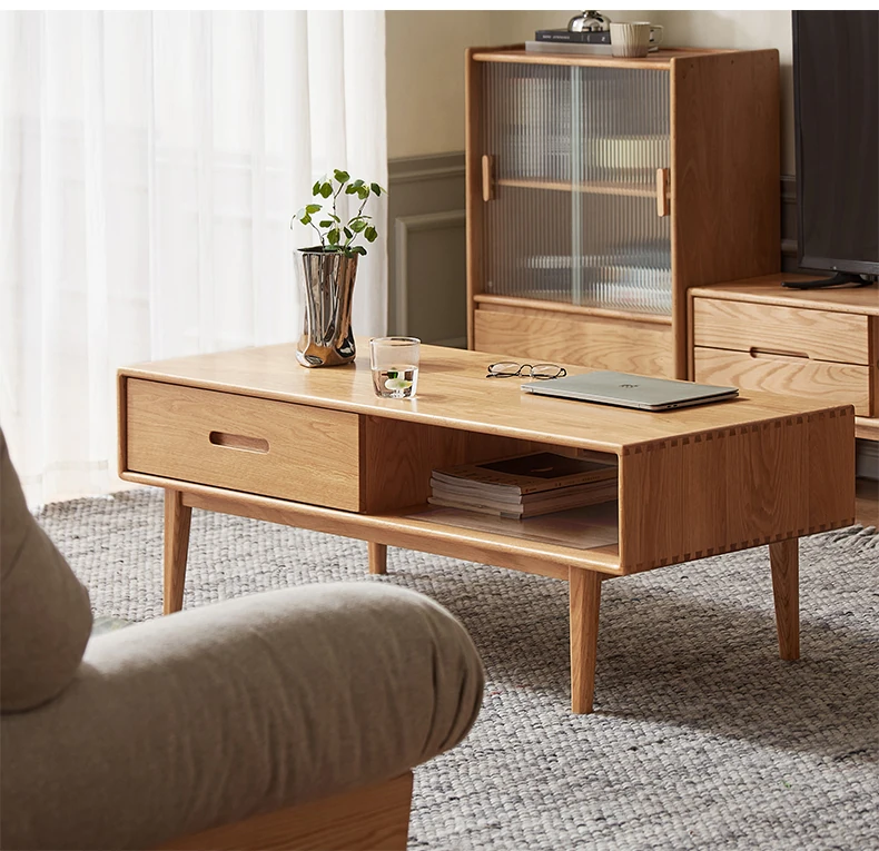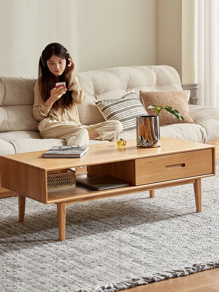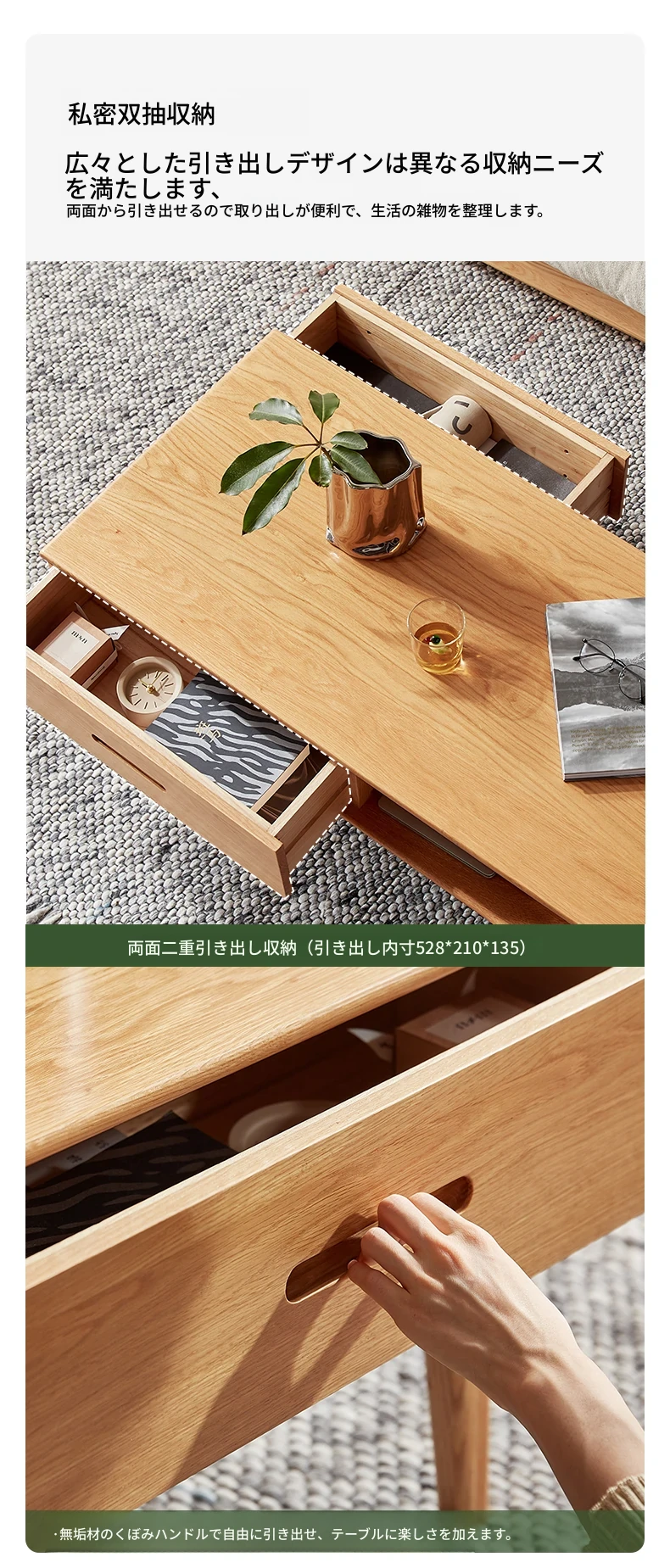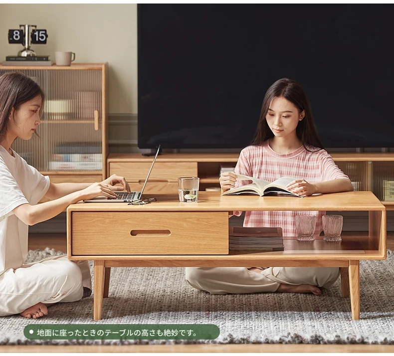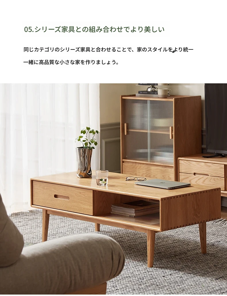 北欧風のシンプルな無垢材のコーヒーテーブル - 小さなリビングにぴったりなオーク製の収納付きティーテーブル!おしゃれなデザインで、くつろぎのひとときを演出します。