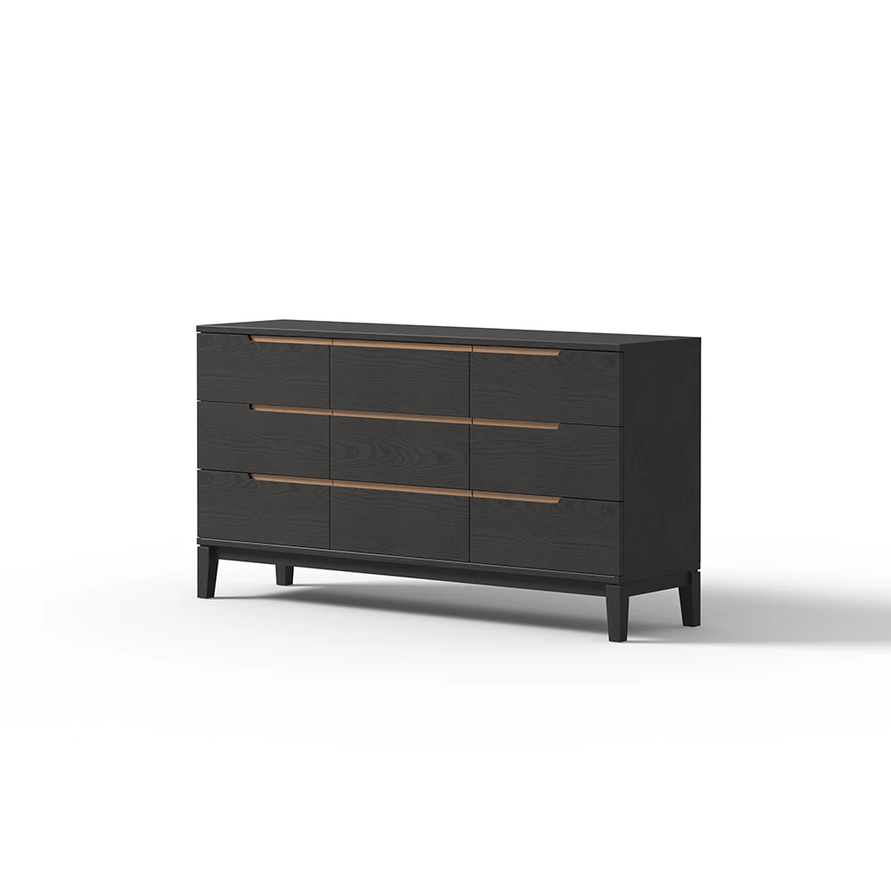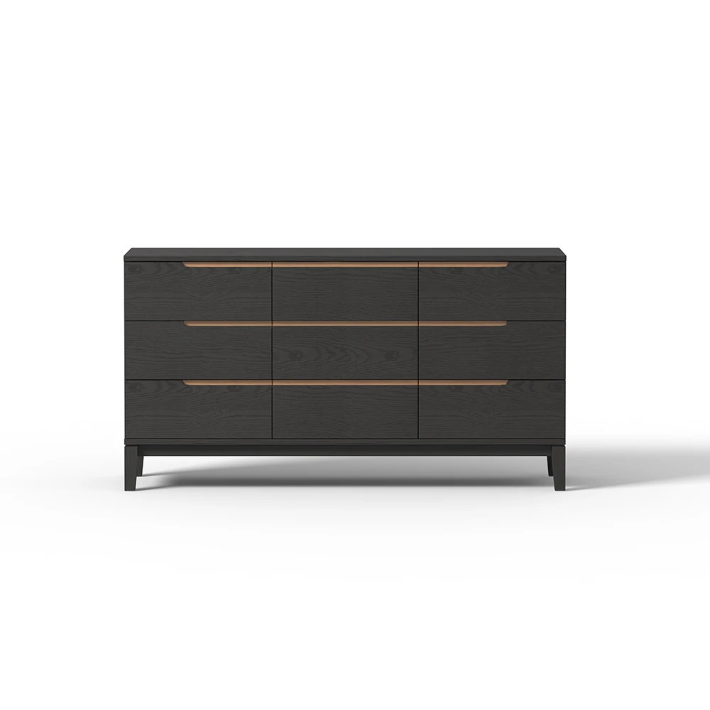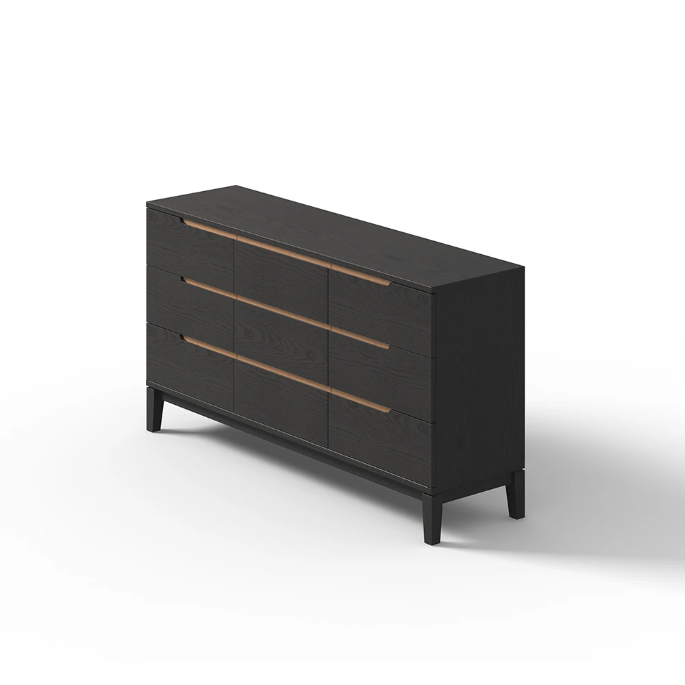 全実木のシンプルなナインドロワーチェスト!寝室にぴったりな収納キャビネット、壁に寄せて使えるデザイン。黒色の赤オーク材を使用したスタイリッシュな引き出し収納で、お部屋をすっきり整理整頓!