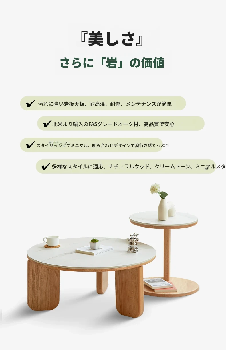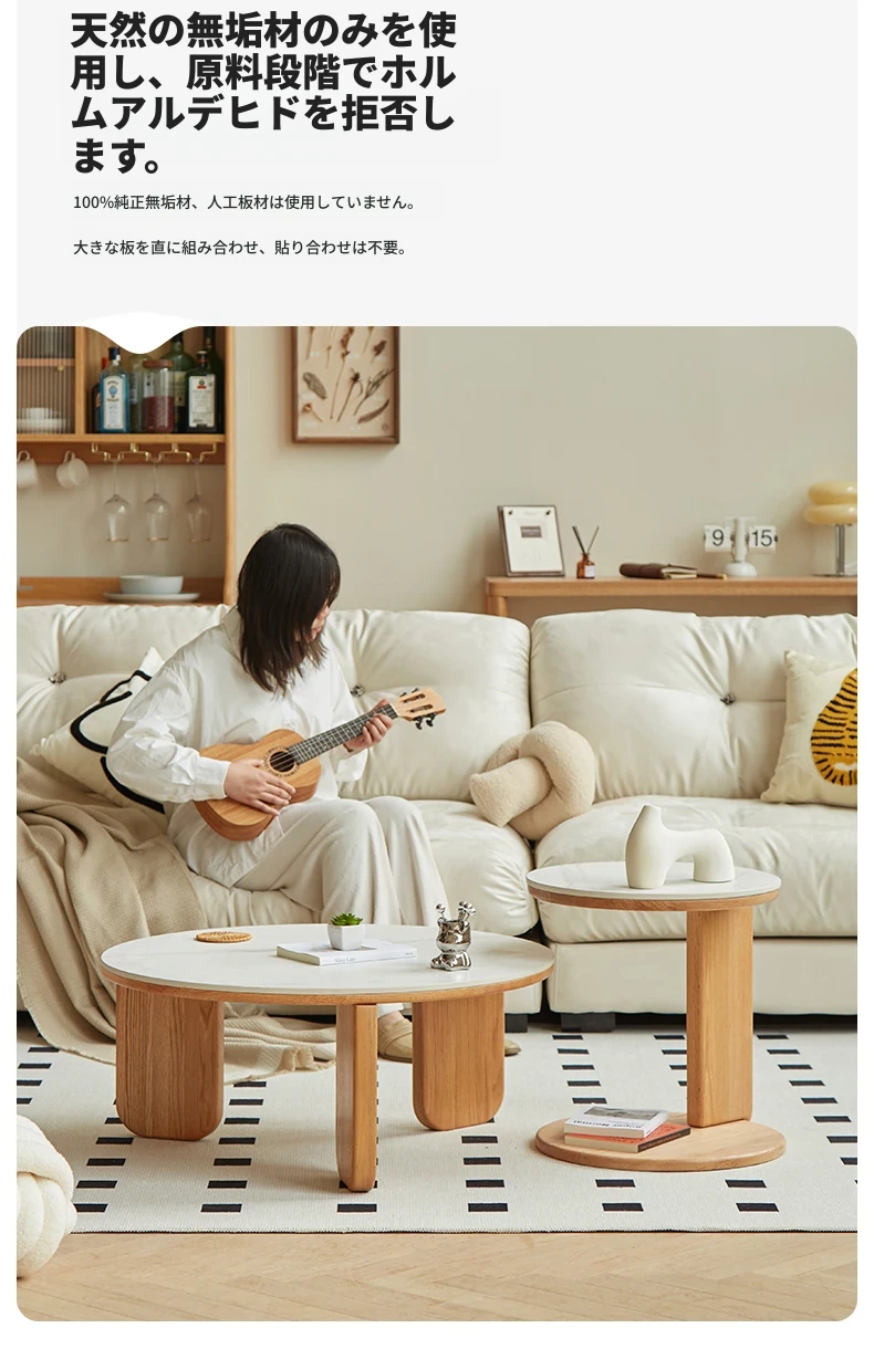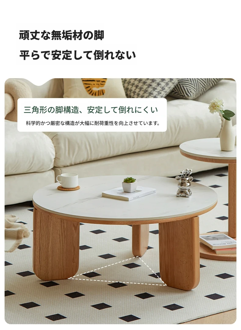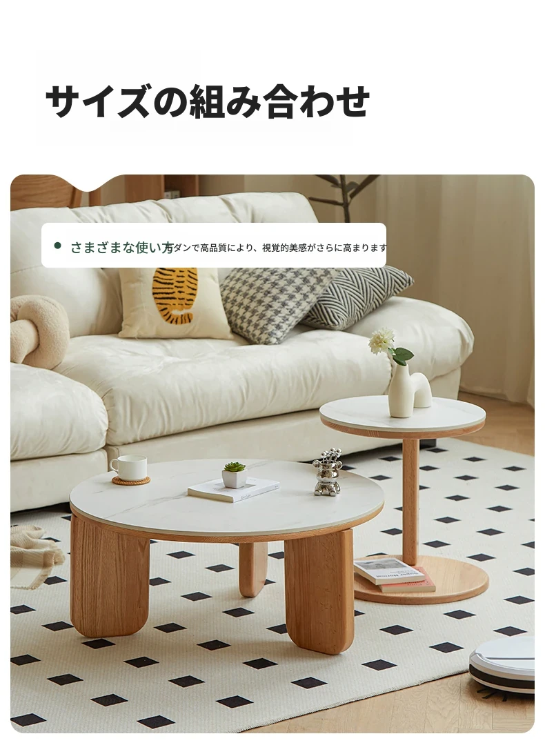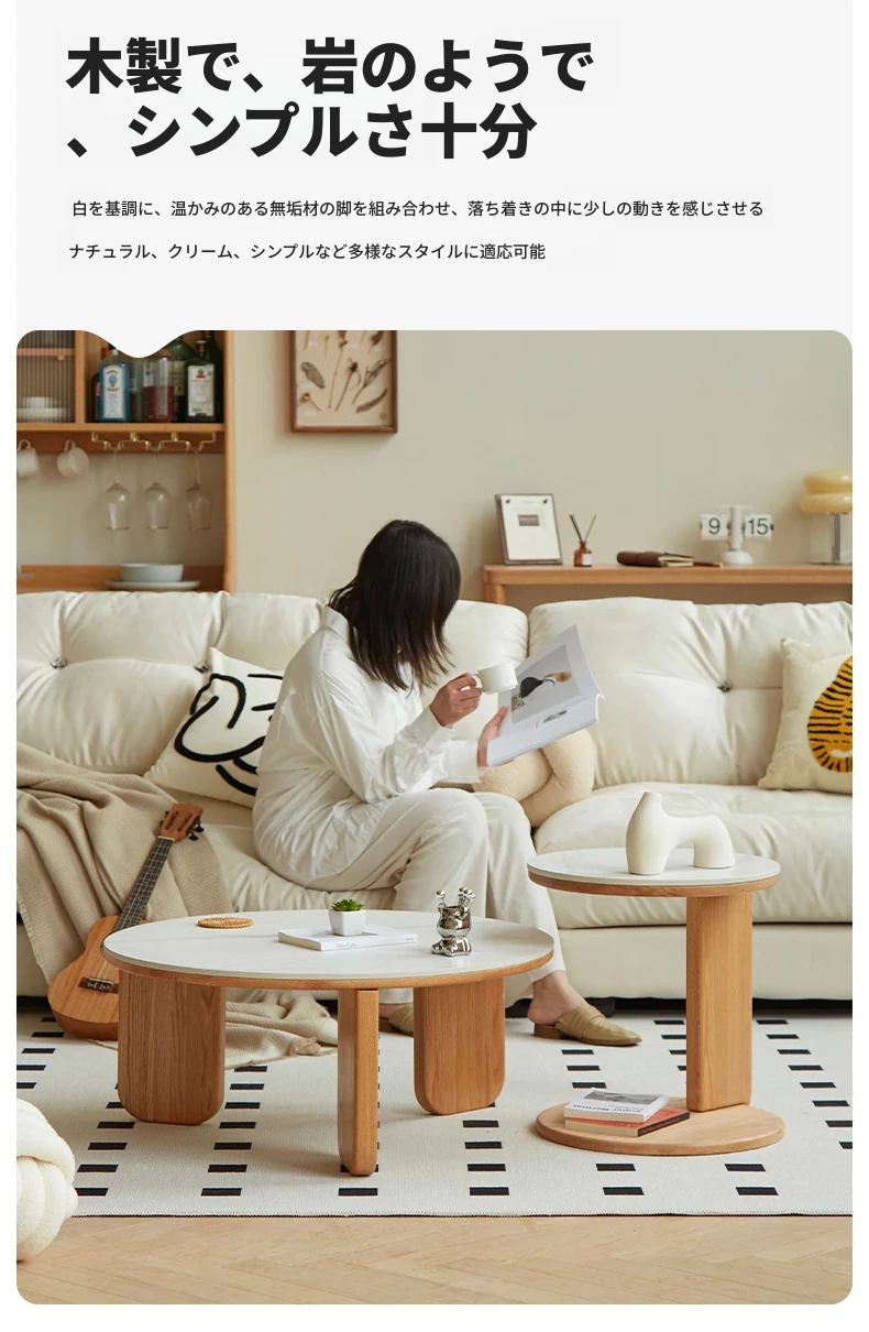 北欧風デザインの無垢材ロックテーブル - 小さなお部屋にぴったりなモダンでシンプルなサイドテーブル、円形のコンビネーションでおしゃれなティータイムを演出!