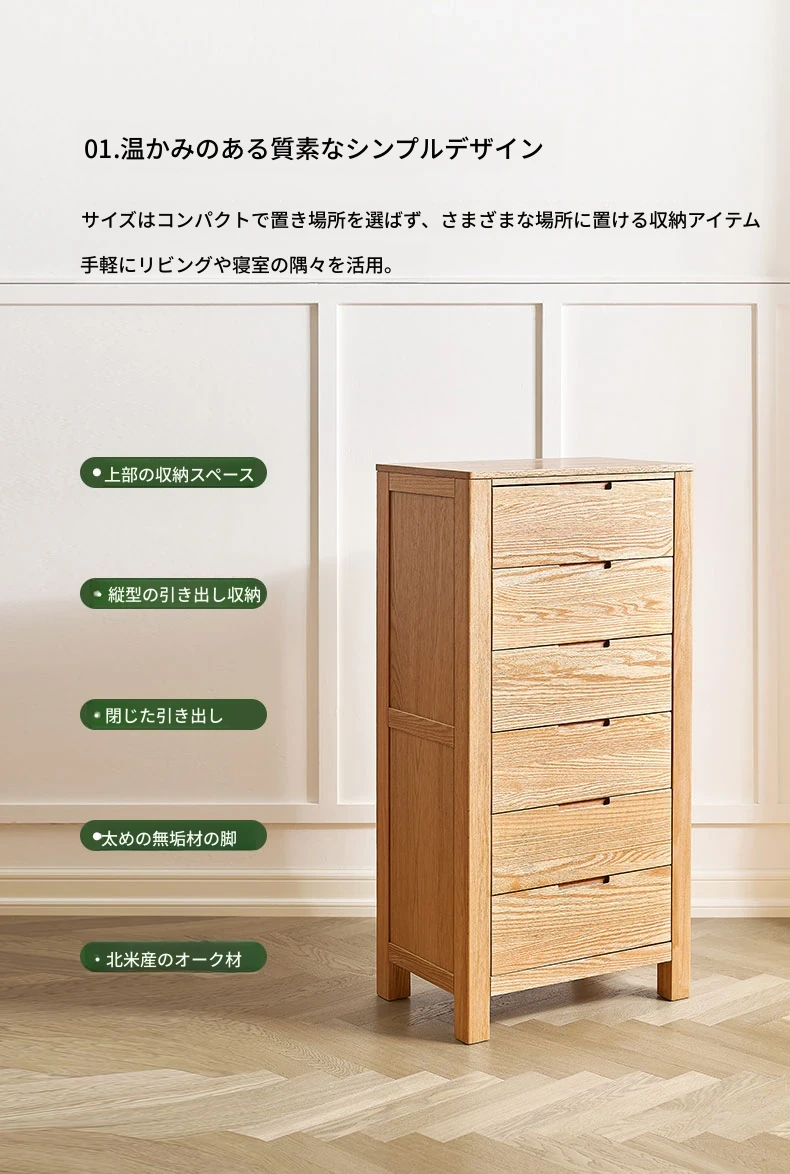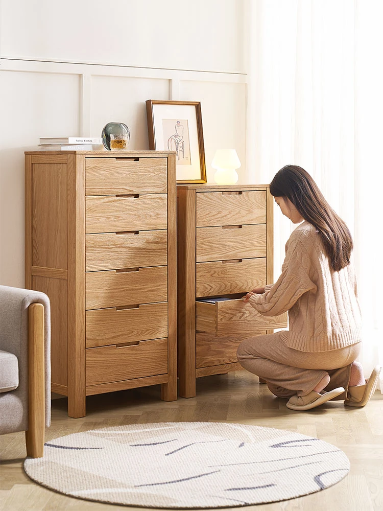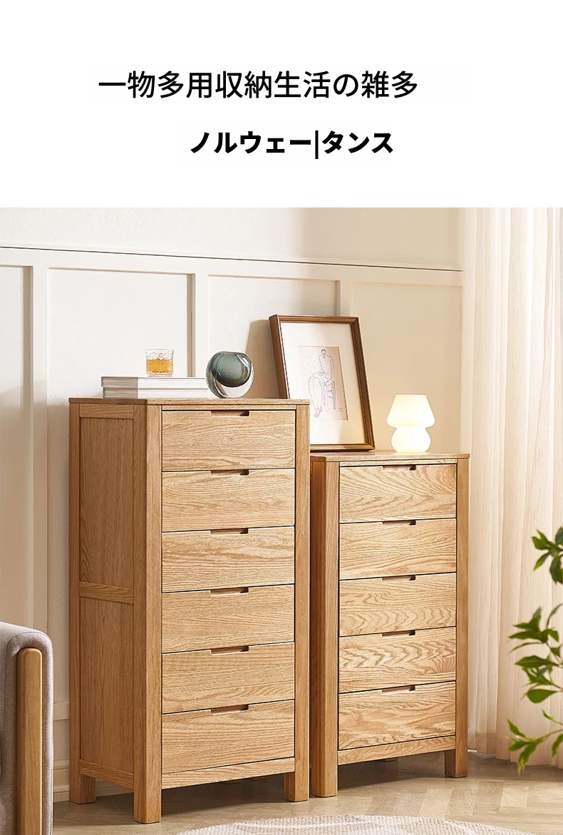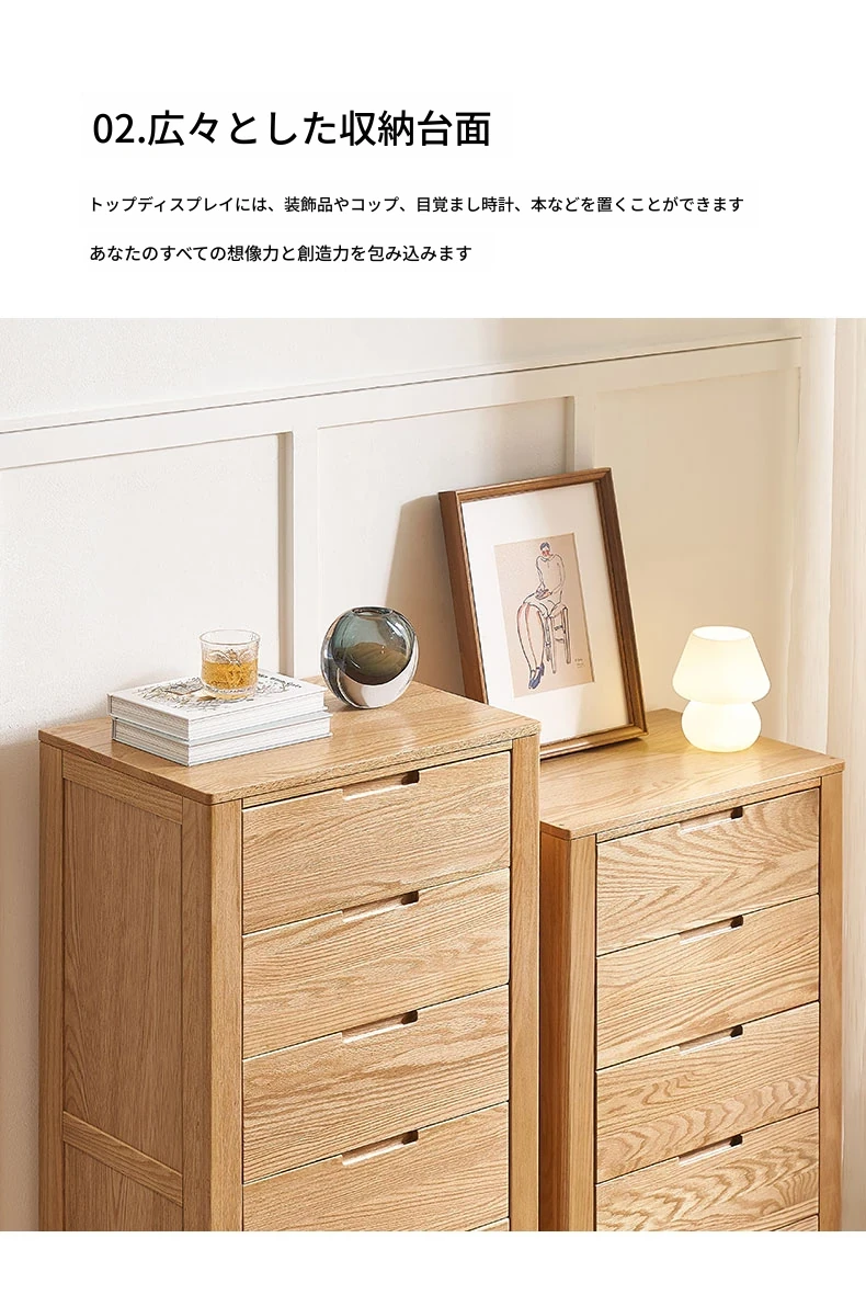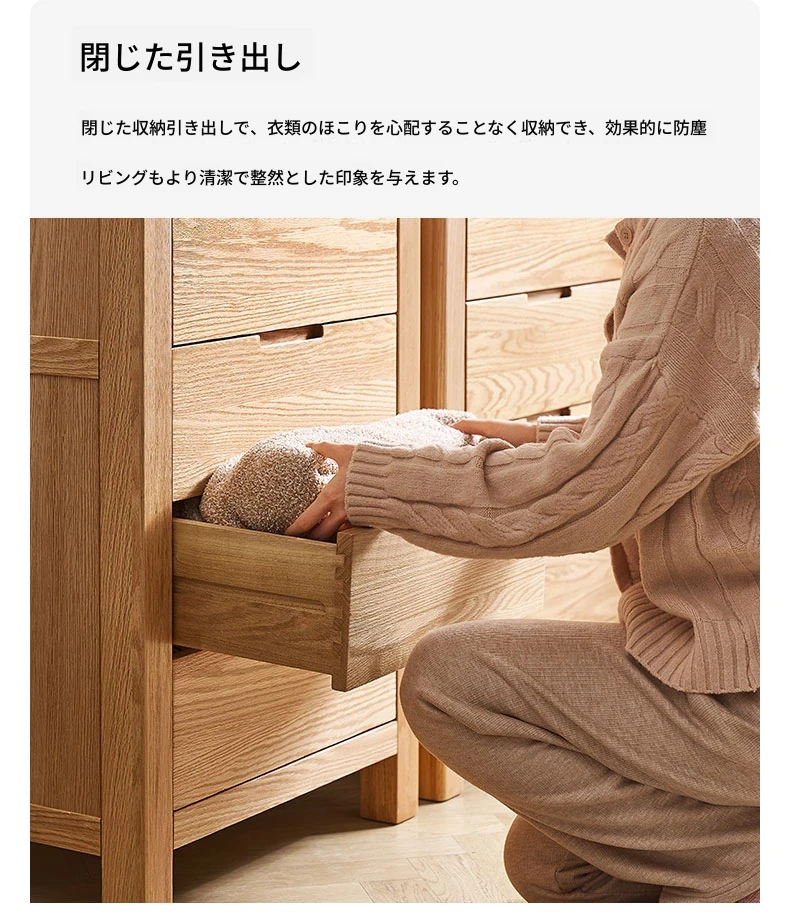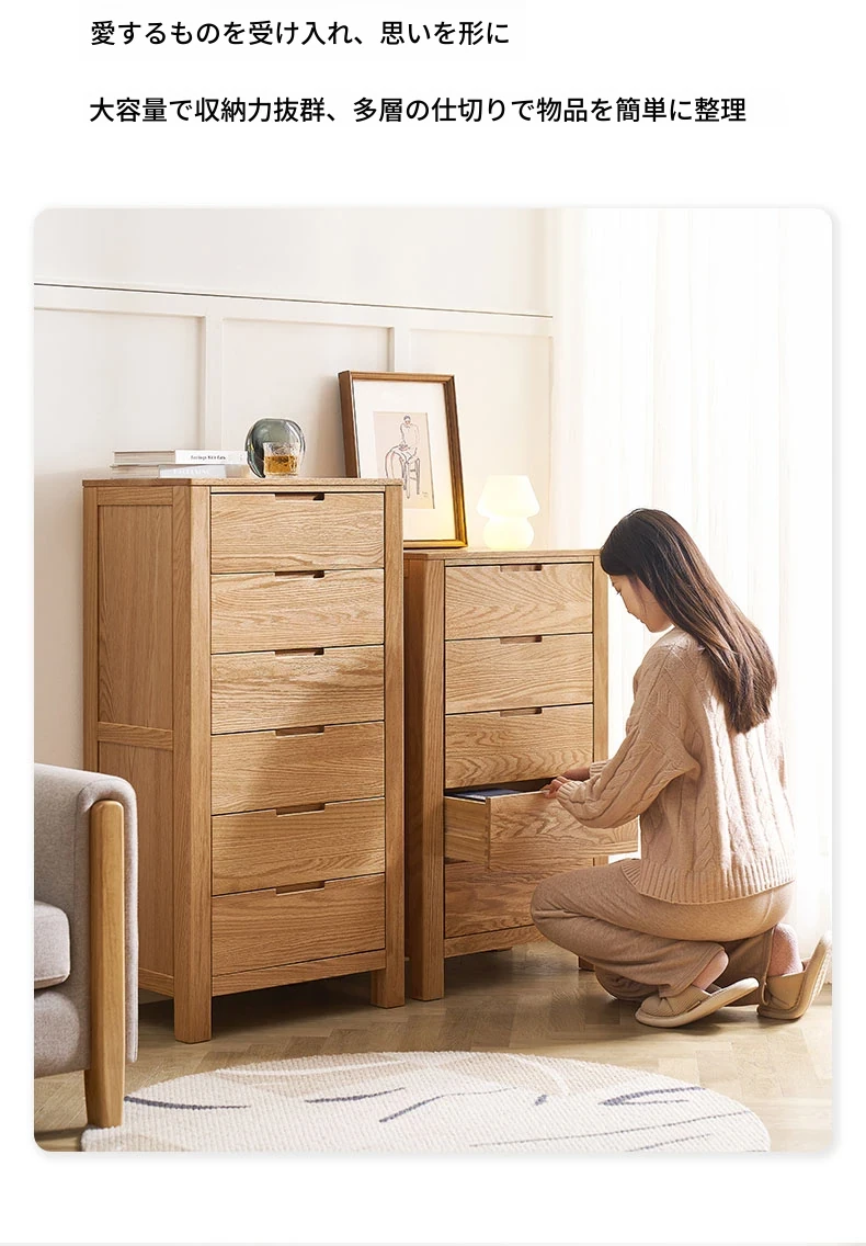 北欧スタイルの全実木製セブンチェスト - モダンでシンプルなオーク収納キャビネット、寝室や家庭に最適な天然素材の美しさを引き立てる。