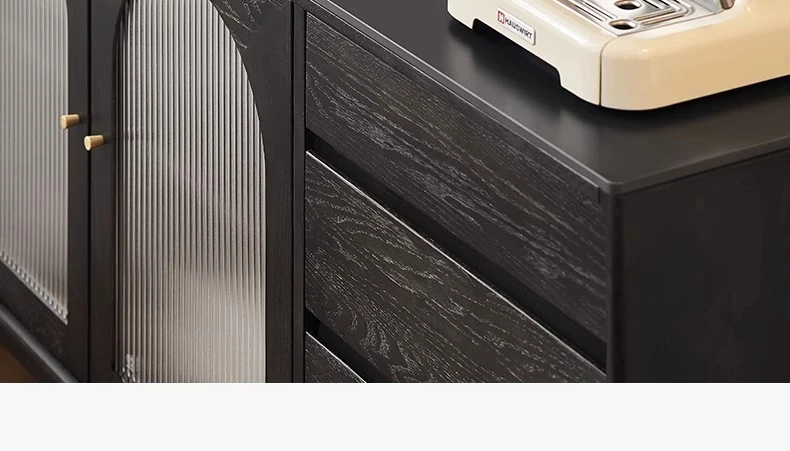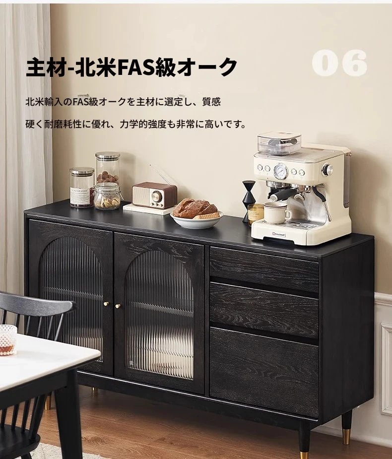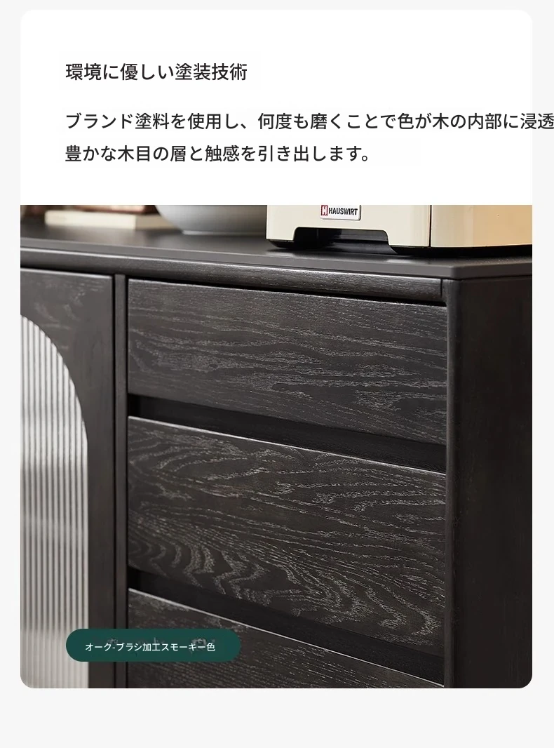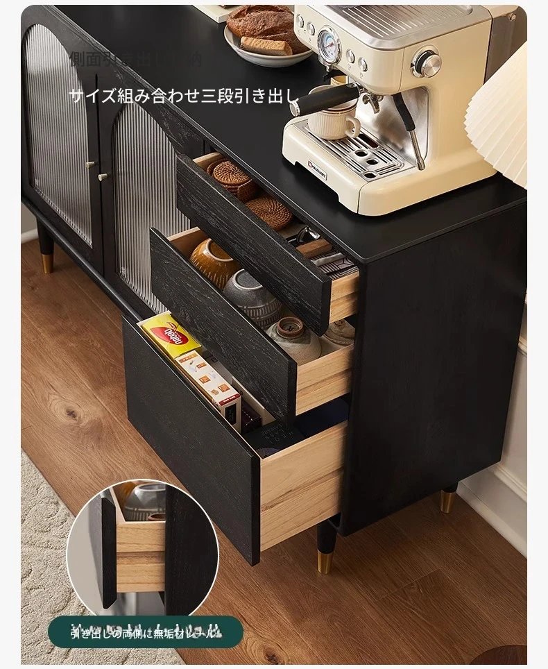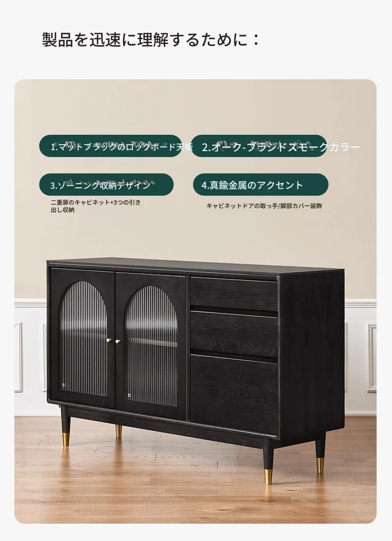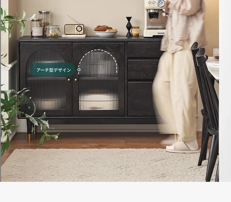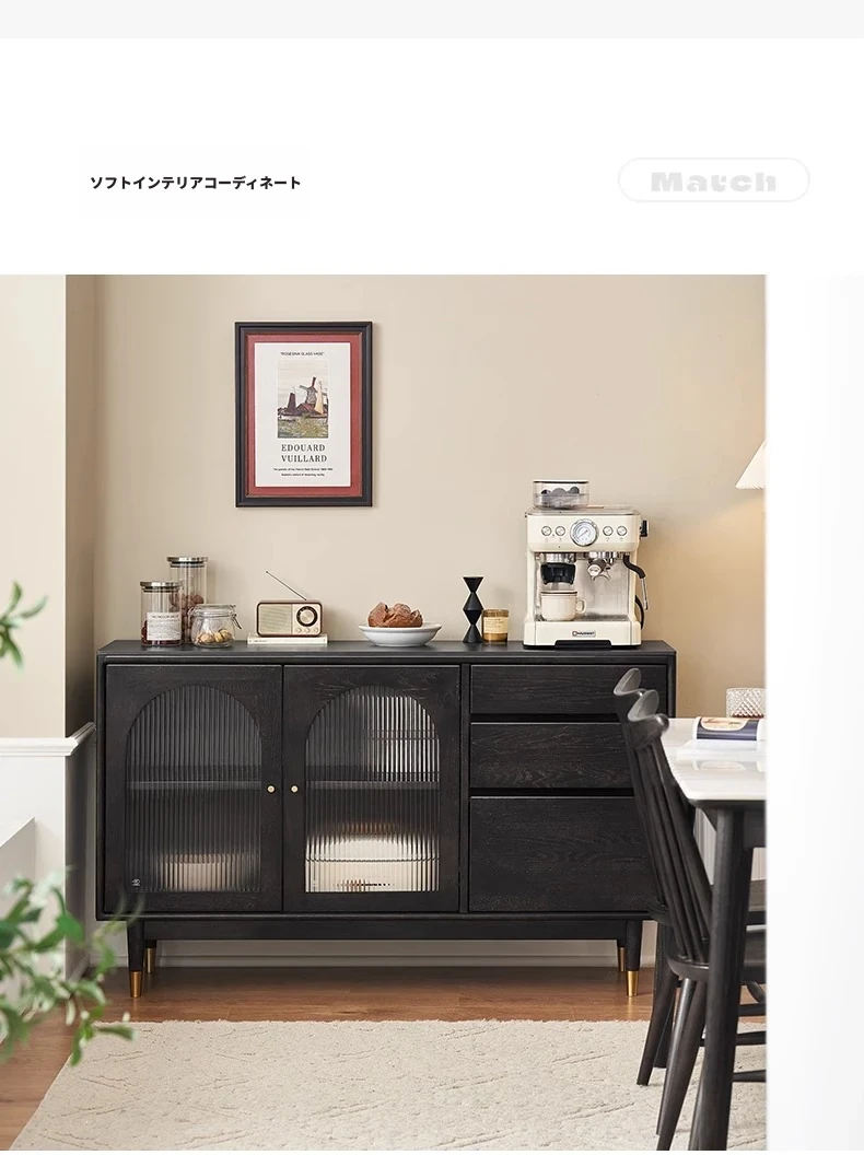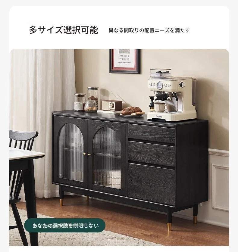 オリジナルエレメント無垢材ダイニングサイドキャビネット - ウォール一体型オーク収納キャビネット、軽やかなラグジュアリー感のあるブラックストレージキャビネット、ティーウォーターステーションに最適!
