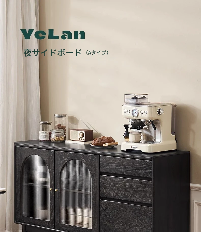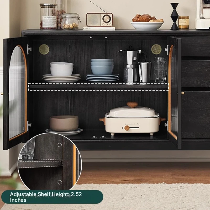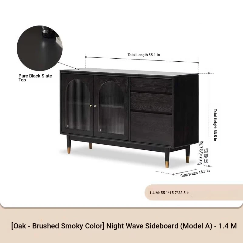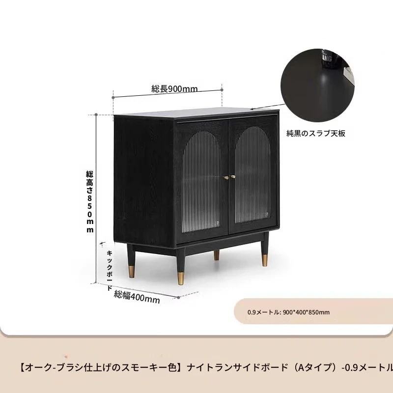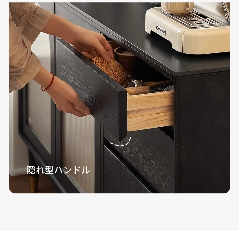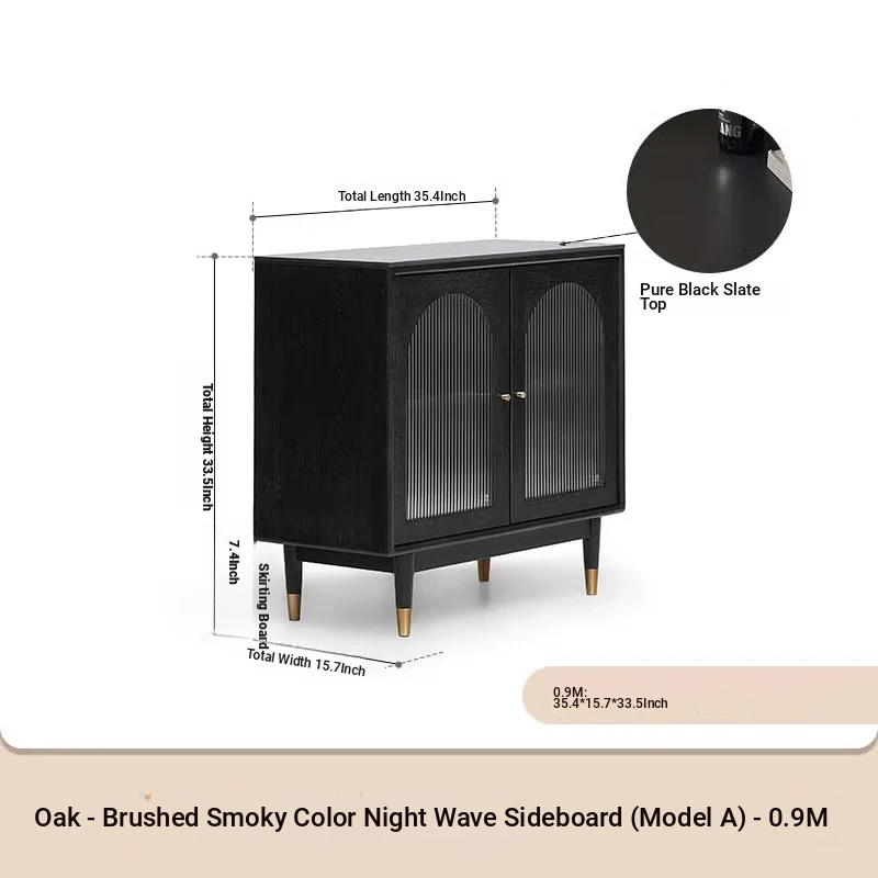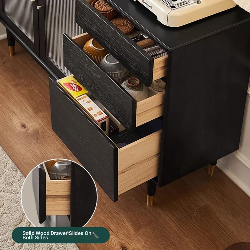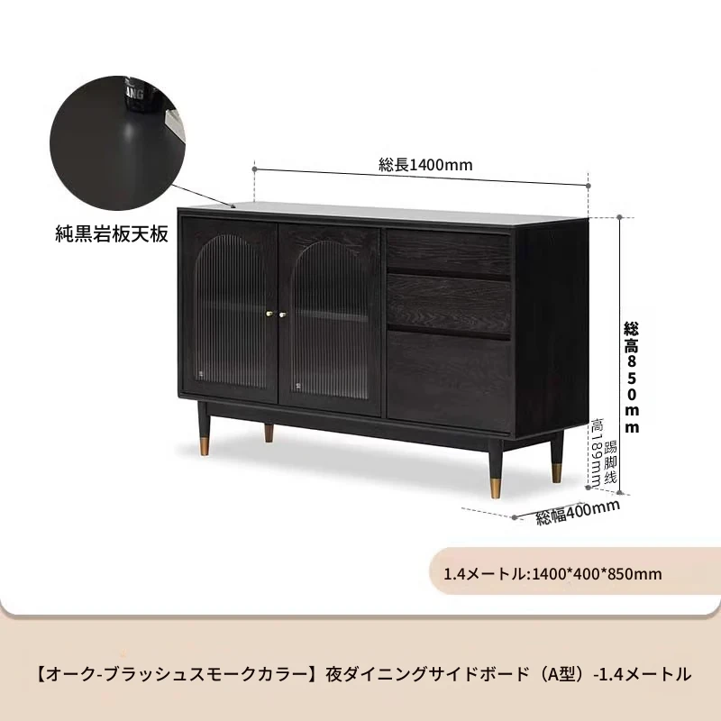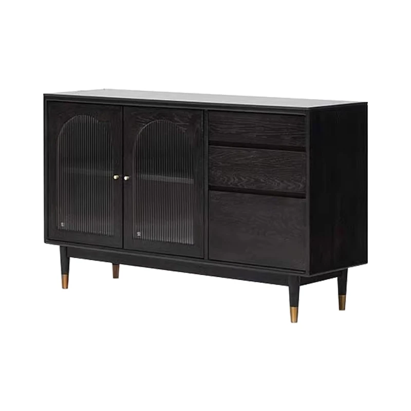 オリジナルエレメント無垢材ダイニングサイドキャビネット - ウォール一体型オーク収納キャビネット、軽やかなラグジュアリー感のあるブラックストレージキャビネット、ティーウォーターステーションに最適!