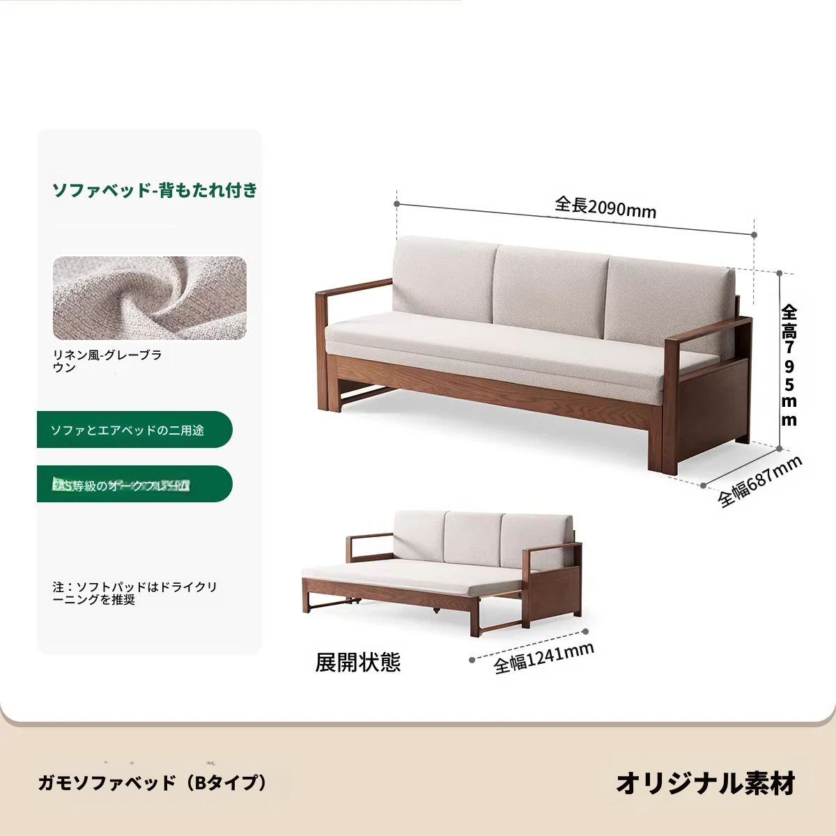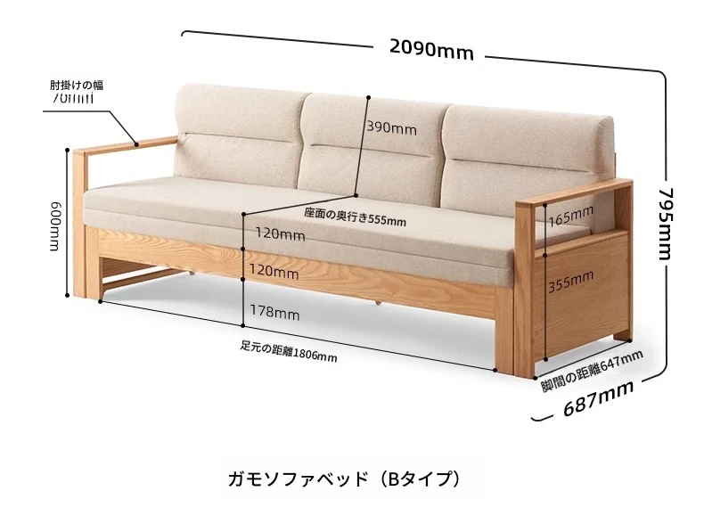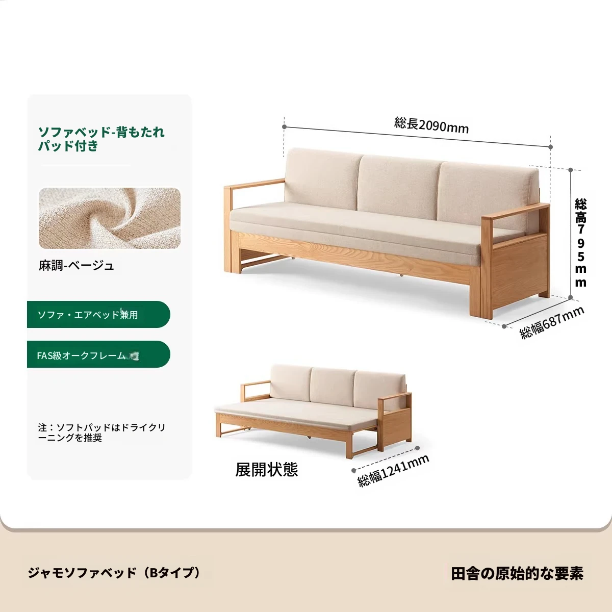 【オーク-ナチュラルカラー】ジャモソファベッド(B型)-(ベージュクッション直背もたれ付き) 2090*687/1241*695