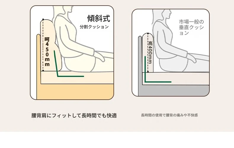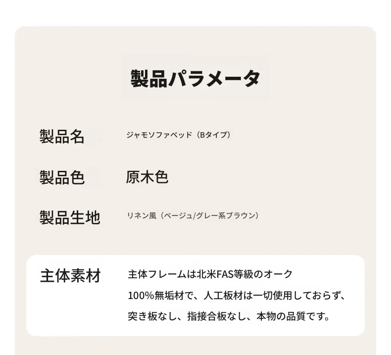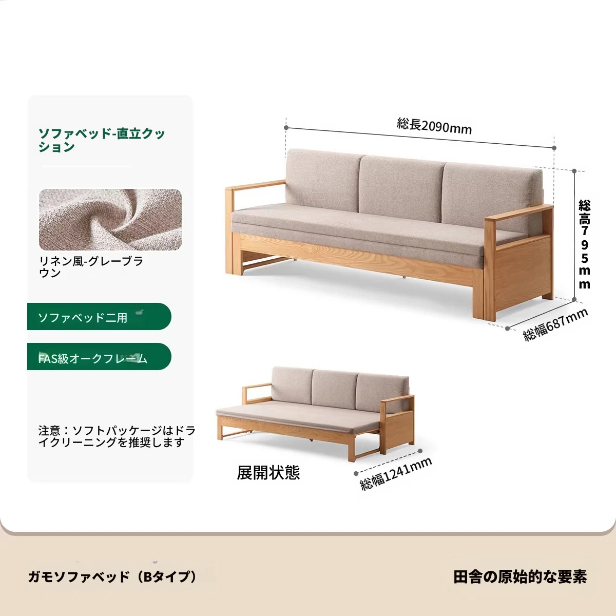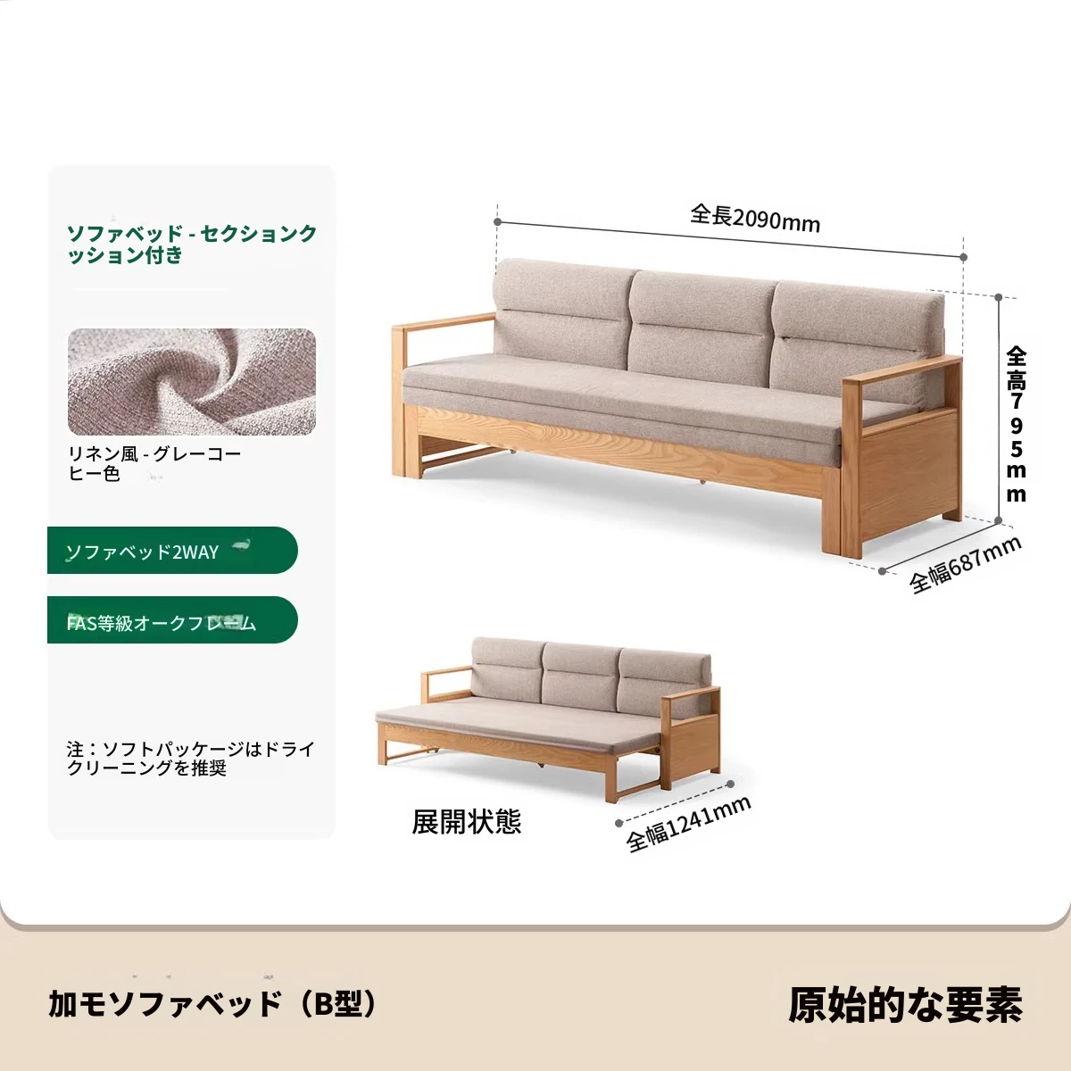 【オーク-ナチュラルカラー】ジャモソファベッド(B型)-(ベージュクッション直背もたれ付き) 2090*687/1241*695