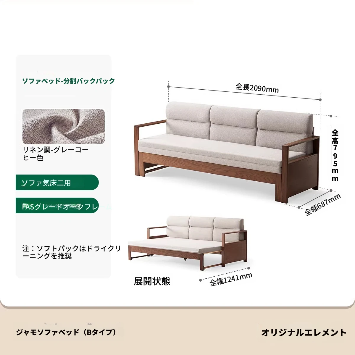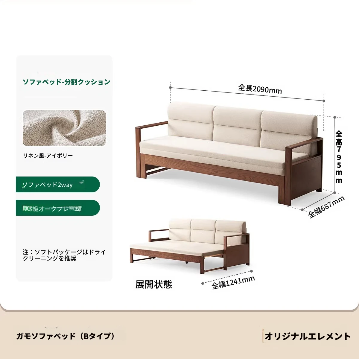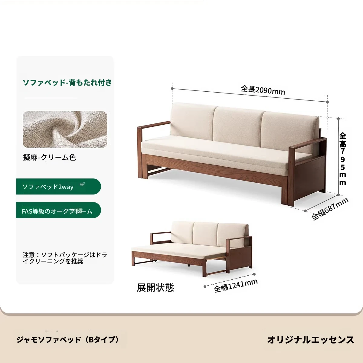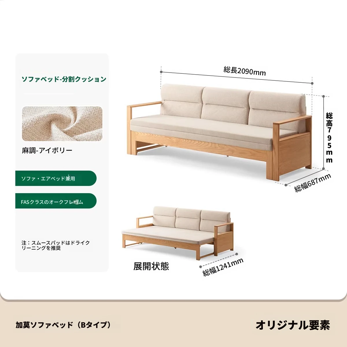 【オーク-ナチュラルカラー】ジャモソファベッド(B型)-(ベージュクッション分割背もたれ付き) 2090*687/1241*695