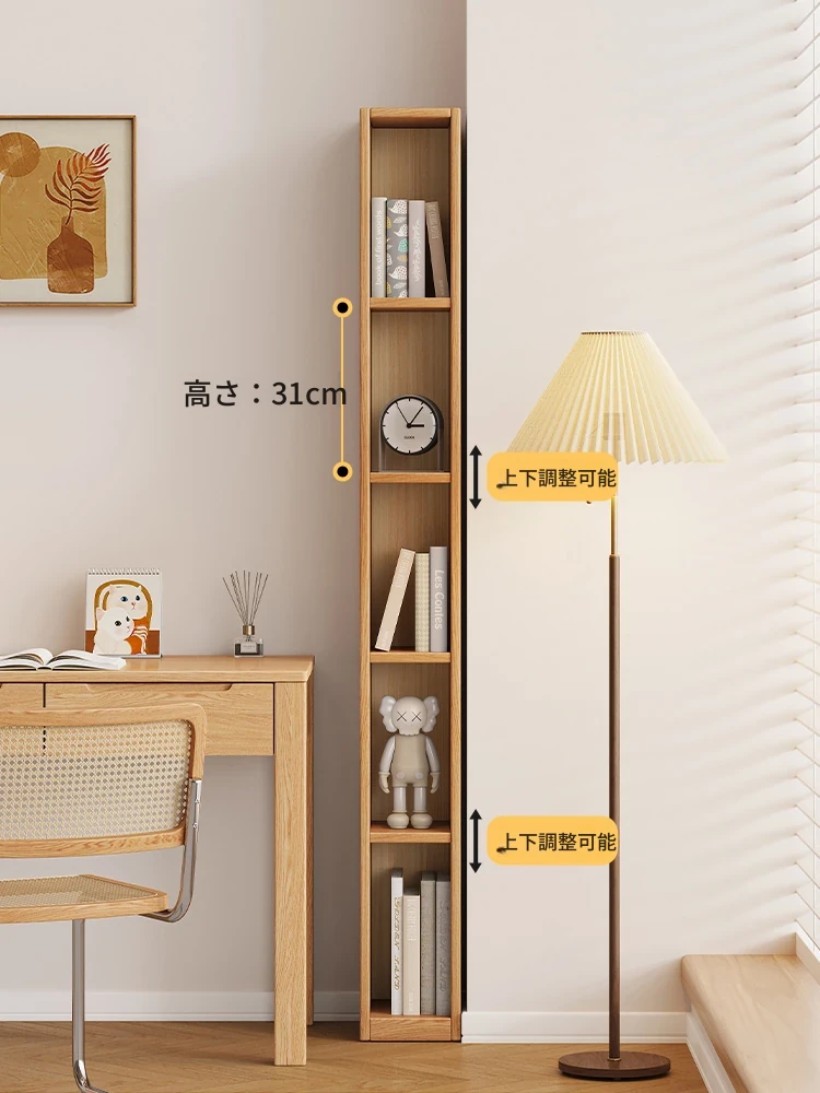 全実木製書棚 家庭用スリムフロアブックシェルフ 北欧スタイルのオーク材オープンシェルフ 隙間収納に最適な収納ラック