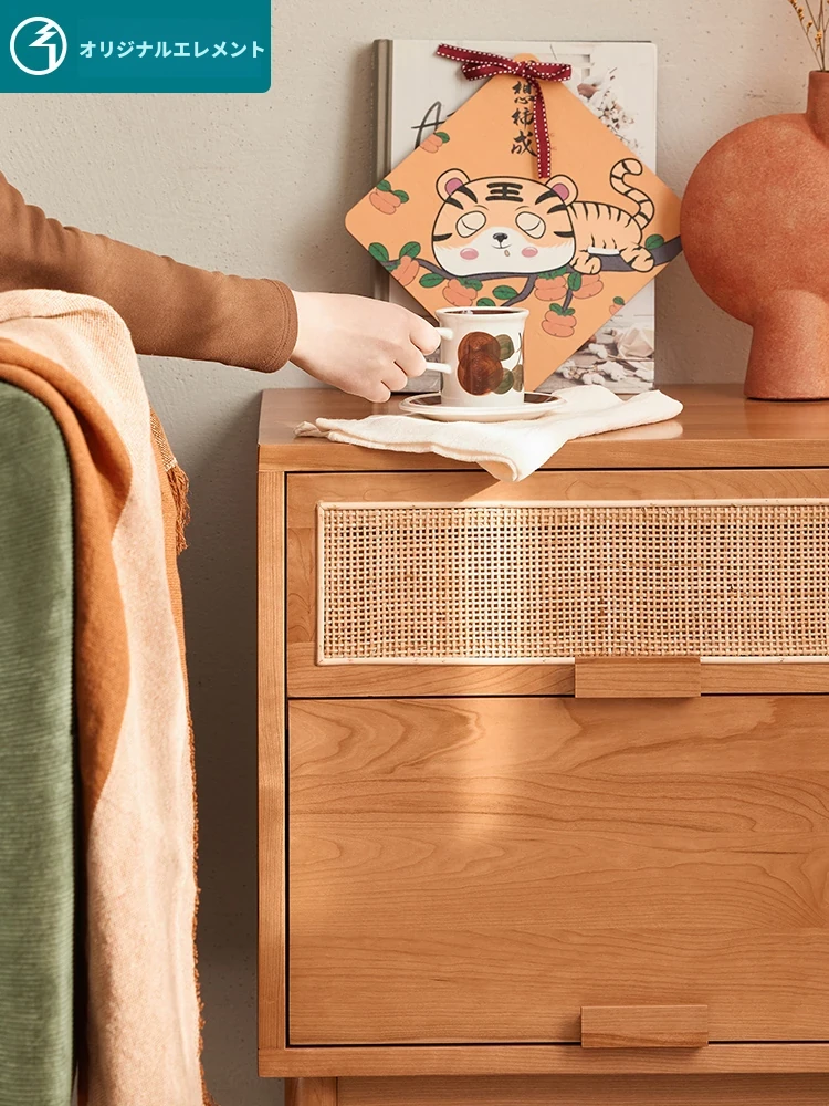 オーガニック無垢材使用!北欧風シンプルデザインのチェリーボードナイトスタンド。和風ラタン編み収納キャビネット付きで、おしゃれで機能的な寝室を演出。