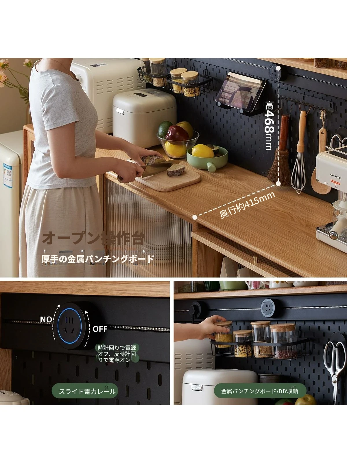 オリジナルエレメントの無垢材サイドキャビネット - 橡木製の一体型ハイキャビネット。ティーサーバーや収納に最適な食器棚・家庭用ワインキャビネットとしてお使いいただけます。美しいデザインで、空間をスタイリッシュに演出!