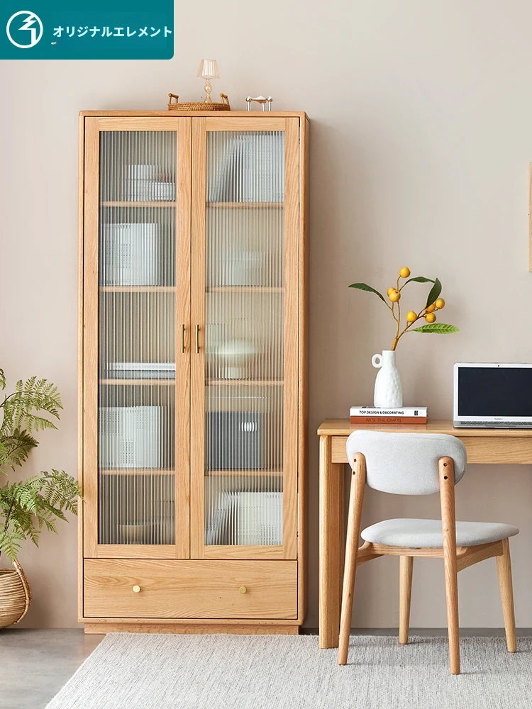 北欧スタイルの無垢材書棚|モダンシンプルなオーク製ストレージ|天然木製のスタンド式ブックシェルフ|ガラス扉のディスプレイキャビネットでおしゃれに収納!
