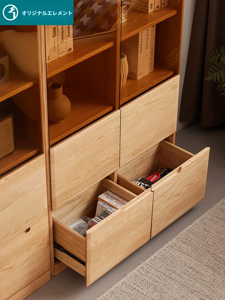 原始エレメント無垢材オールウッド書棚 北欧スタイルのオークダブルドア本棚 小型住宅に最適な書斎家具 家庭用収納書庫で、おしゃれで機能的な空間を演出!