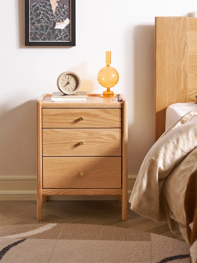 オリジナルエレメント無垢材ベッドサイドテーブル | スリムデザインのモダンナチュラル | オーク製収納引き出し3段 | スペースを有効活用!シンプルで洗練された寝室にぴったりのアイテムです。