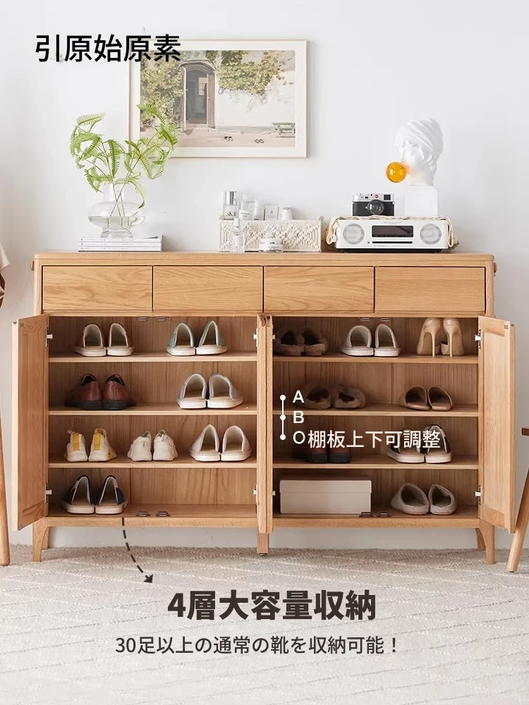 全無垢材の北欧風シューズキャビネット - 4ドアのオーク収納庫、シンプルでスタイリッシュな和風原木玄関収納、家庭にぴったり!